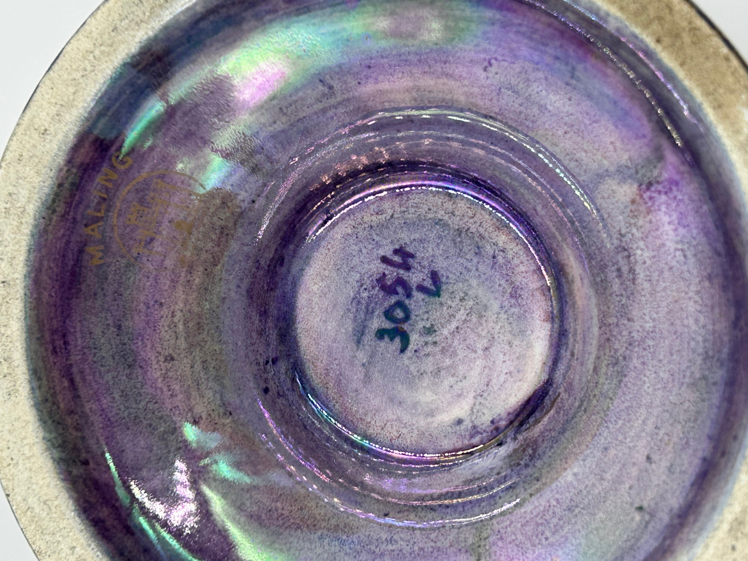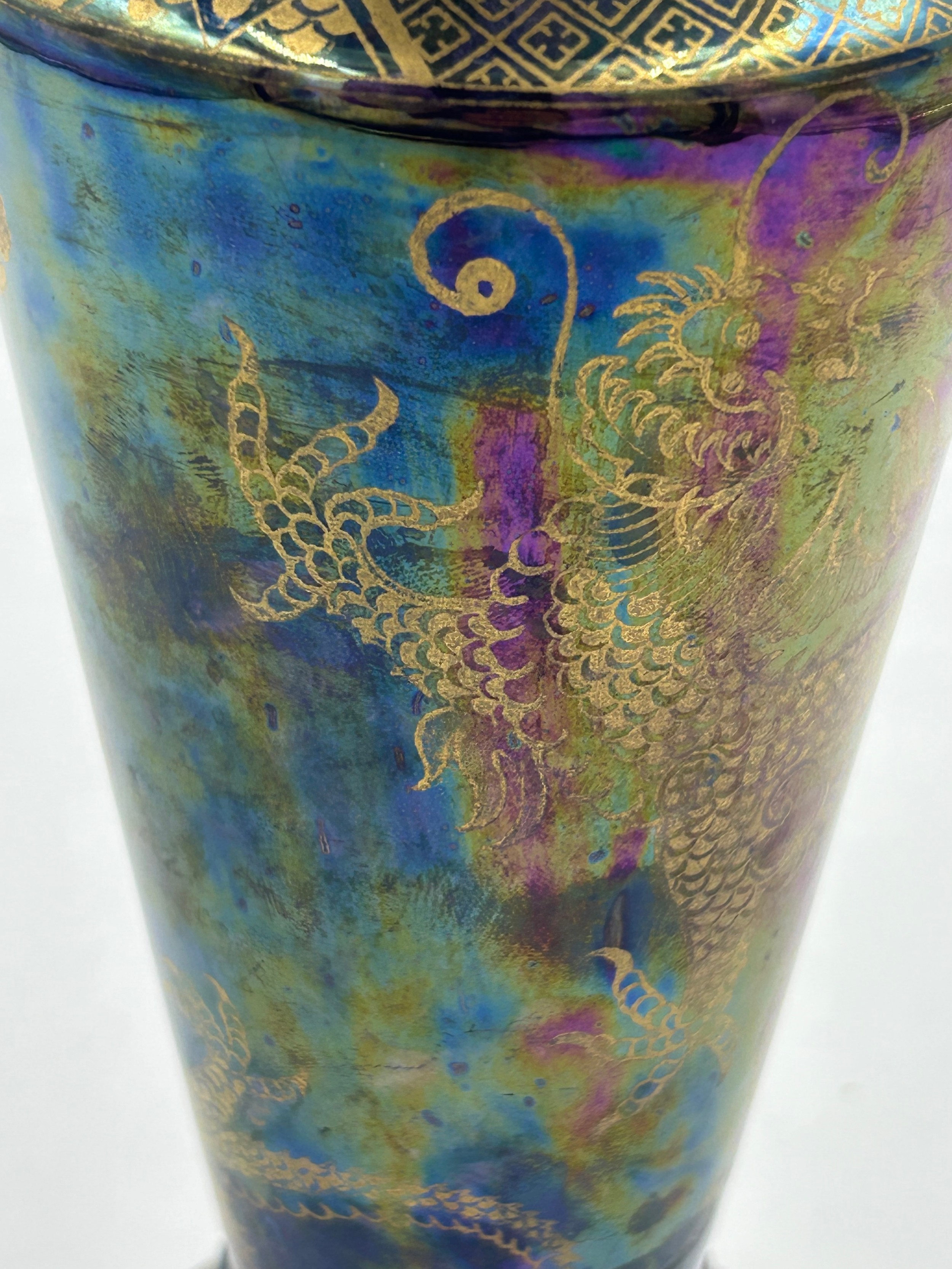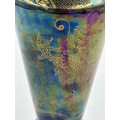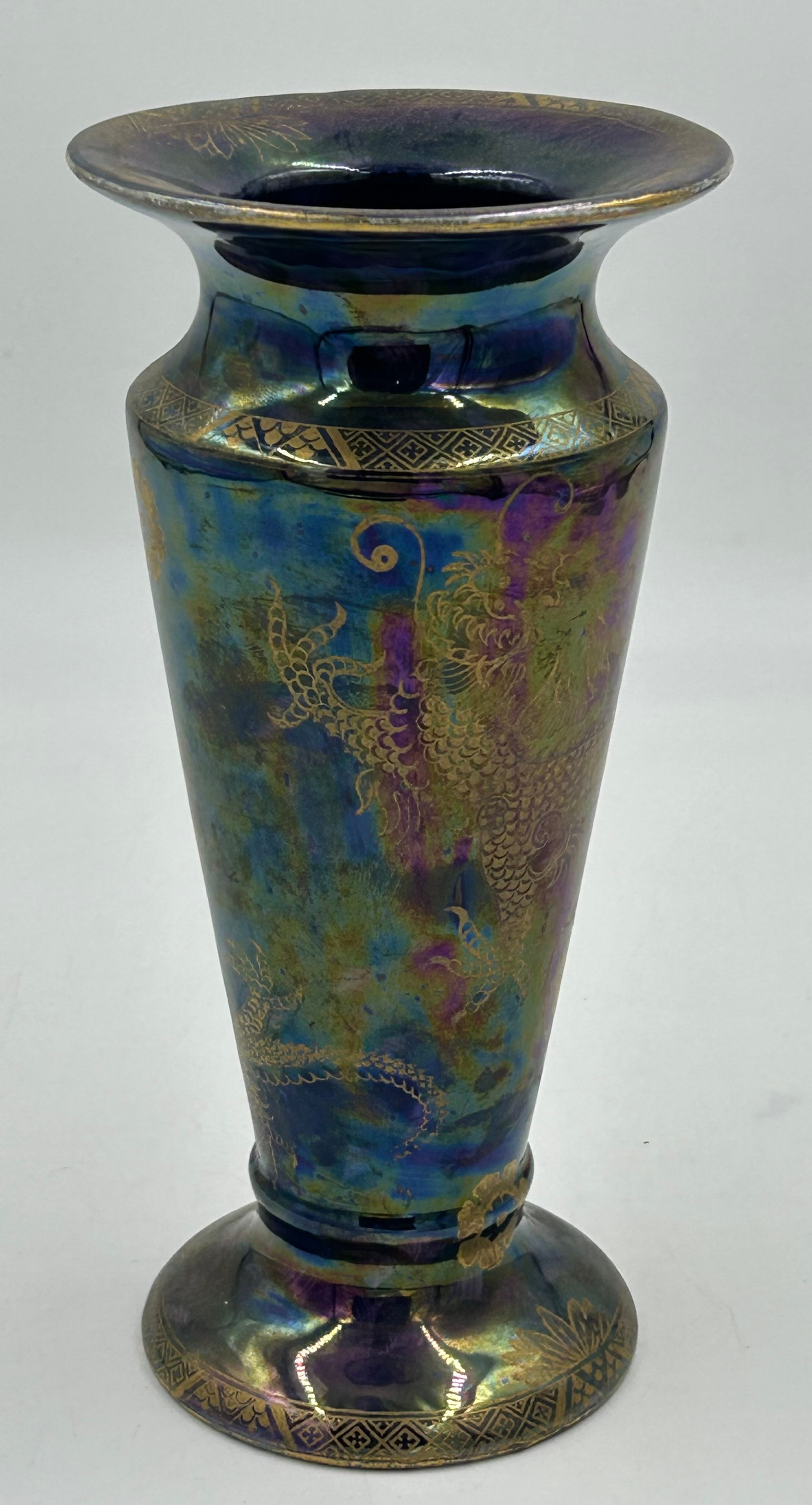 A pair of Royal Doulton stoneware Sleeve Vases, decorated with 'Tube lined' designs 32cm with impressed mark to base 6462 together with Maling vase decorated with dragons and flowers on a purple iridescent background with 3054L to base 22cm and a white Staffordshire Dog. (4).
