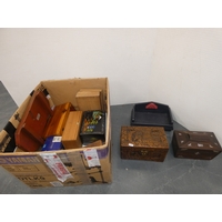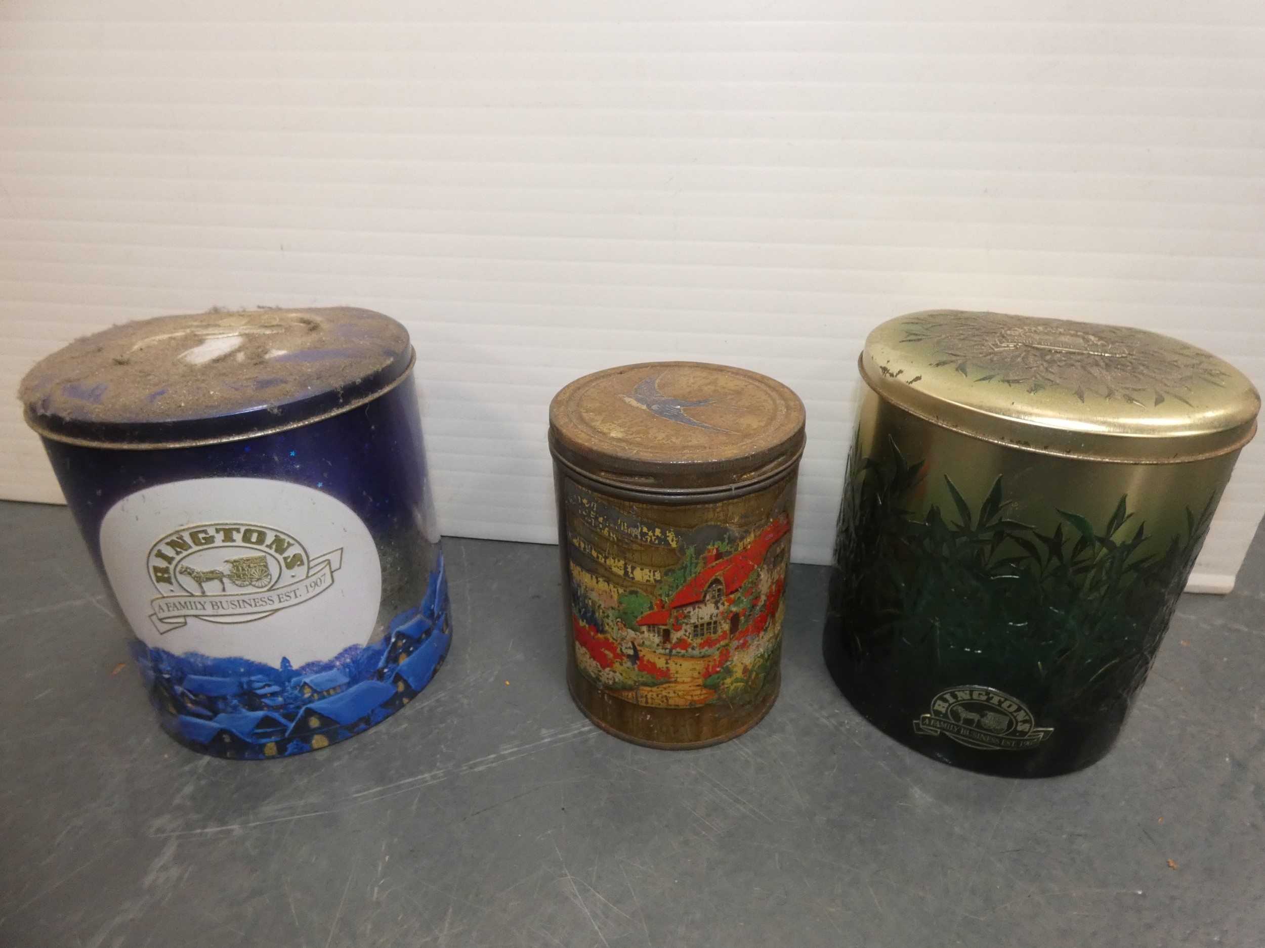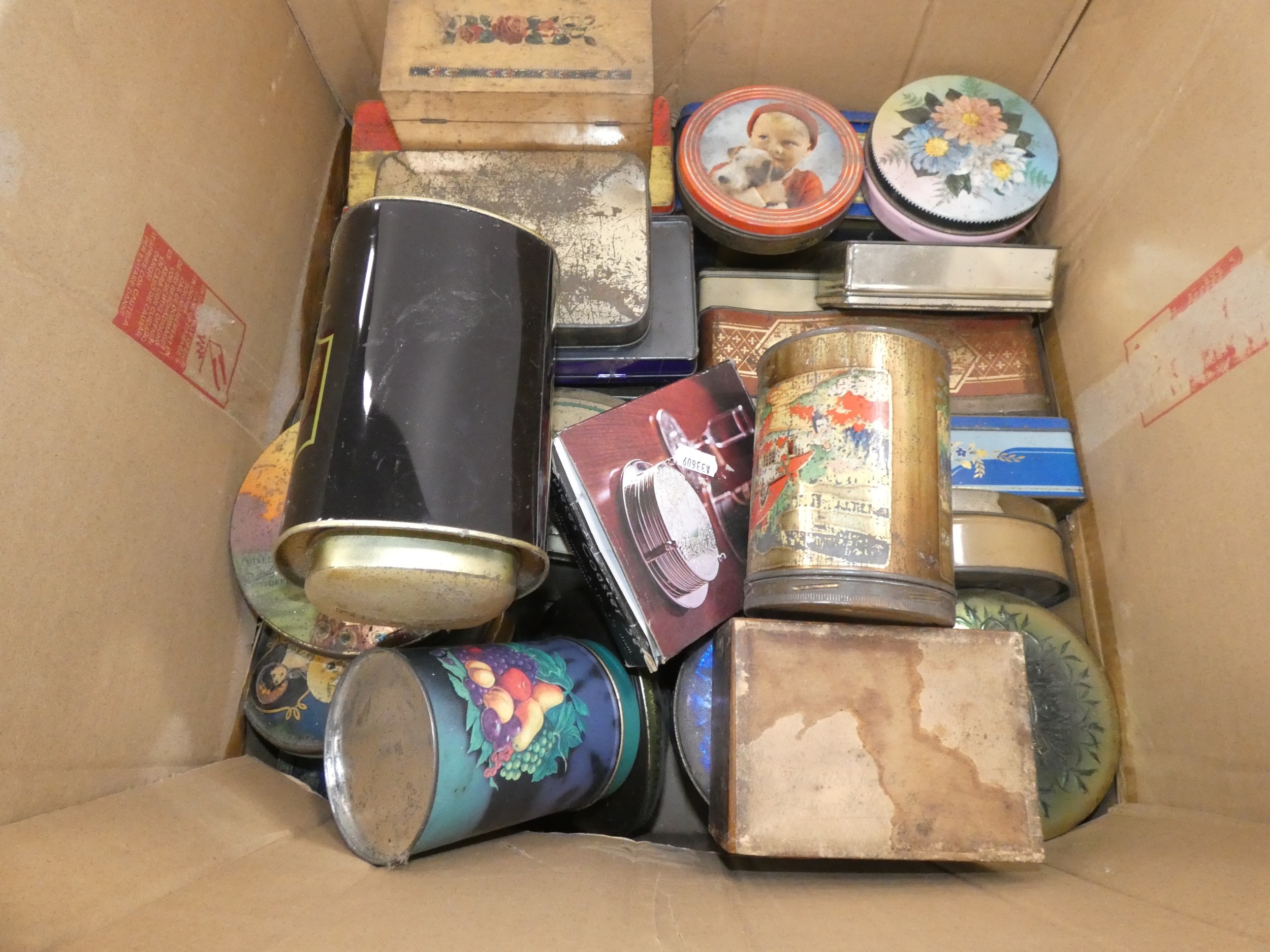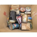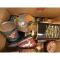 Large carton containing tins to include Rington's Tea, Danish toffee, also a set of coasters etc.