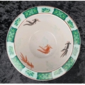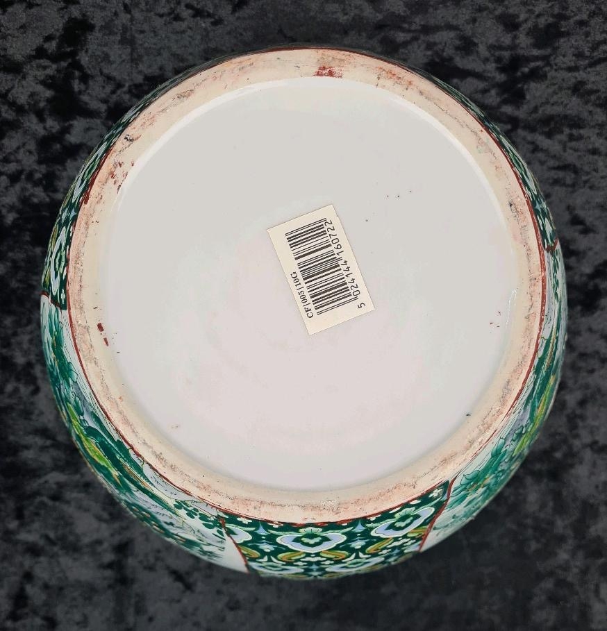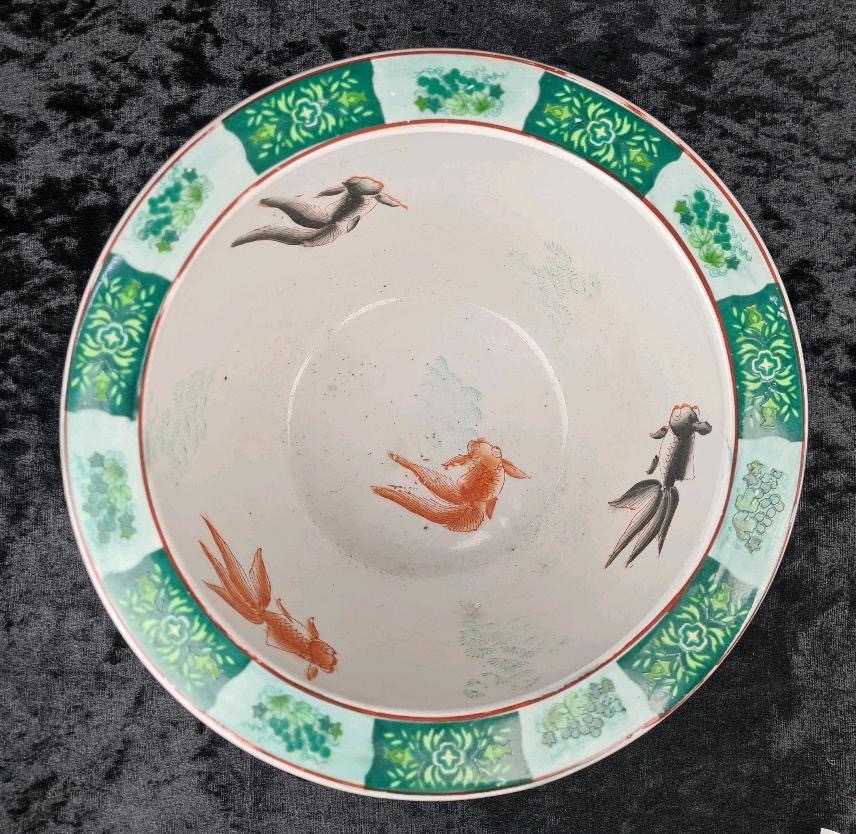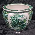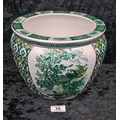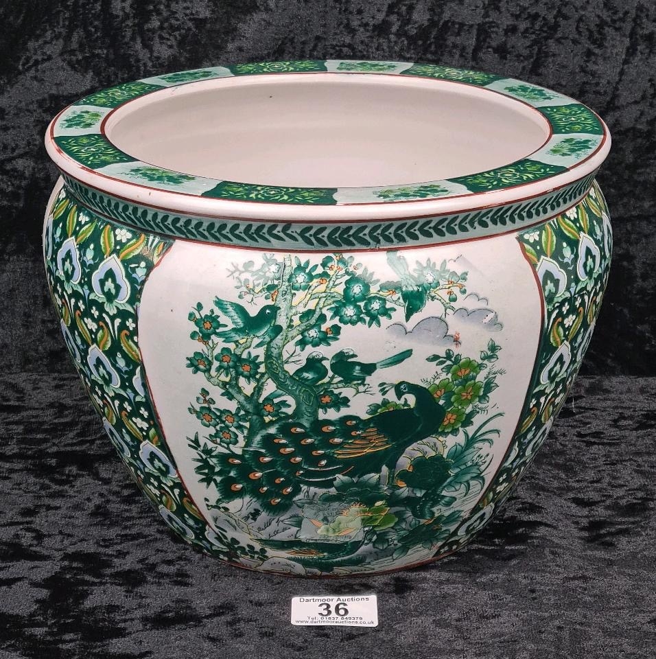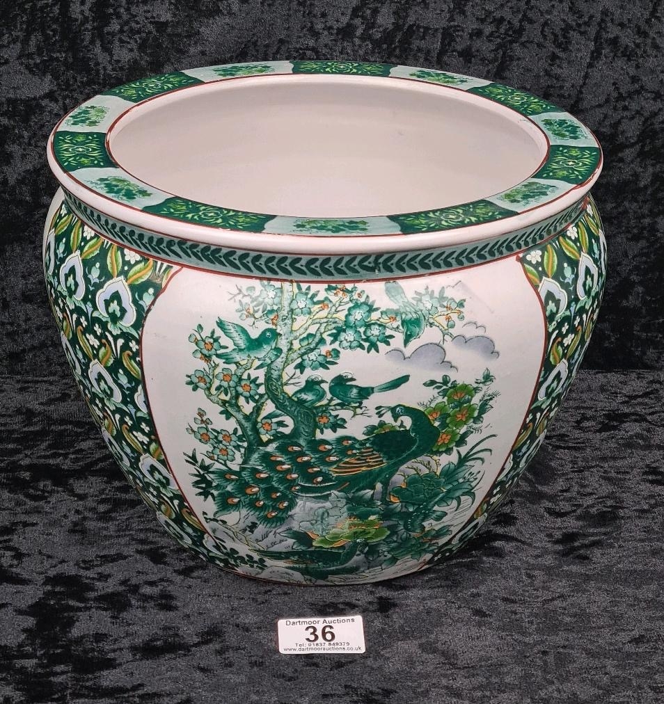 Chinese pot / jardiniere with a peacock motif, and orange and green fish painted on the inside. Approx H20 x Dia26cm.