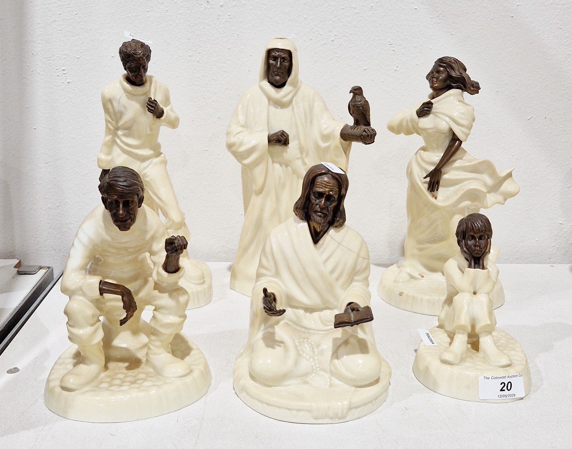 Collection of Minton bone china bronzed figures, printed blue factory marks, circa 1970's, comprising: Spellbound, Travellers Tales, The Sage, Sea Breezes, The Sheik and the Fisherman, tallest 24.5cm high (some cracking (6) (please note VAT will be payable on the hammer)