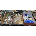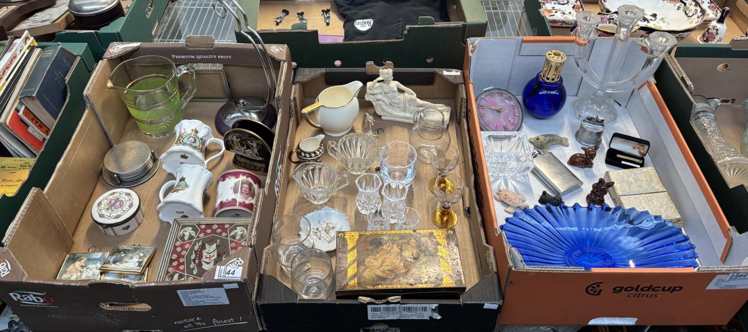 3 Boxes containing Royal memorabilia, glass candelabra and an agate clock