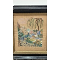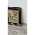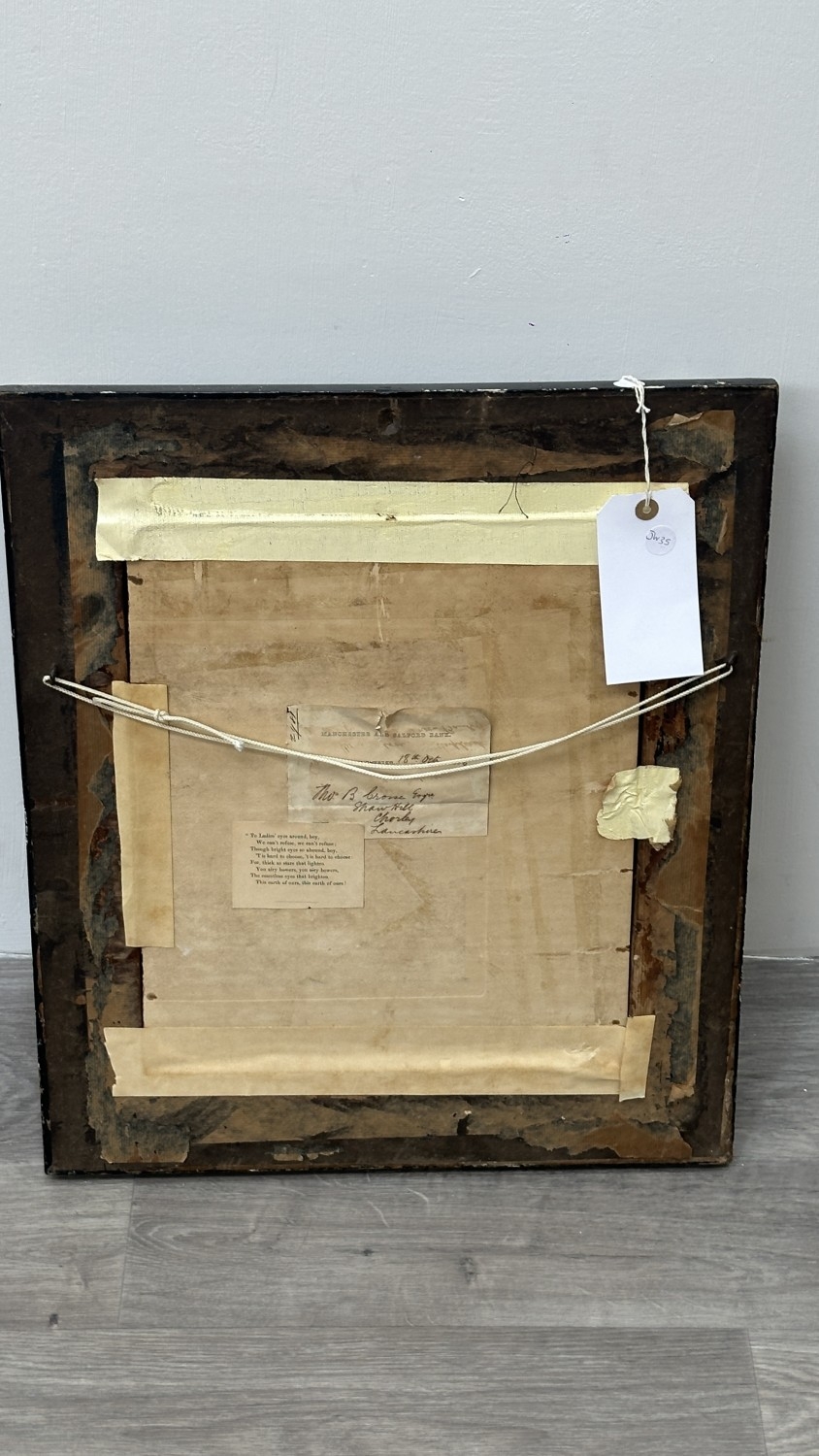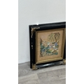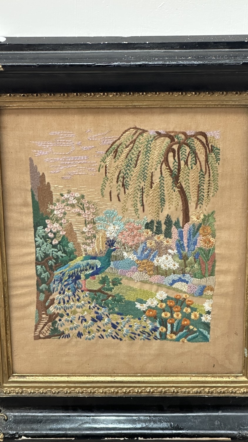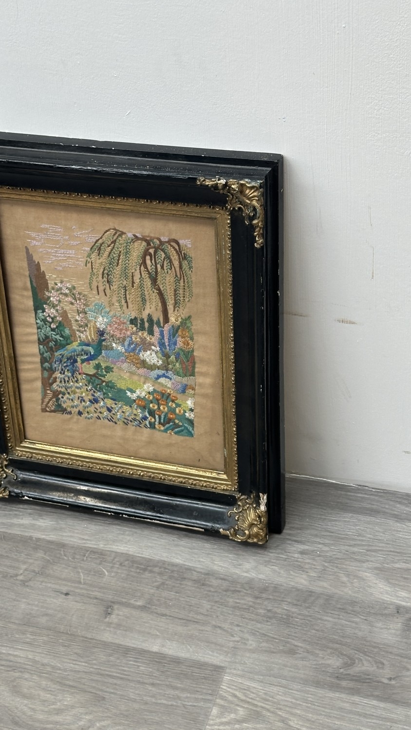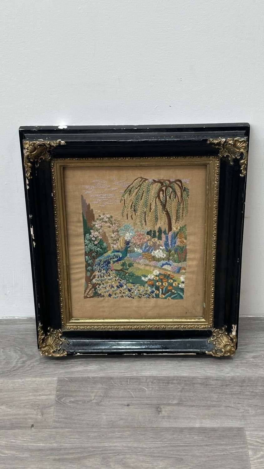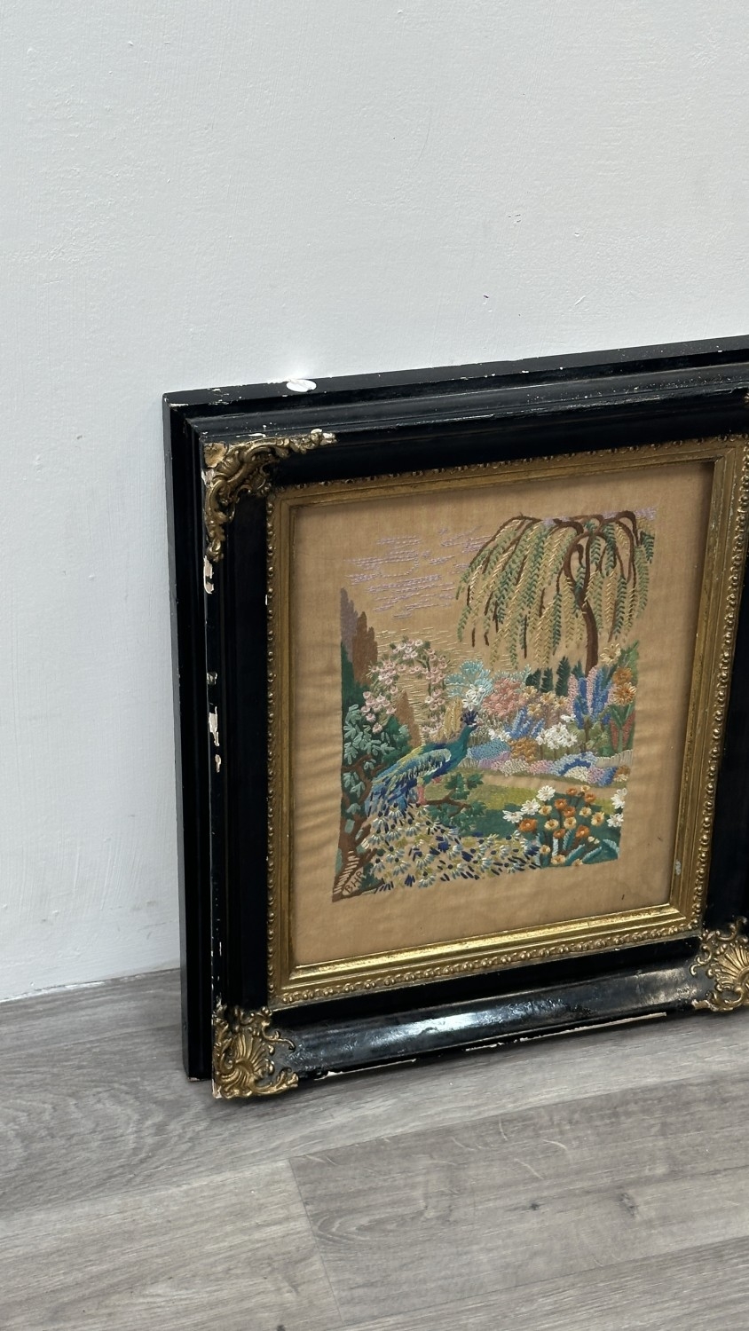 A Victorian gilt and black lacquered framed embroidery depicting a peacock - approx. 54cm high x 47cm wide
