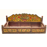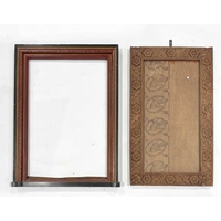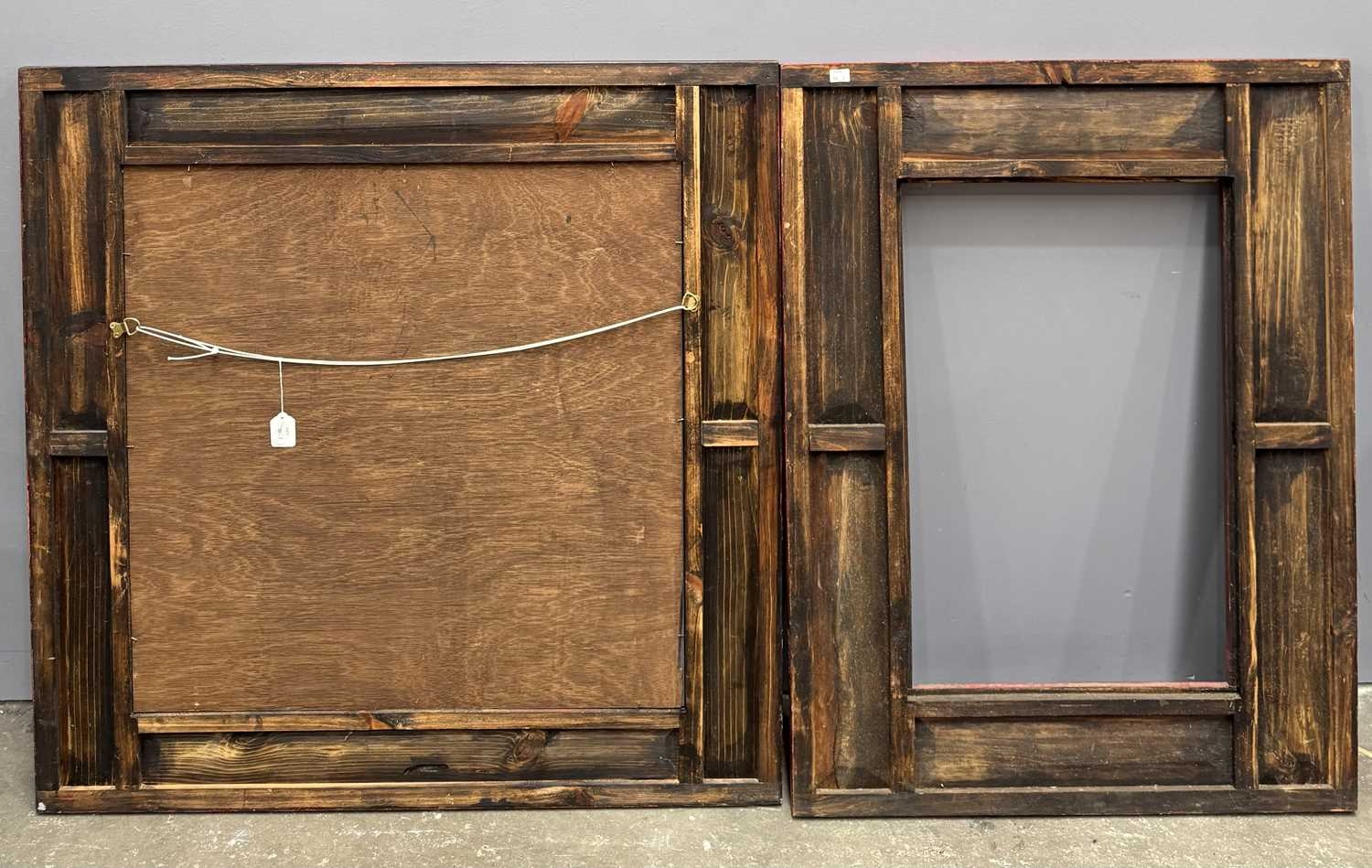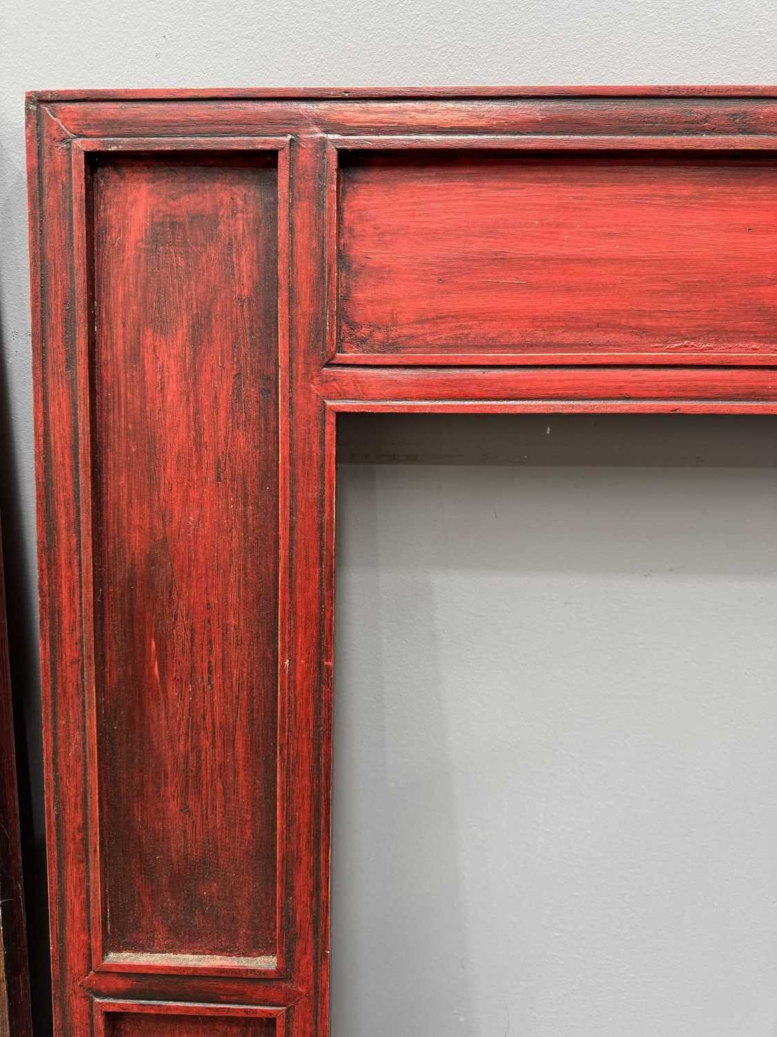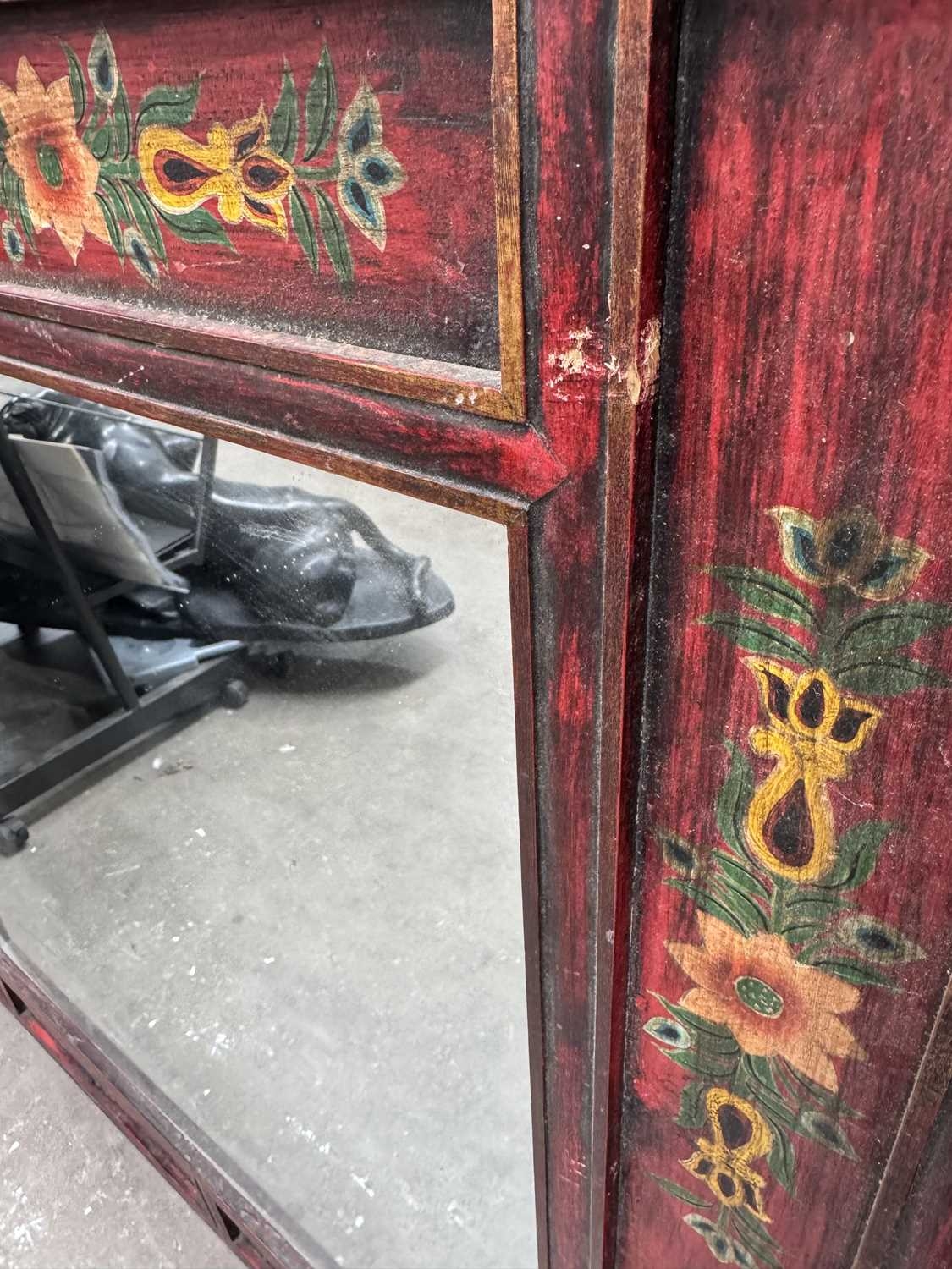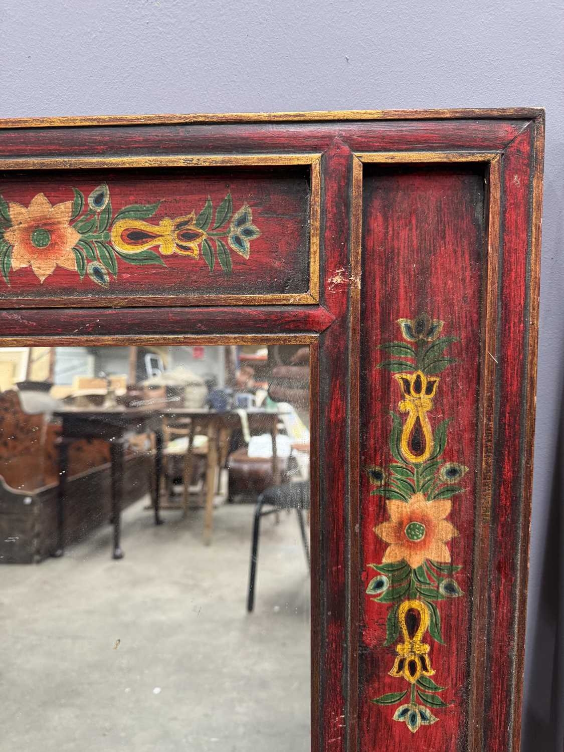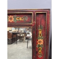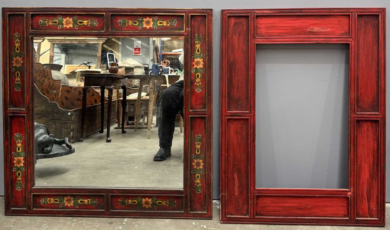 A contemporary Tibetan mirror, panelled wood frame painted with floral motifs, 102 by 102cm, together with a panelled red frames, 101 by 76cm (2)