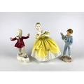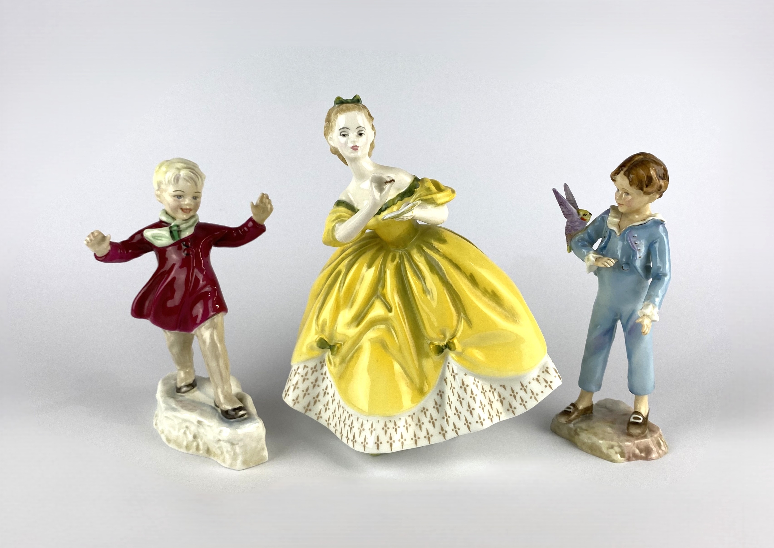 Two Royal Worcester porcelain figures 'Parakeet' and 'January', modelled by F.G. Doughty, 3087 and 3452 (one AF), together with a Royal Doulton figure 'The Last Waltz', Rd No 449/65, height 21cm (3)
