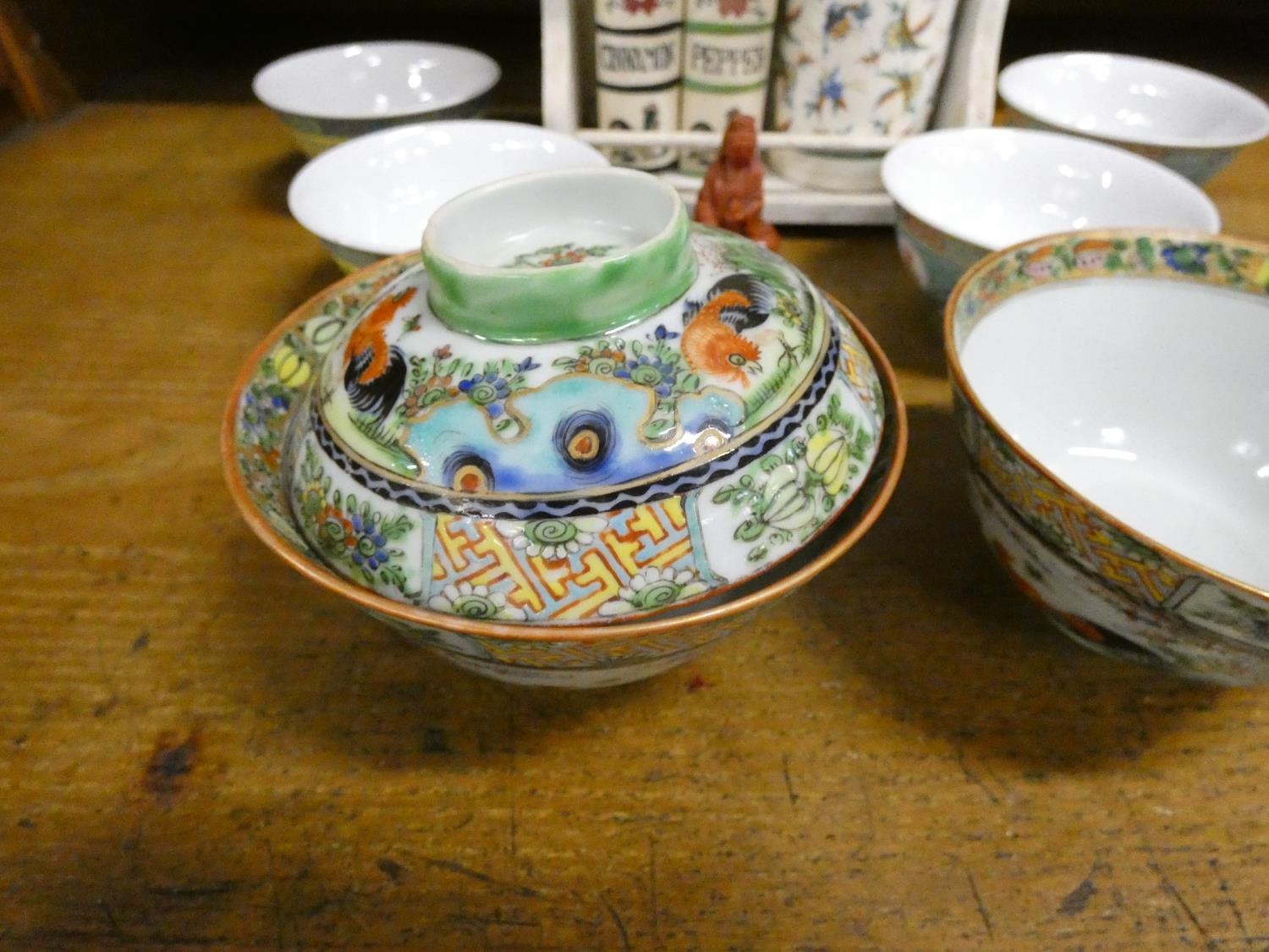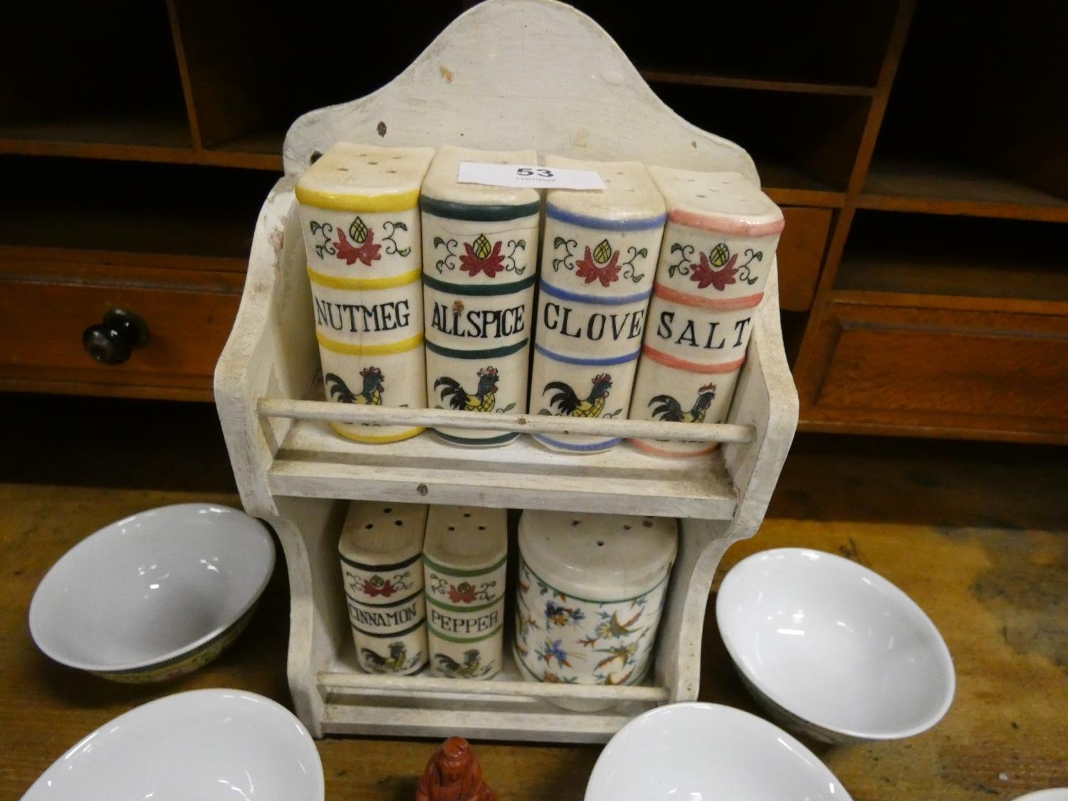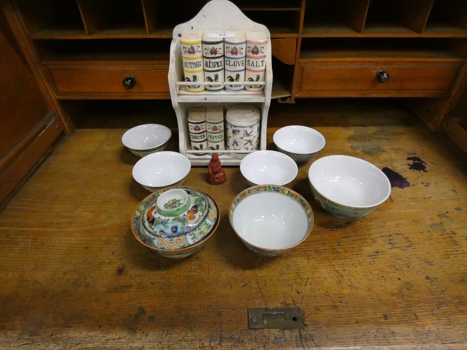 Spice rack and Oriental bowls.
