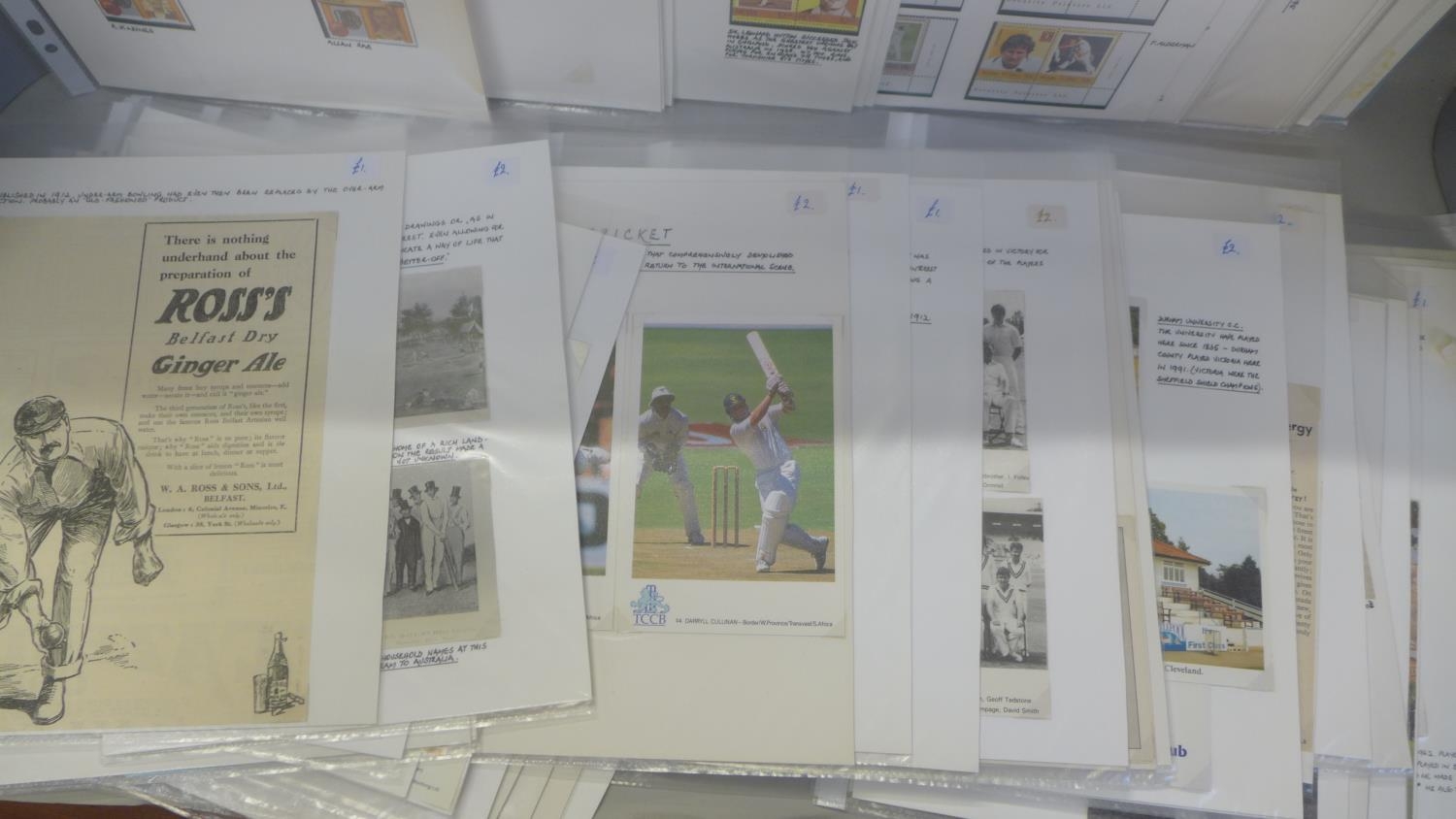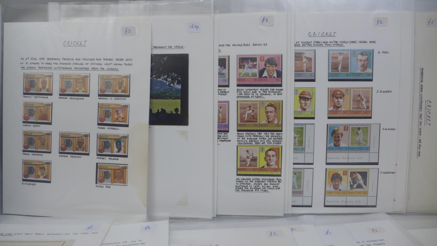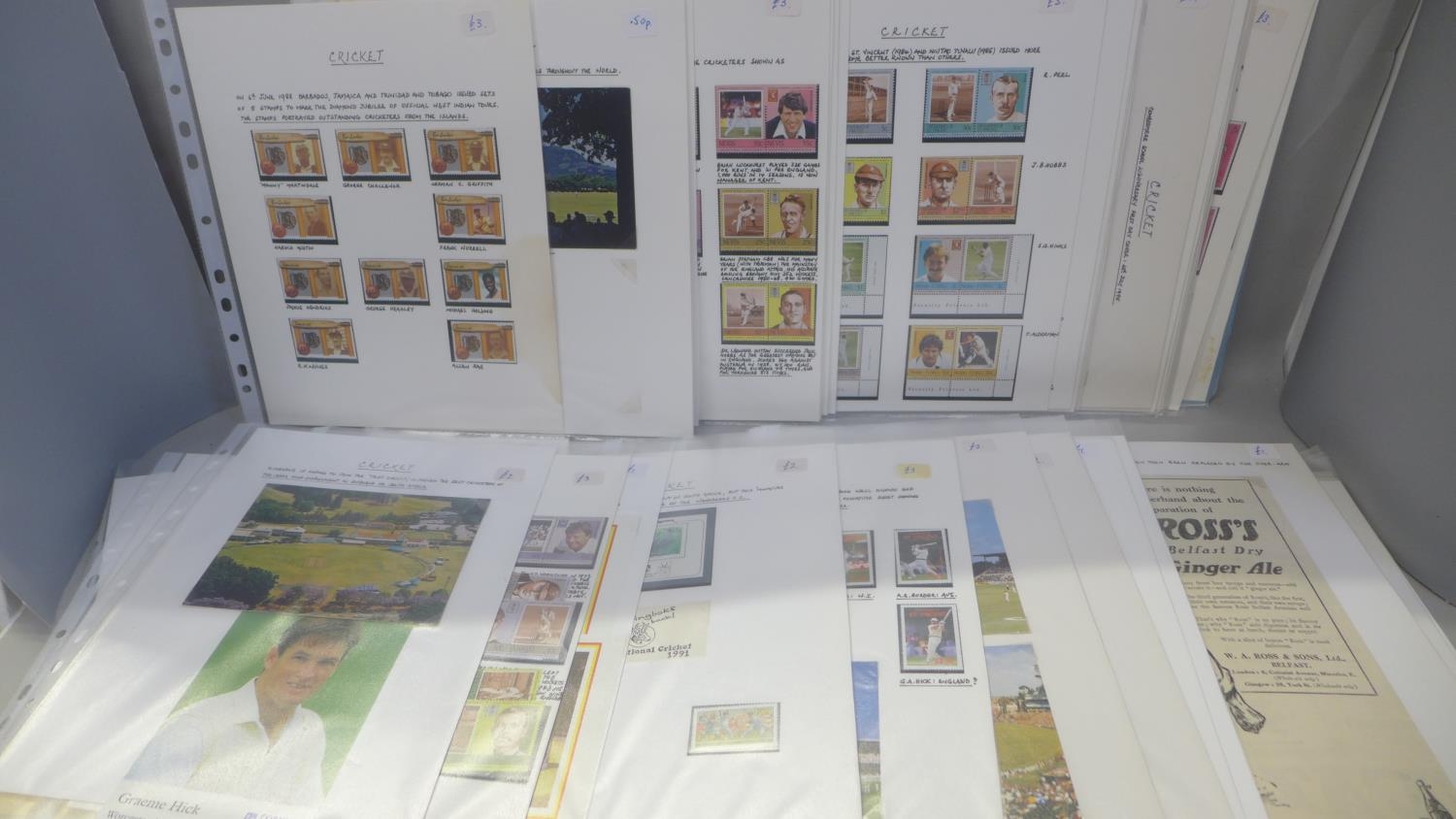 A collection of sporting stamps, postcards, ephemera etc., mostly cricket
