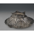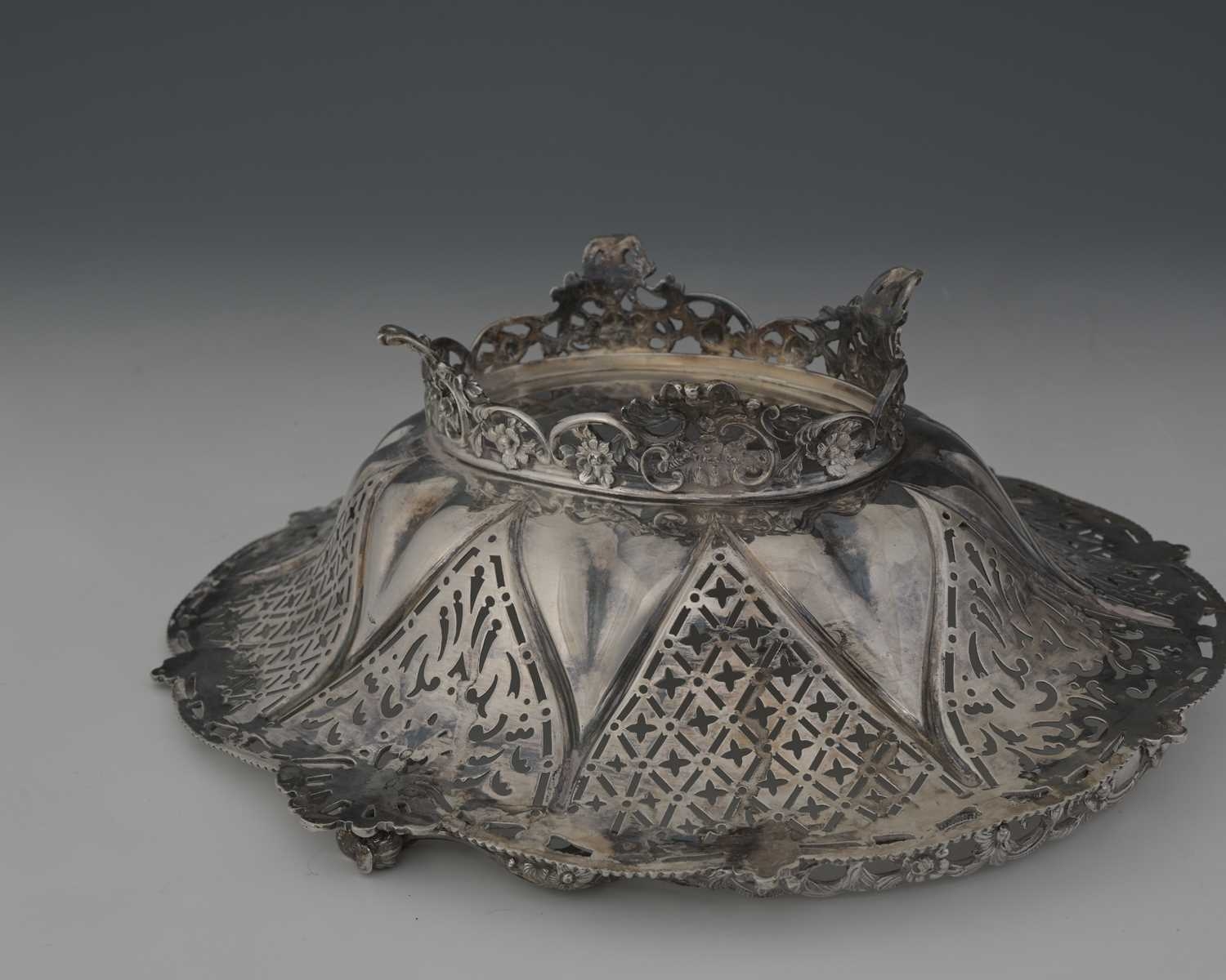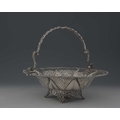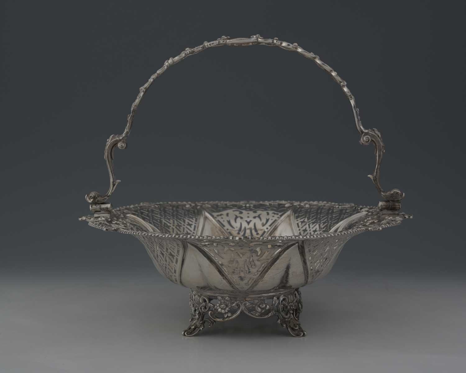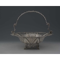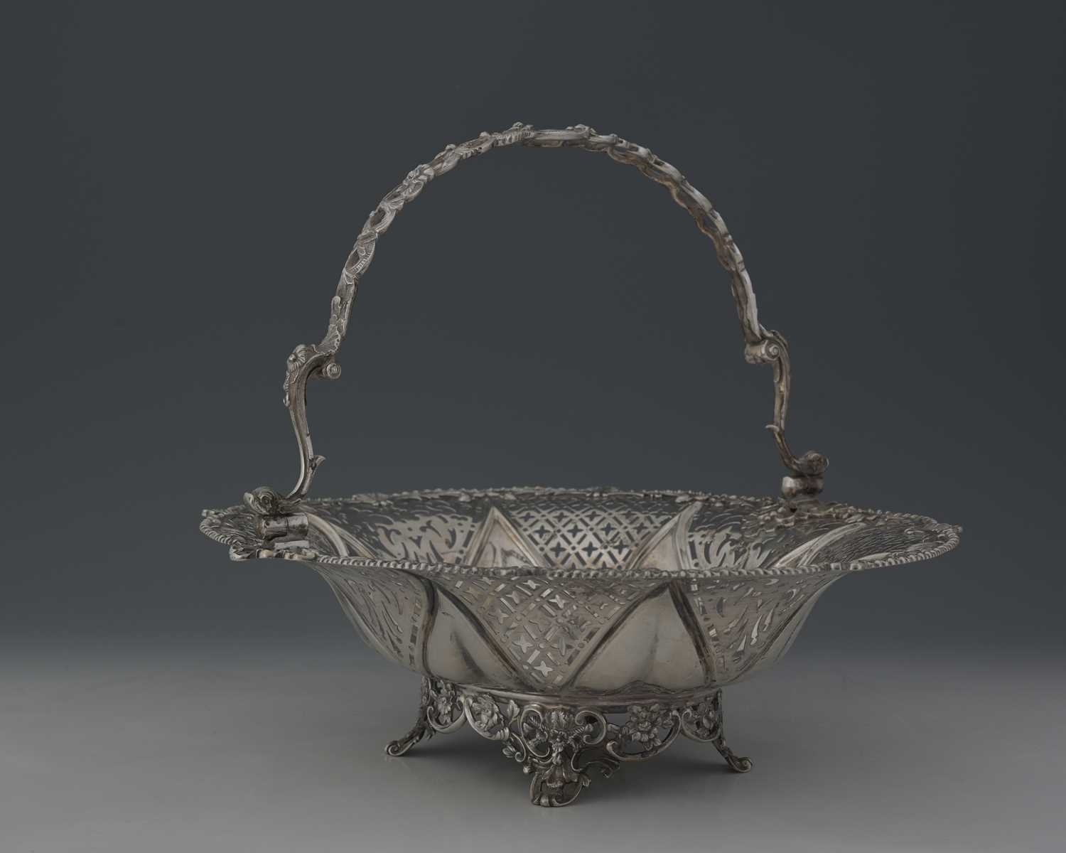A nineteenth-century plated cake or bread basket, modelled in the eighteenth-century style, the pierced body decorated with Rococo shells and scrolls, atop four bracket-form feet, similarly pierced and decorated, with swing handle, apparently unmarked, width 36.9cm, height with handle raised 30cm approx
