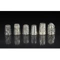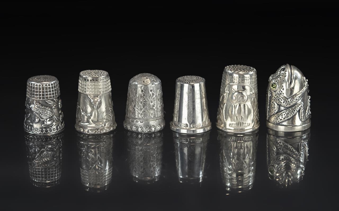 Excellent Collection of Antique and Vintage Sterling Silver Thimbles, six in total, various hallmarks and makers, 1/ 'Owl' thimble, marked 925, 2/ 'Large Frog' with glass eyes, hallmarked London 1910, 3/ 'Frog Among the Flowers', marked 925, 4/ 'Fawn in the Midst of Flowers', marked 925 silver, 5/ Plain silver thimble, maker HB & B, hallmark London 2000, 6/ Floral embossed decoration, hallmark Birmingham 1911 (6)