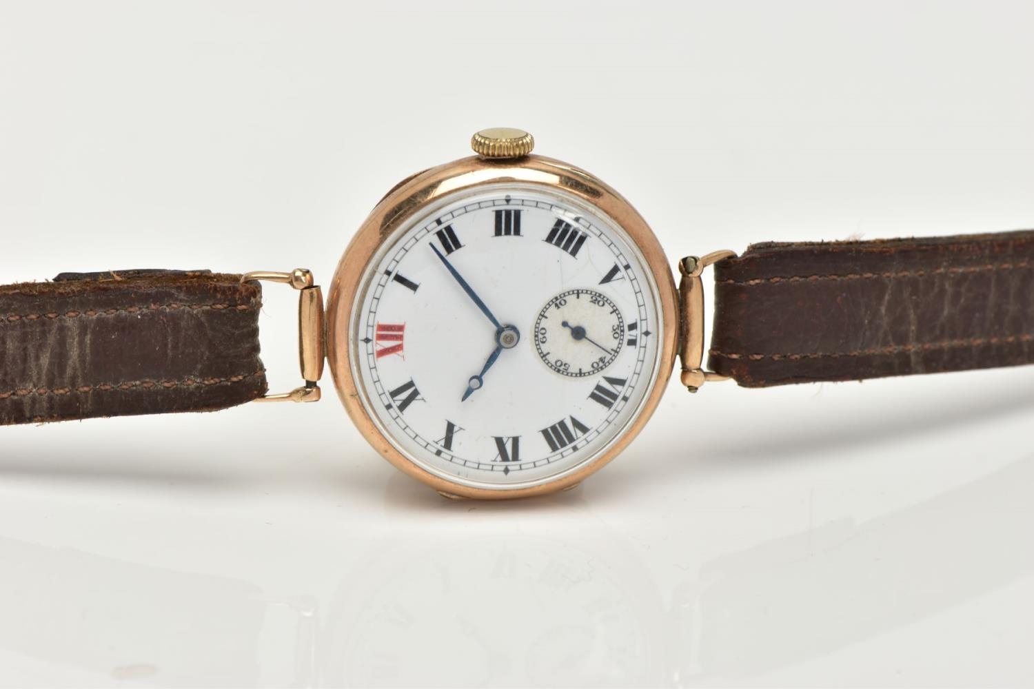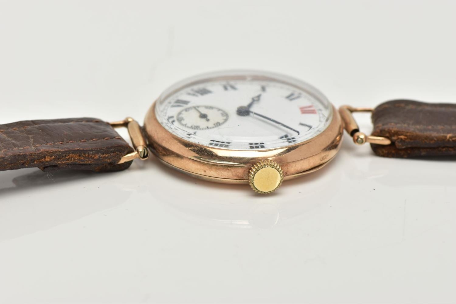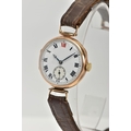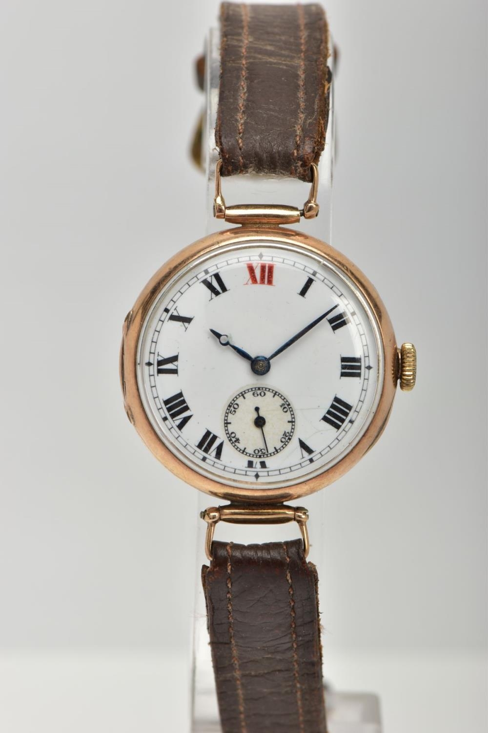 A 9CT GOLD GENTS WRISTWATCH, a hand wound movement, white dial, approximate width 32mm, Roman numerals, subsidiary seconds dial and the six o'clock position, blue hands, polished rose gold case, stamped 9 .375, inside case signed 1841530, hallmarked 9ct London 1920, fitted with a brown leather strap and gold tone buckle, approximate gross weight including strap 28 grams (condition report: general moderate wear, sets and winds, currently running, timekeeping not tested)