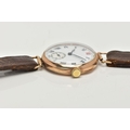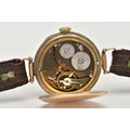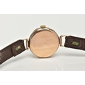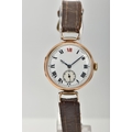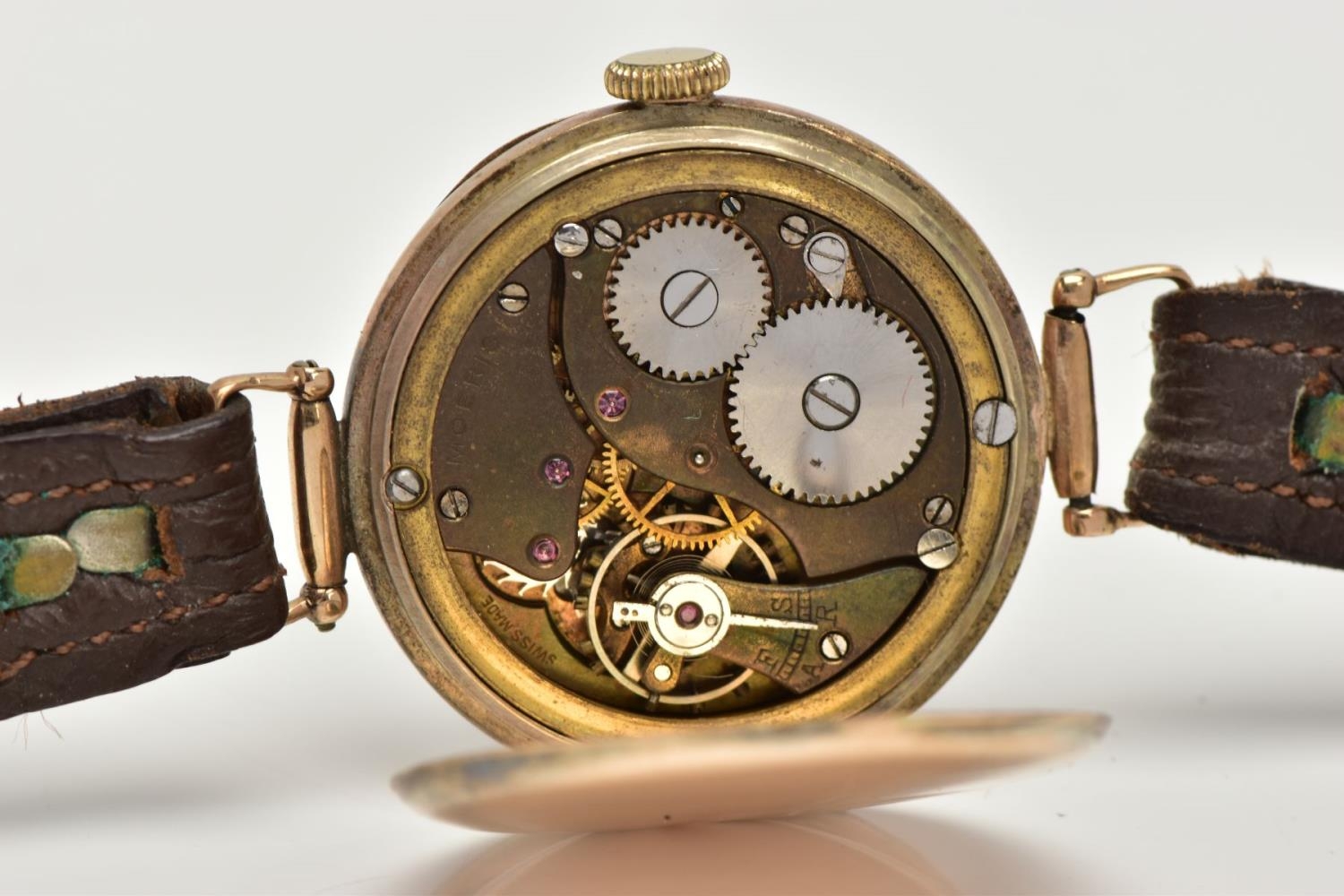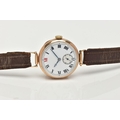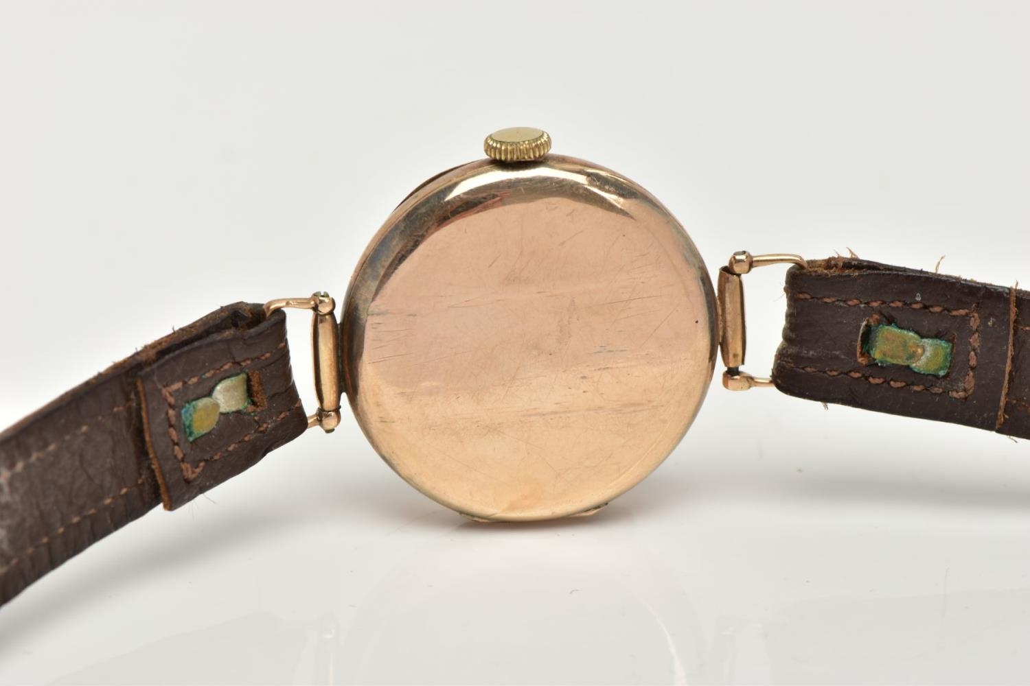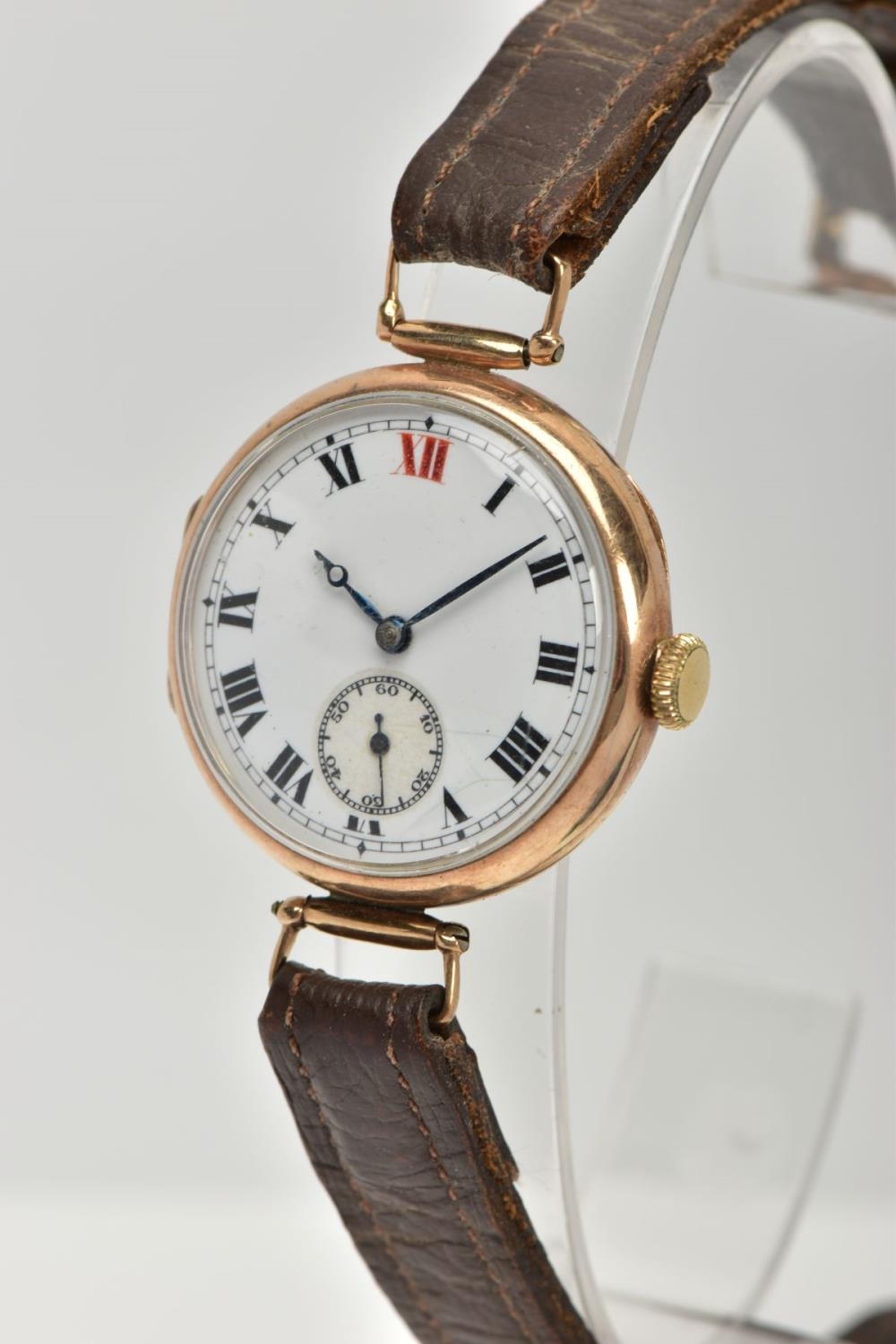 A 9CT GOLD GENTS WRISTWATCH, a hand wound movement, white dial, approximate width 32mm, Roman numerals, subsidiary seconds dial and the six o'clock position, blue hands, polished rose gold case, stamped 9 .375, inside case signed 1841530, hallmarked 9ct London 1920, fitted with a brown leather strap and gold tone buckle, approximate gross weight including strap 28 grams (condition report: general moderate wear, sets and winds, currently running, timekeeping not tested)