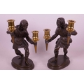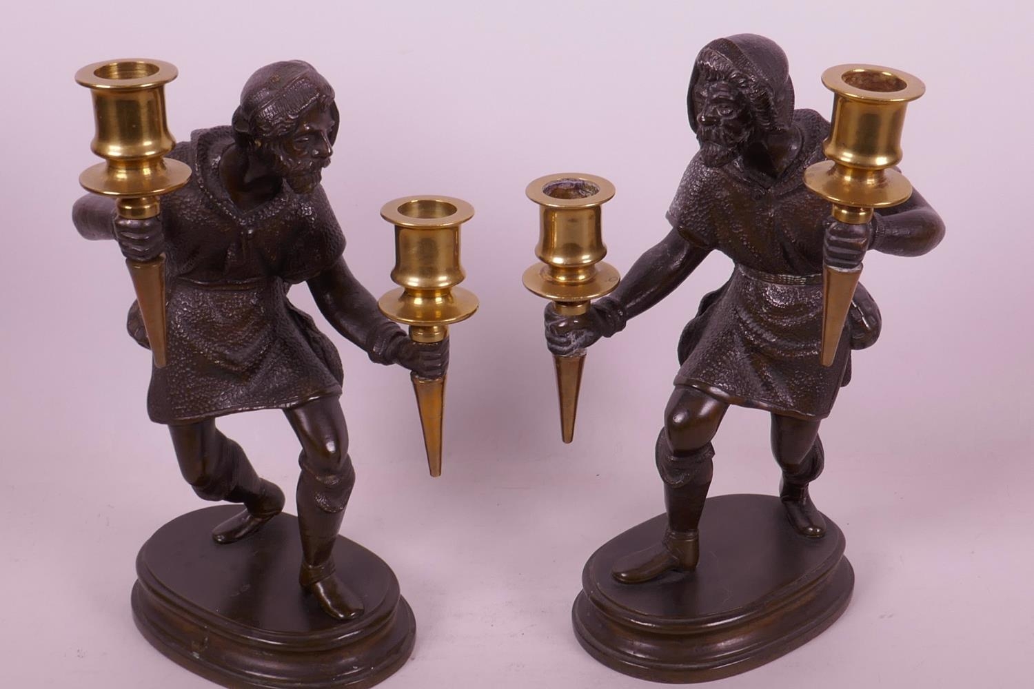 A pair of bronze candlesticks cast in the form of medieval bearded men bearing torches, 9" high