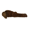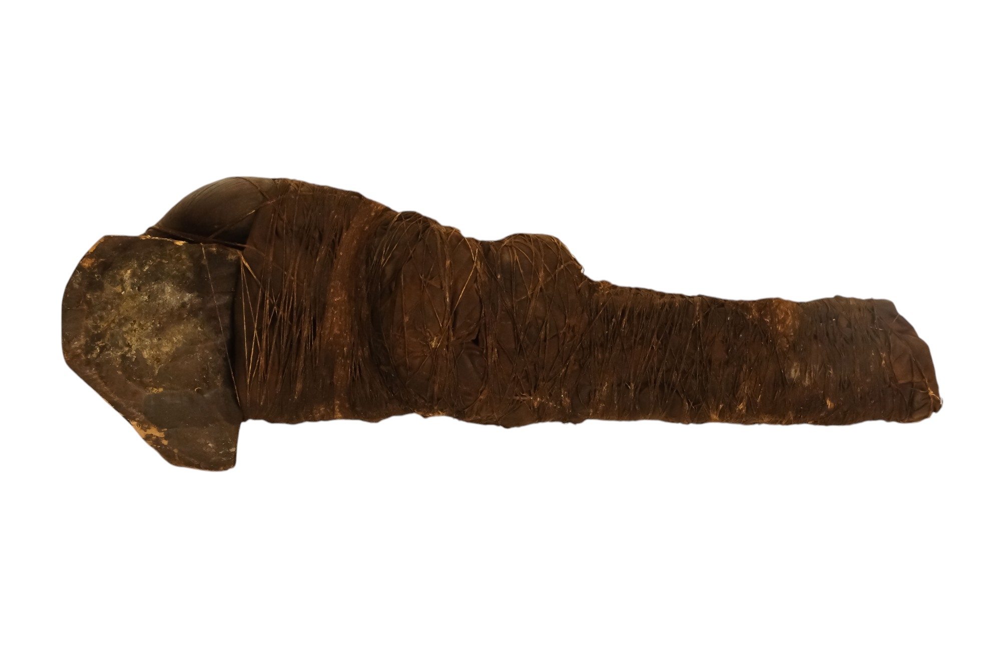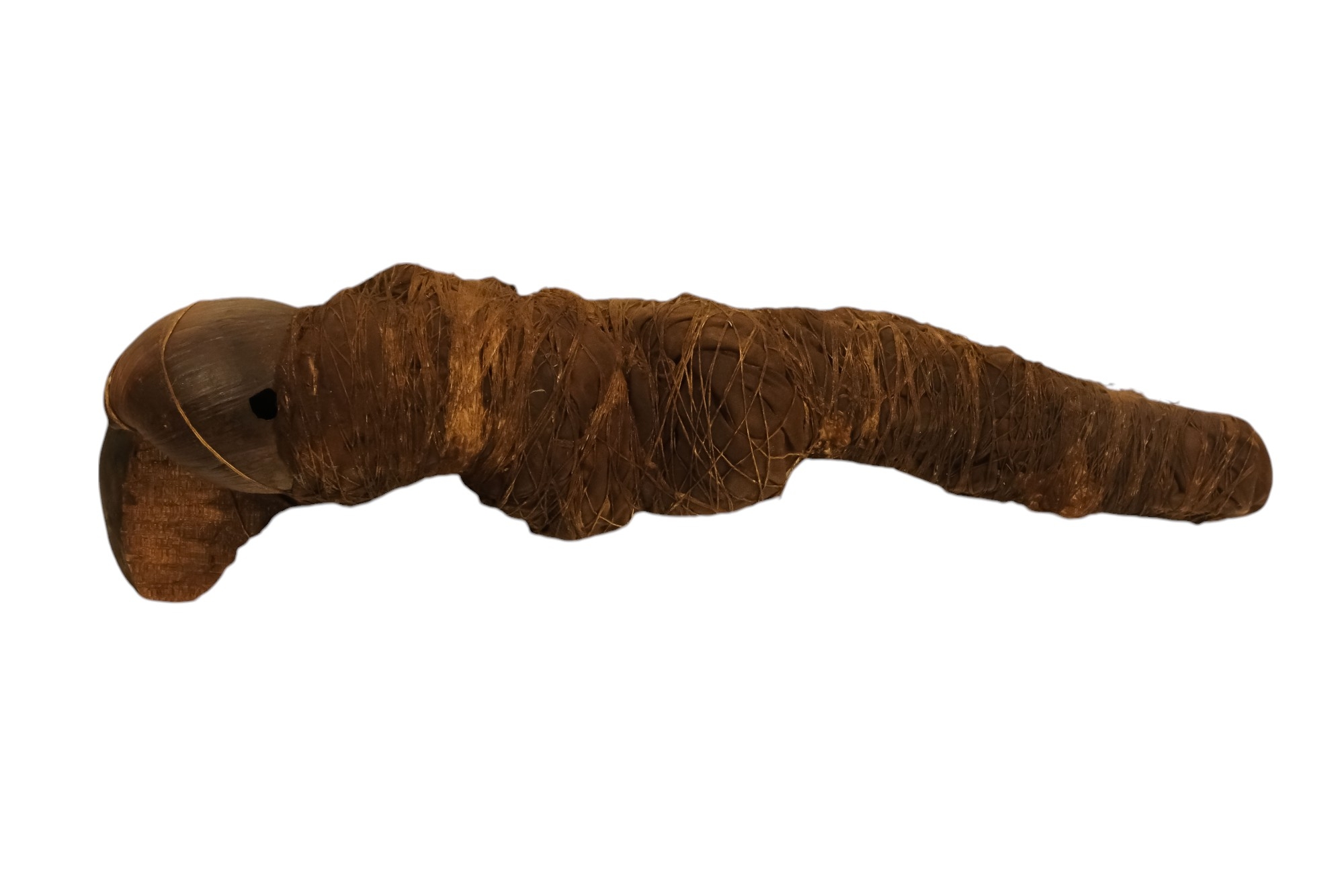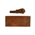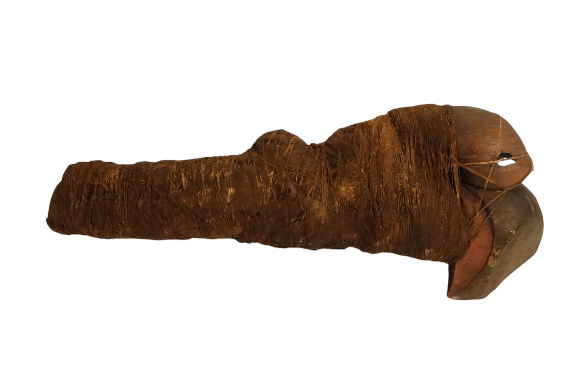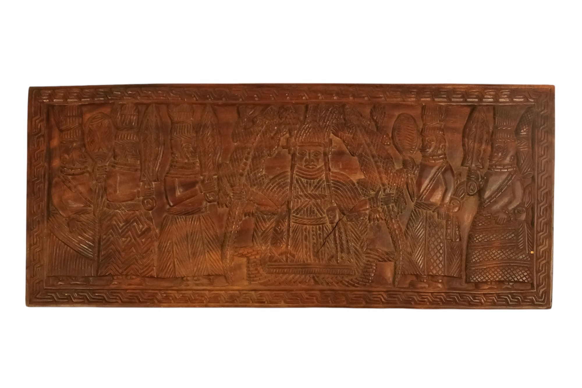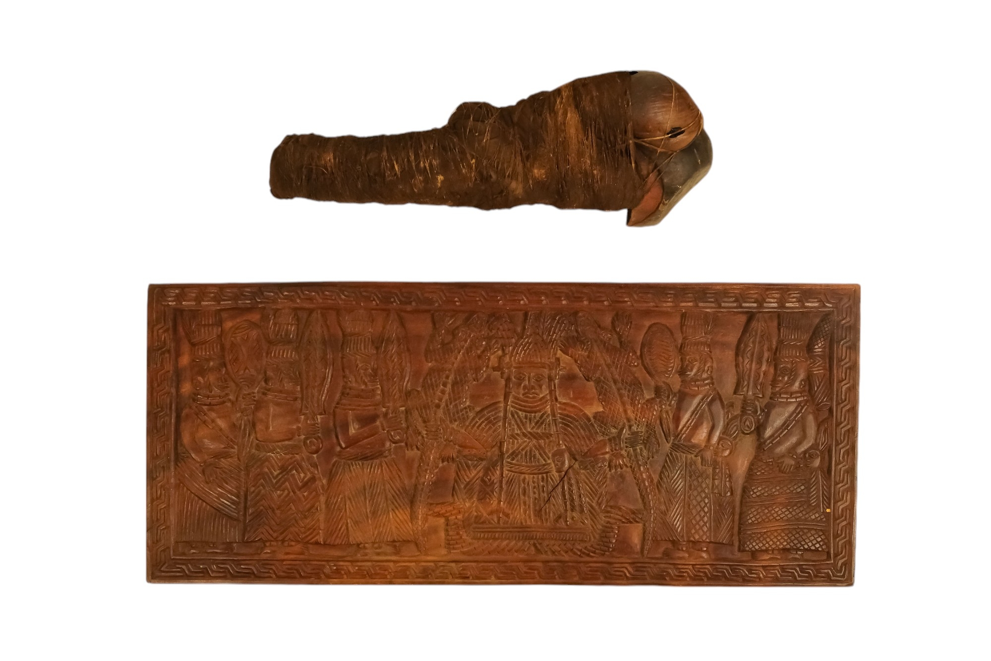 An African fetish - wraped in cloth with twine, 42cm long, together with a carved hardwood palque, depicting nobleman and attendents (2)