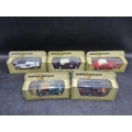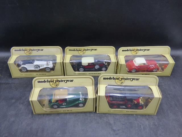 Five Matchbox Models of Yesteryear Die-Cast Models in Original Boxes including Packard Victoria, Crossley, MG-TC, Mercedes, and 1937 Cord