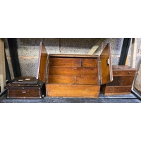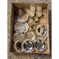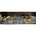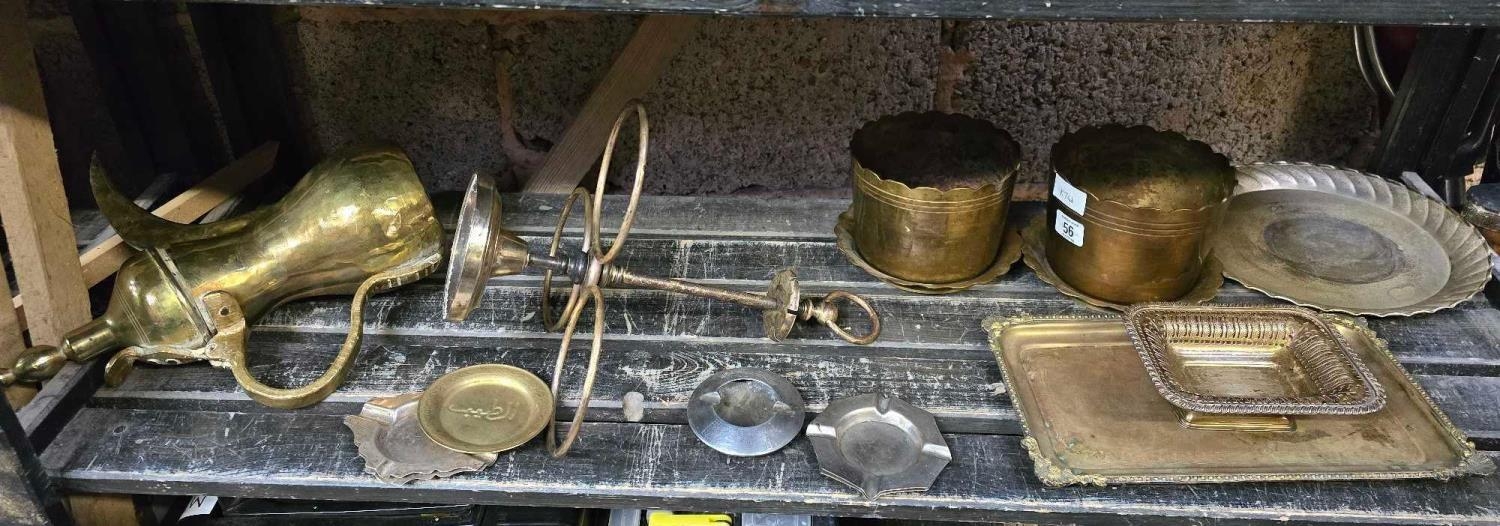 SHELF WITH MISC ISLAMIC BRASS WARE & POTS, ASHTRAYS & TRAYS