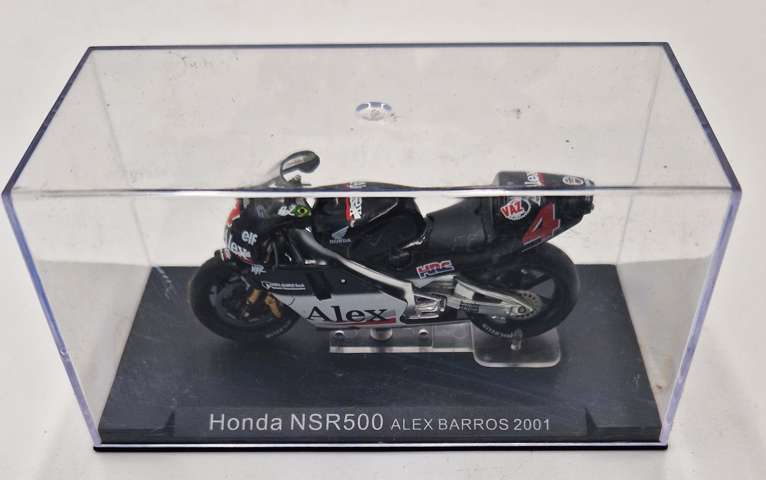 DIE CAST COLLECTORS MODEL OF A HONDA NSR500 MOTORCYCLE (Alex Barros 2001) (Original Hard Plastic Display Case)