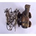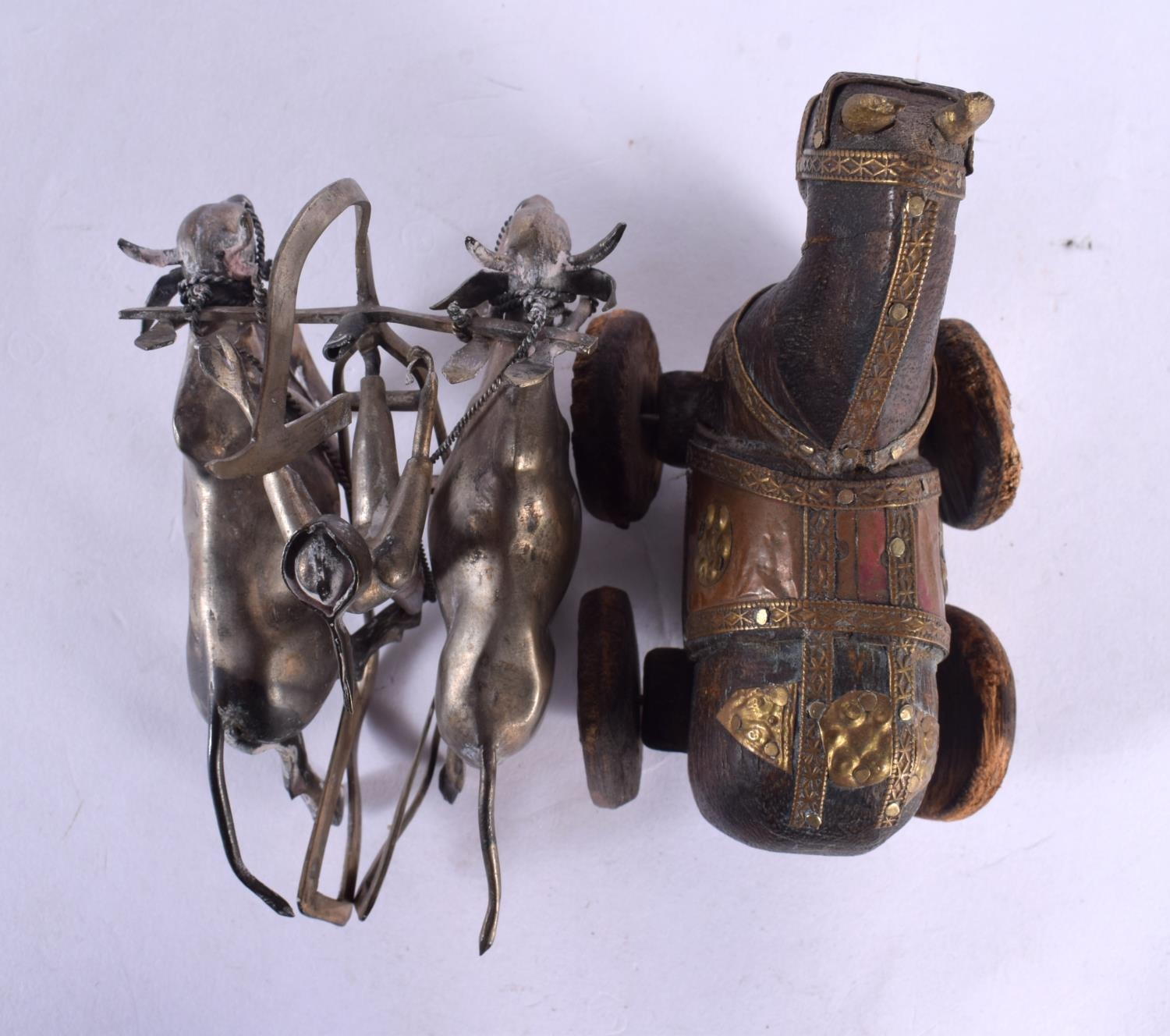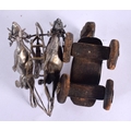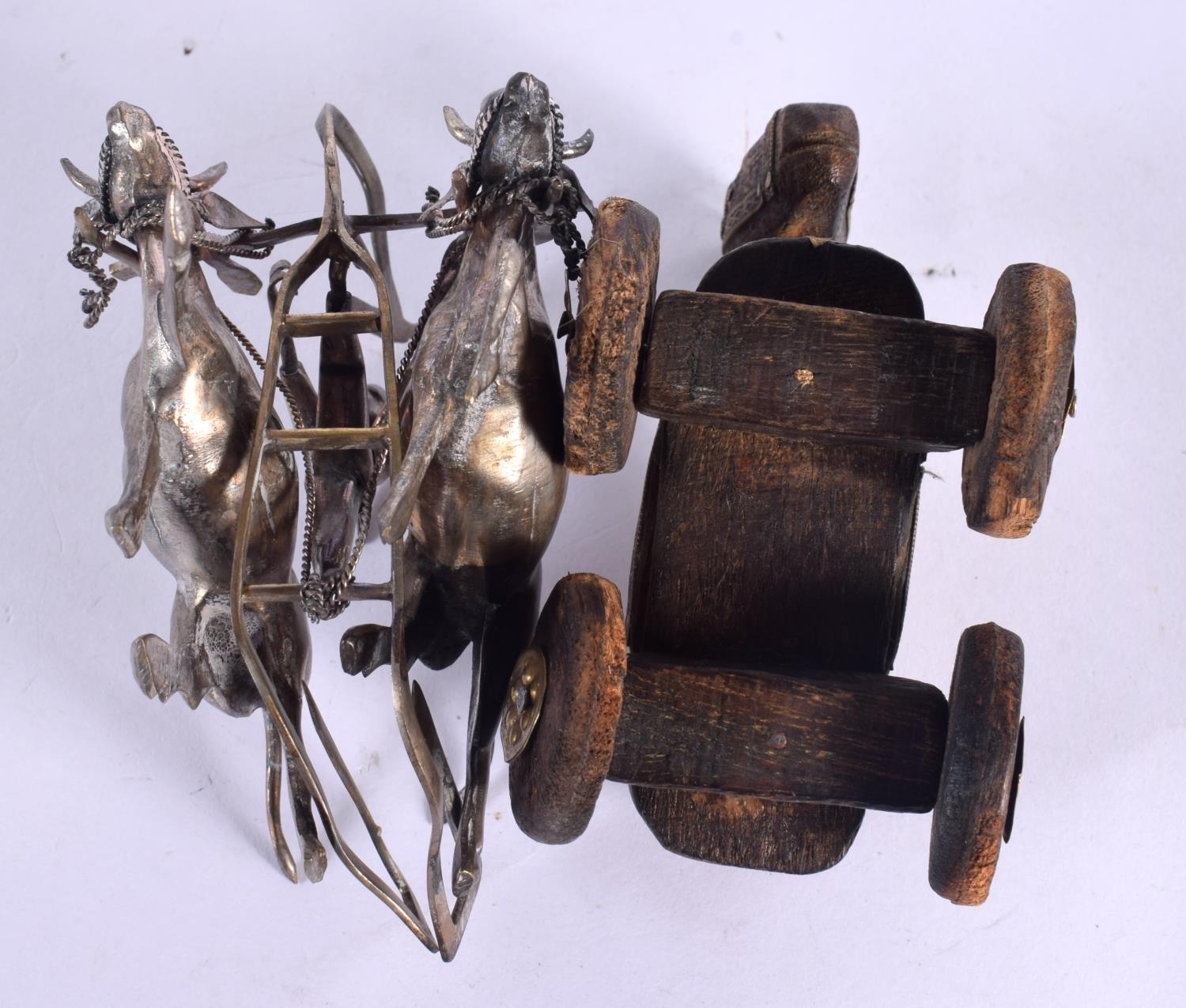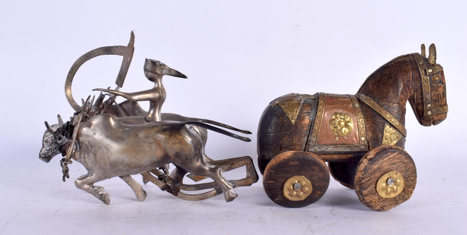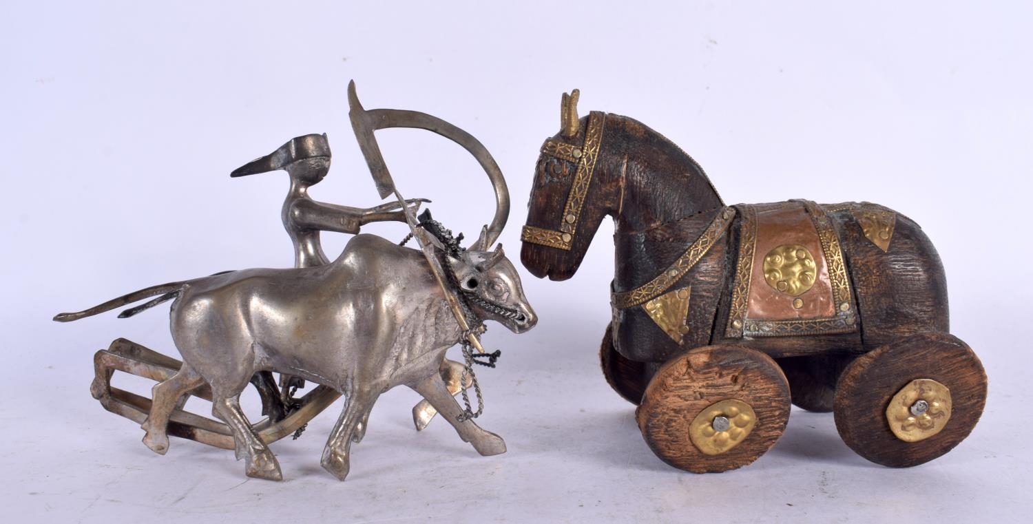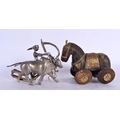 A CHARMING INDIAN CARVED WOOD TOY HORSE together with a white metal oxen group. Oxen 106 grams. Largest 10.5 cm x 9 cm. (2)