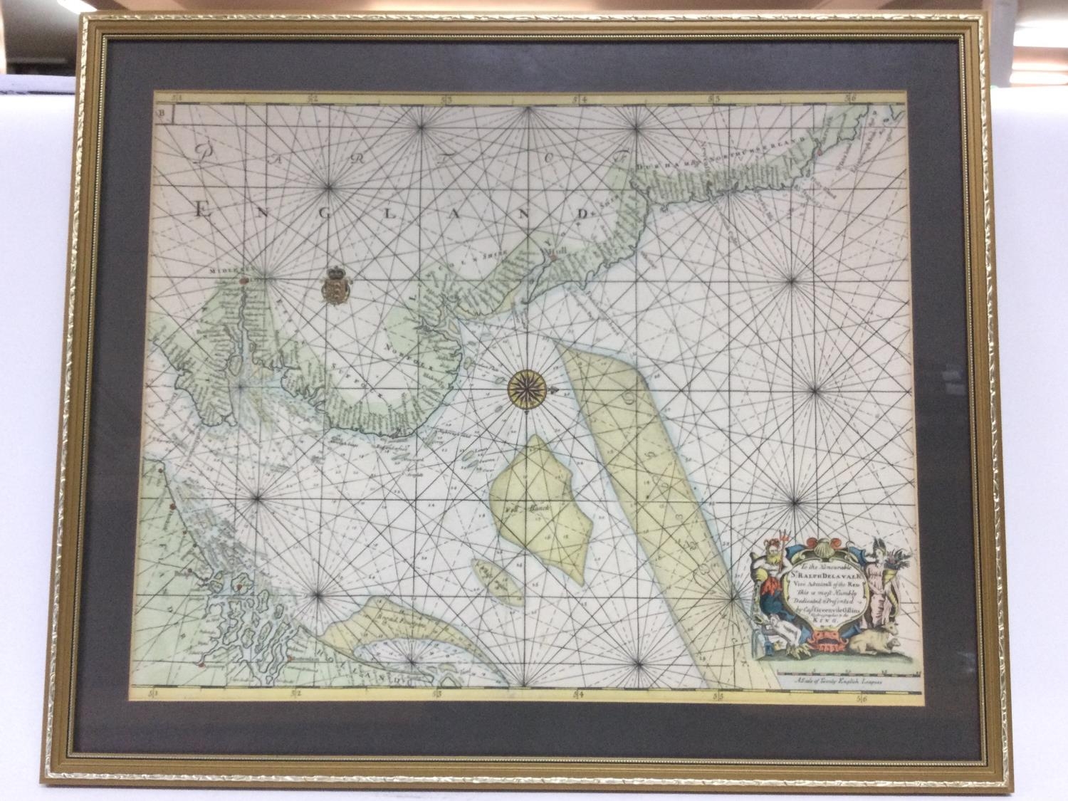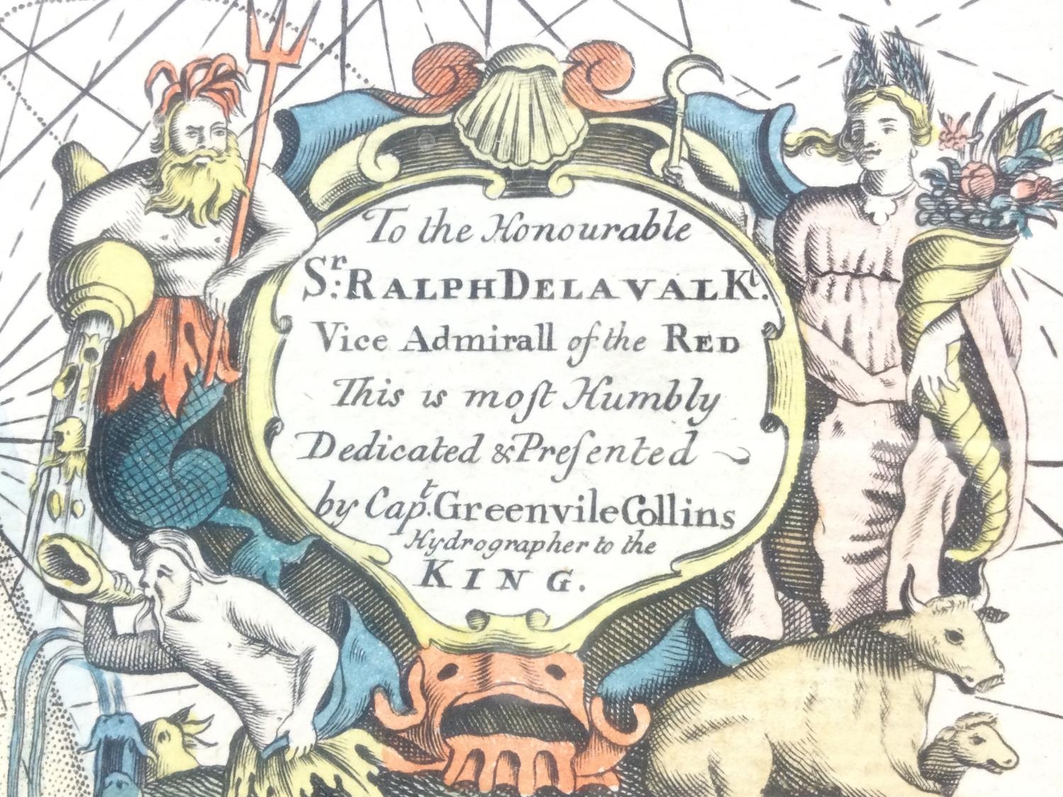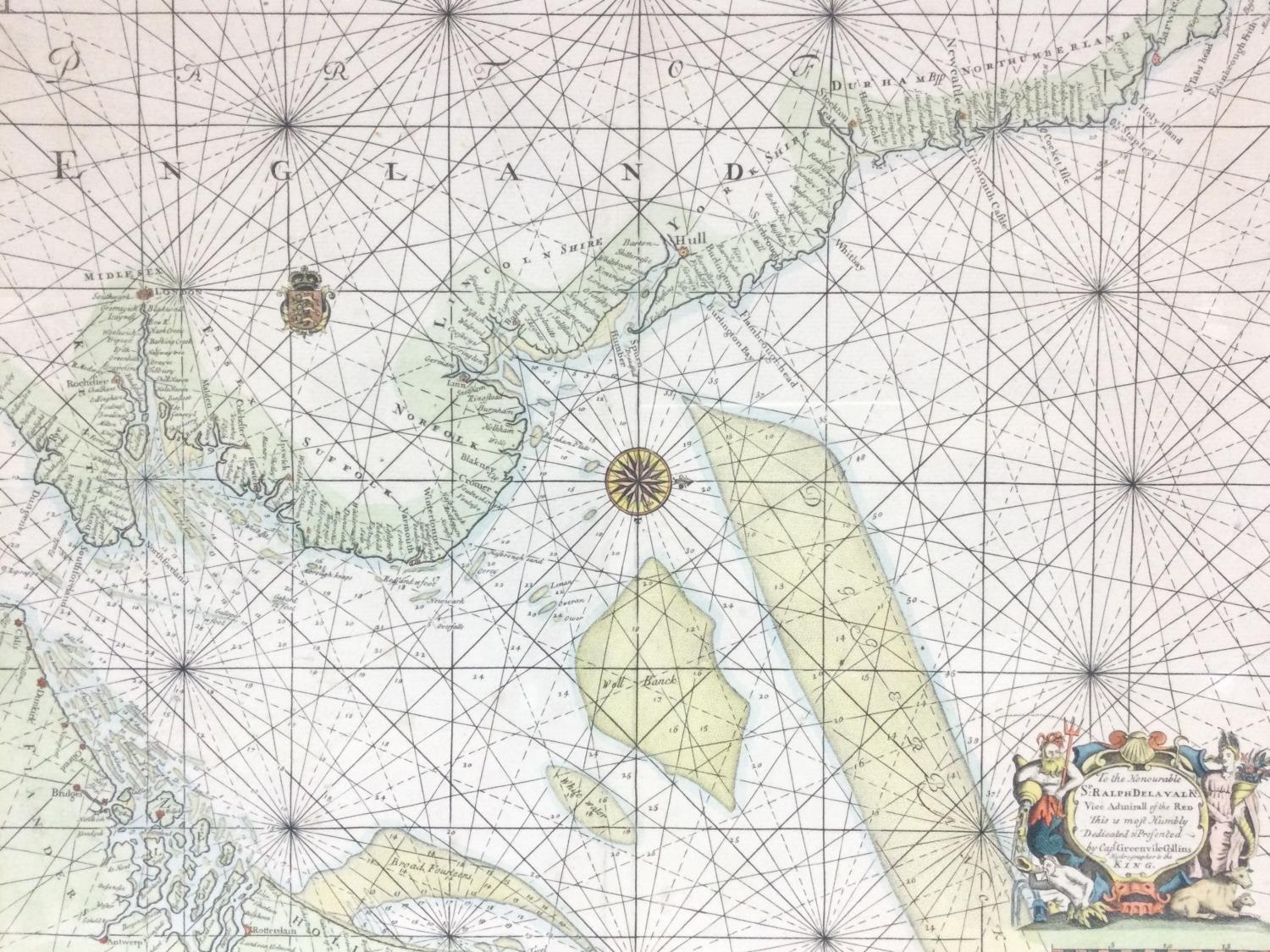 A framed map of the East Coast of England by Captain Greenville Collins, frame dimensions 56x67.5cm. Postage category D
