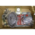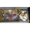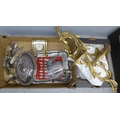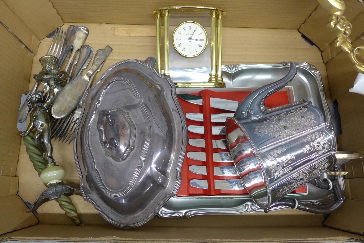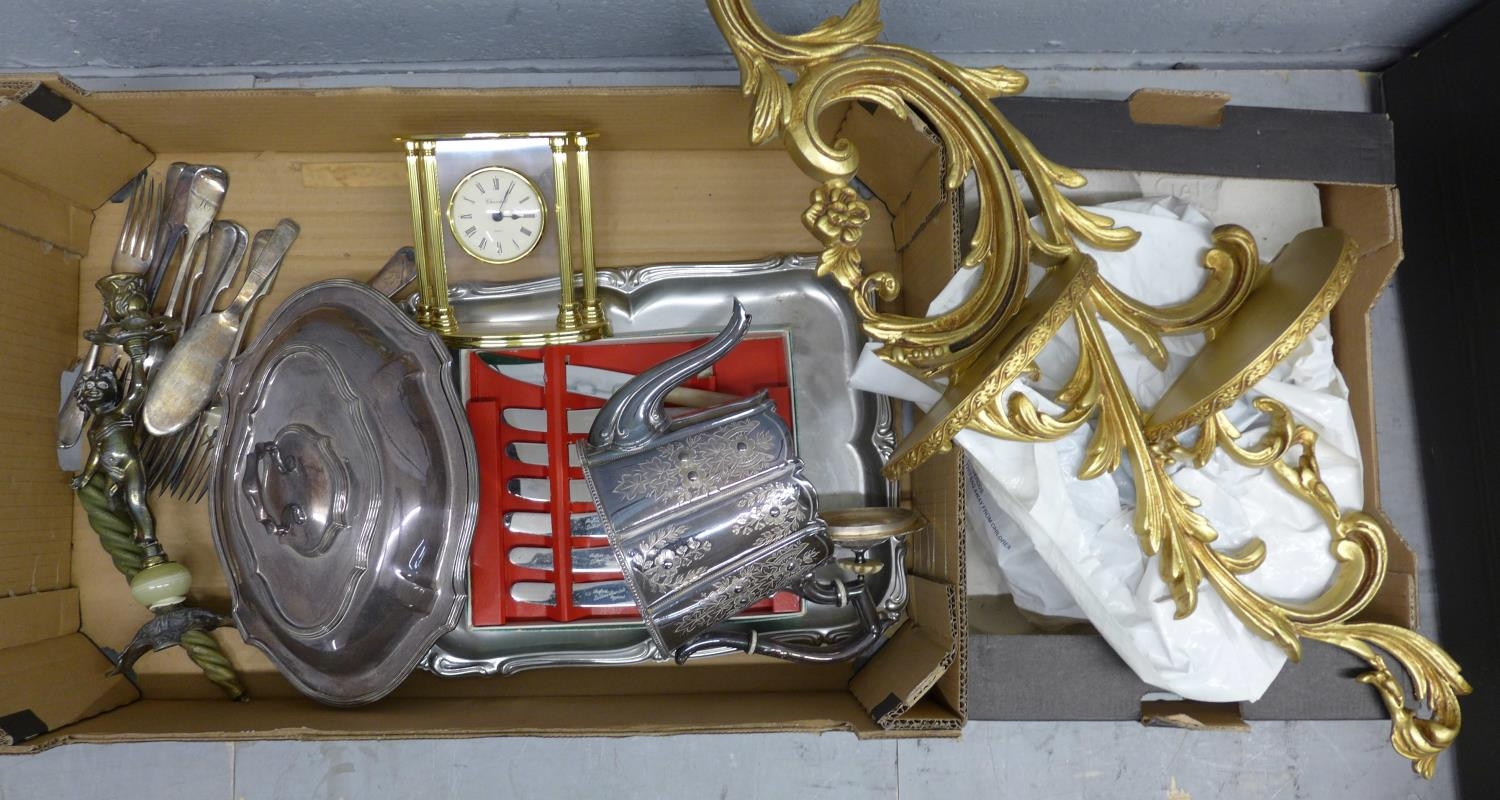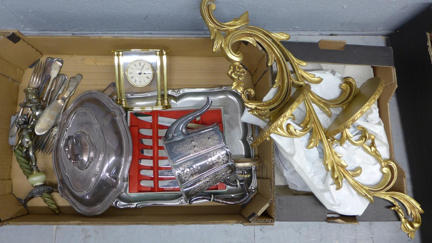 Two boxes of assorted items, a gilt metal display shelf, ceiling light, plated teapot and serving dish, tray, etc.**PLEASE NOTE THIS LOT IS NOT ELIGIBLE FOR POSTING AND PACKING**