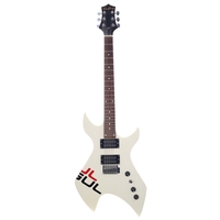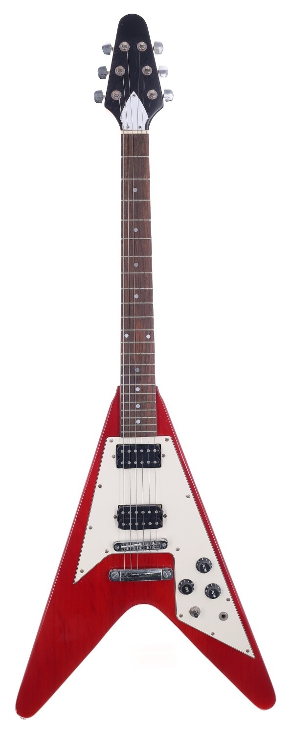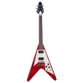 Flying V electric guitar, unbranded, with red finish body and twenty-two fret rosewood board bolt-on neck (finish imperfections)