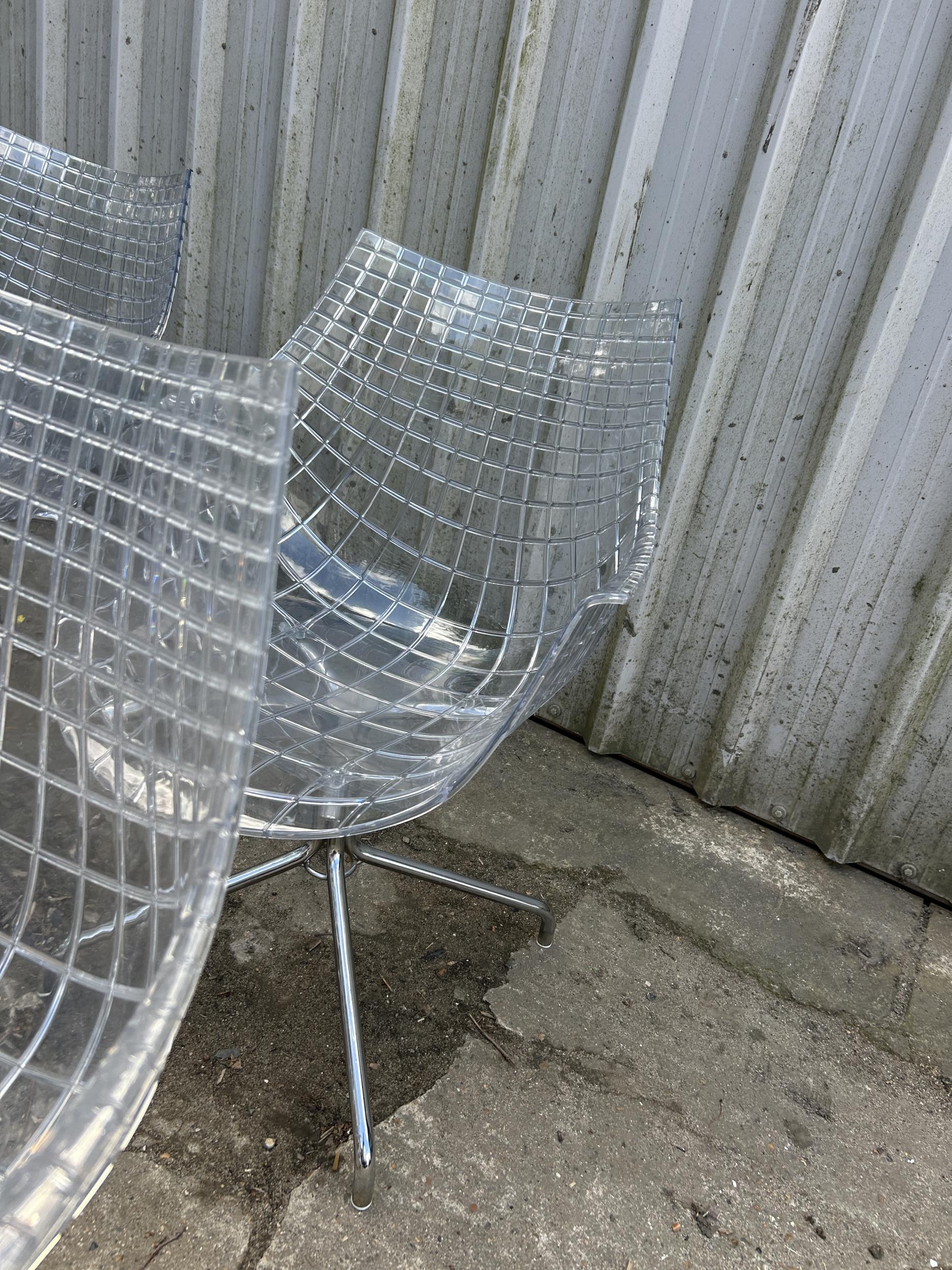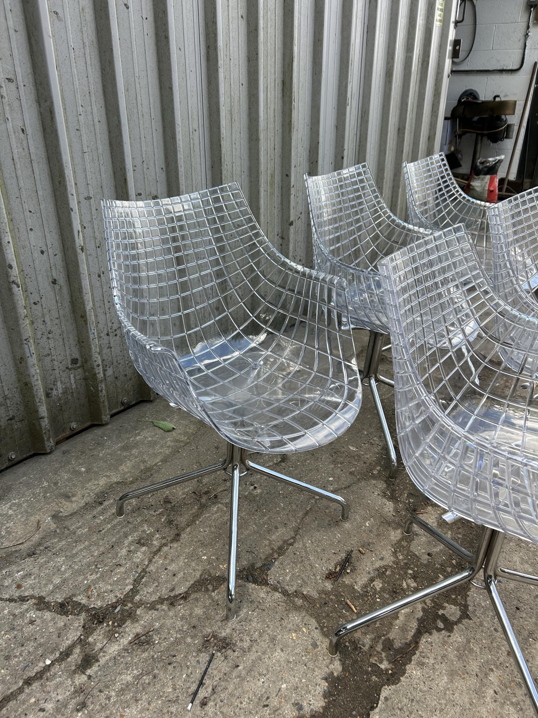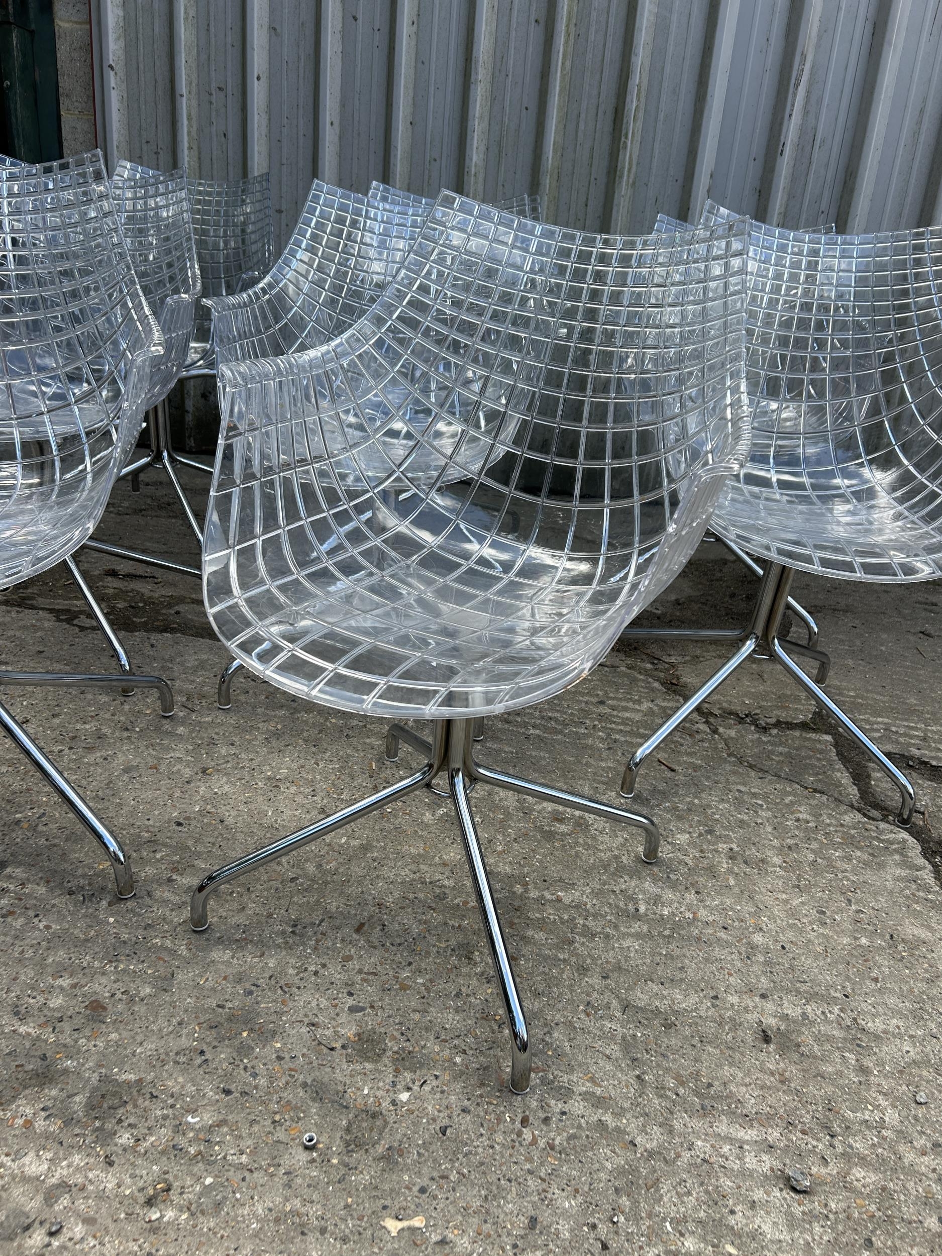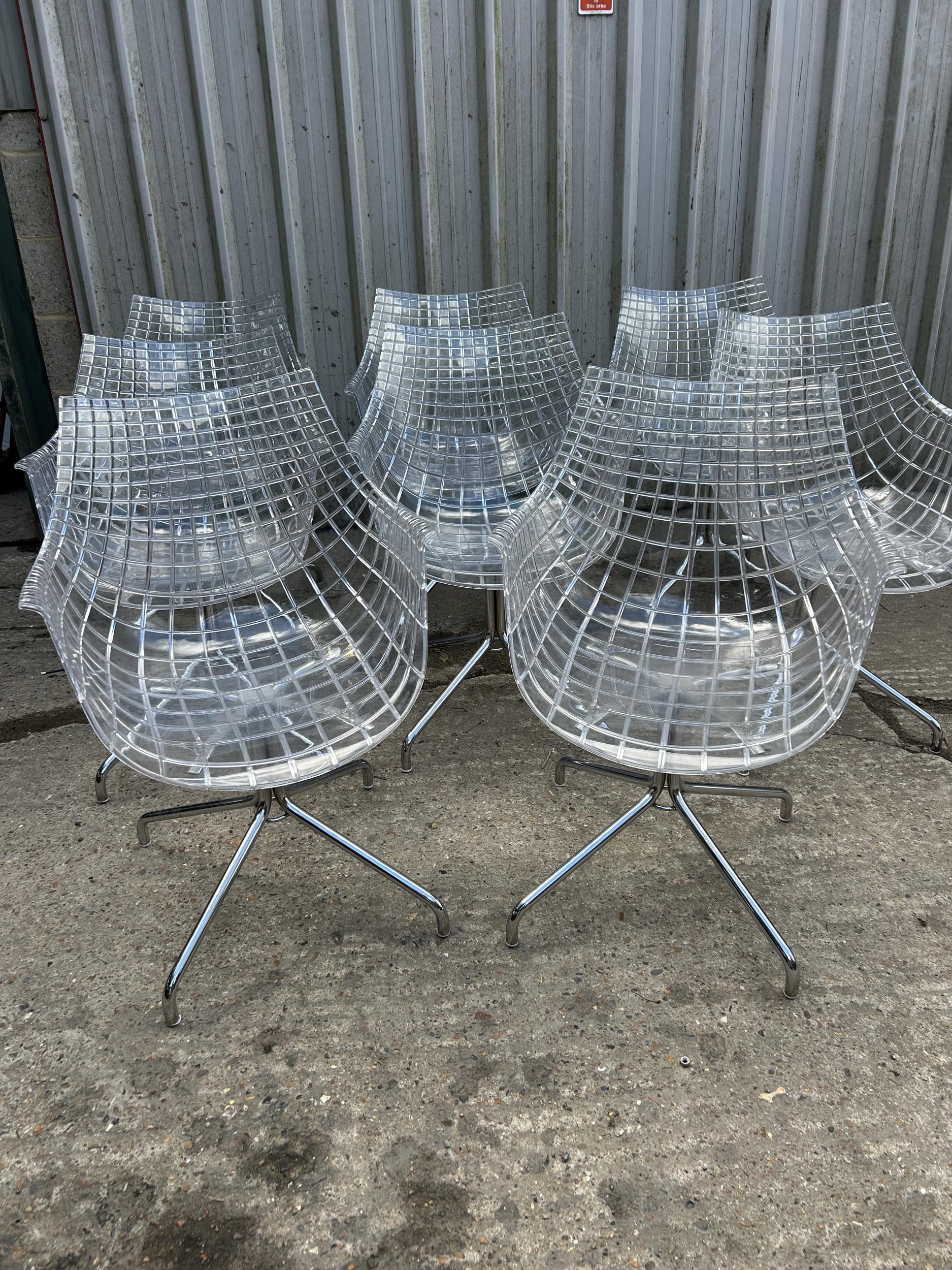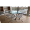 A modern design chrome and glass circular dining table by CATTELAN ITALIA 150cm diameter together with a set of 8 DRIADE MERIDANA chrome and Perspex basket style dining chairs imported from italy.