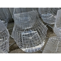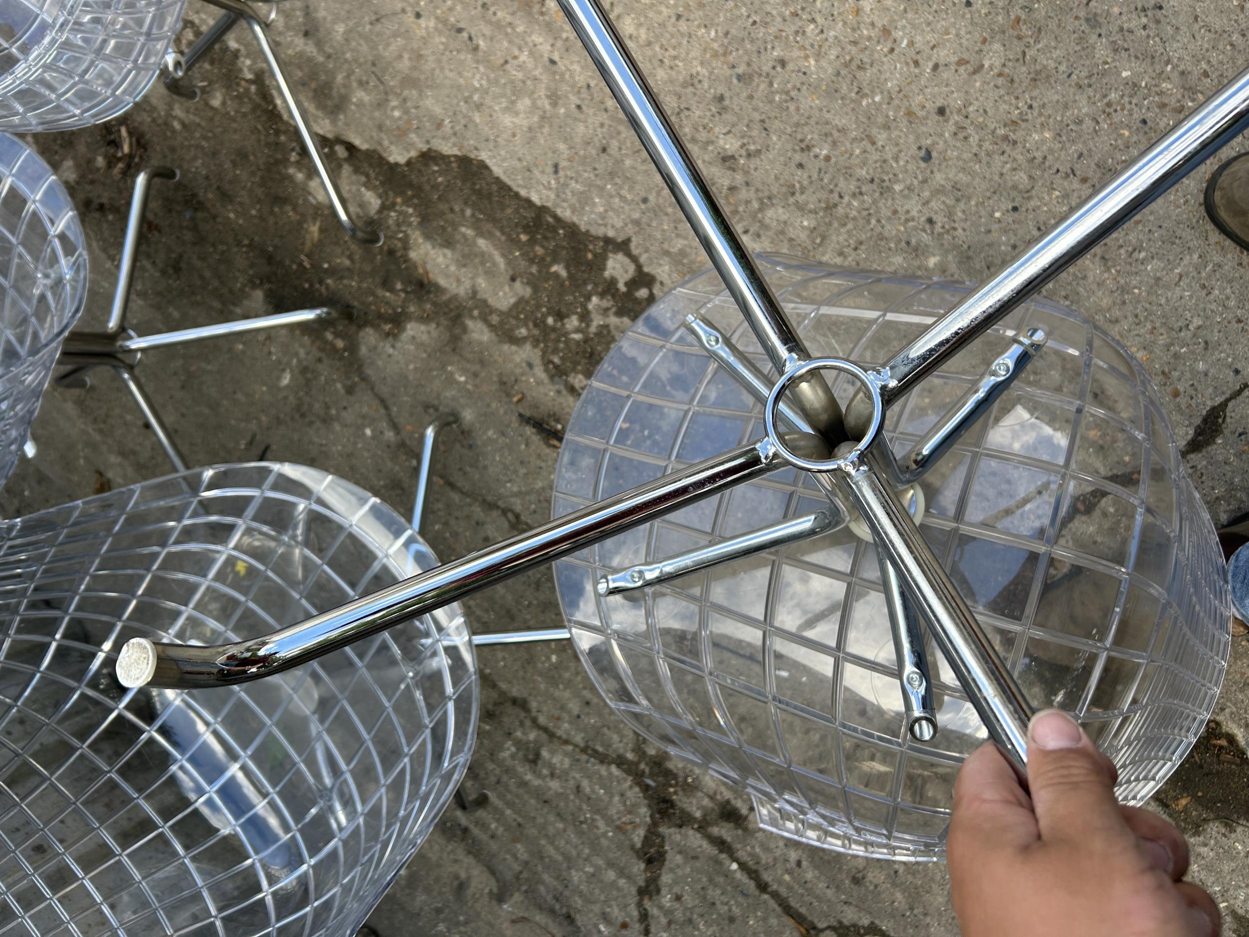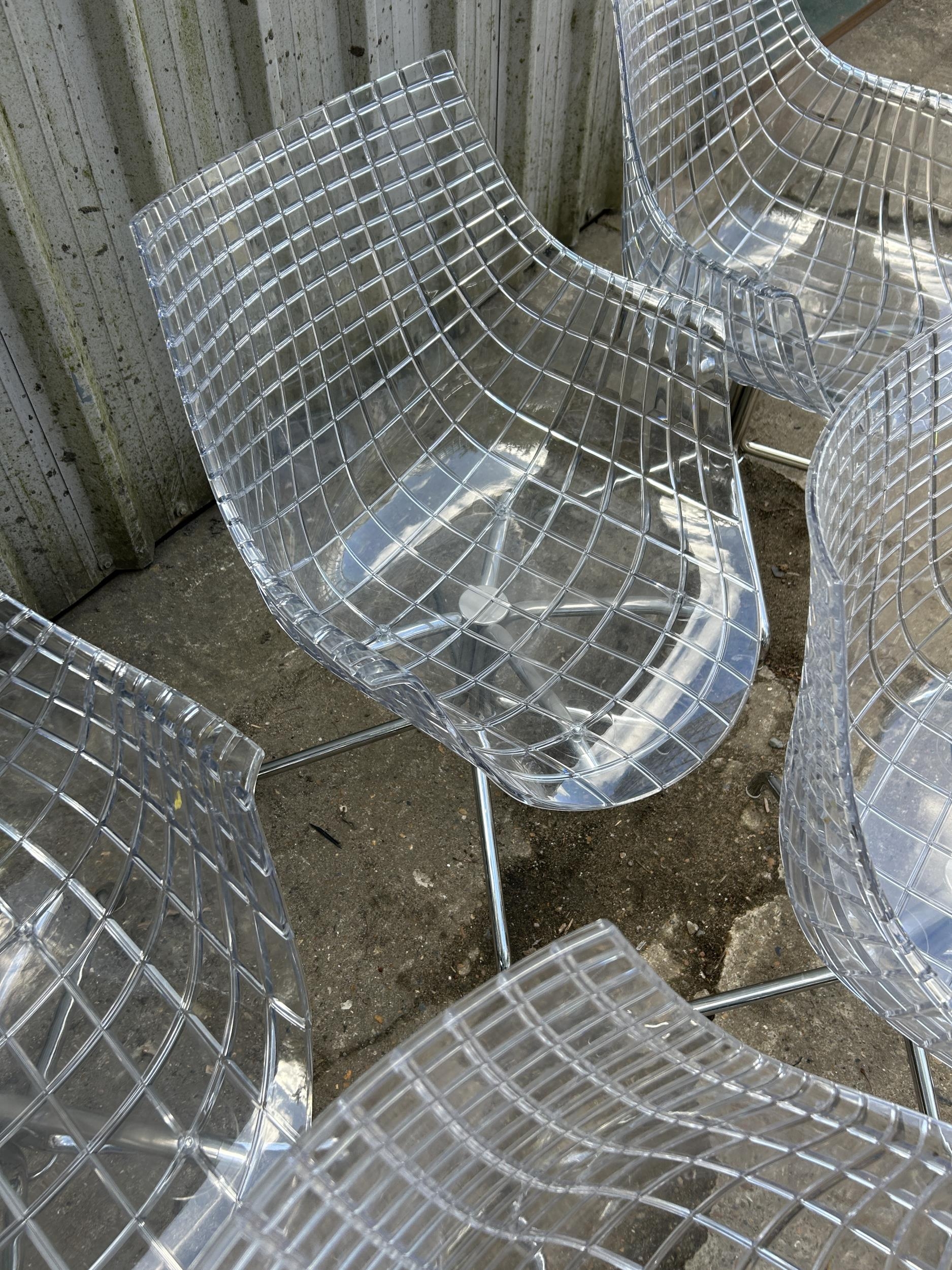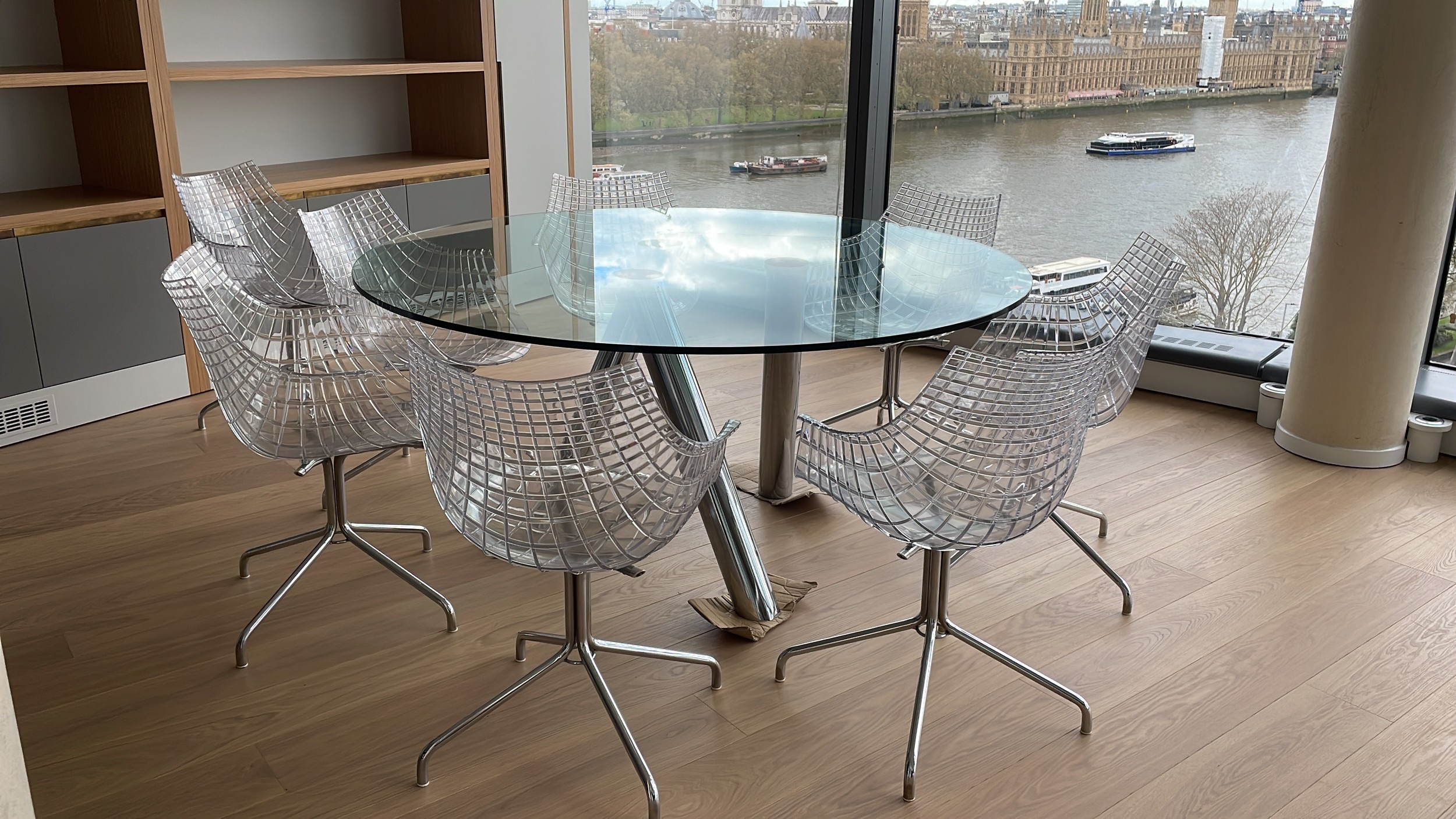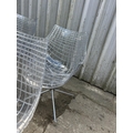 A modern design chrome and glass circular dining table by CATTELAN ITALIA 150cm diameter together with a set of 8 DRIADE MERIDANA chrome and Perspex basket style dining chairs imported from italy.