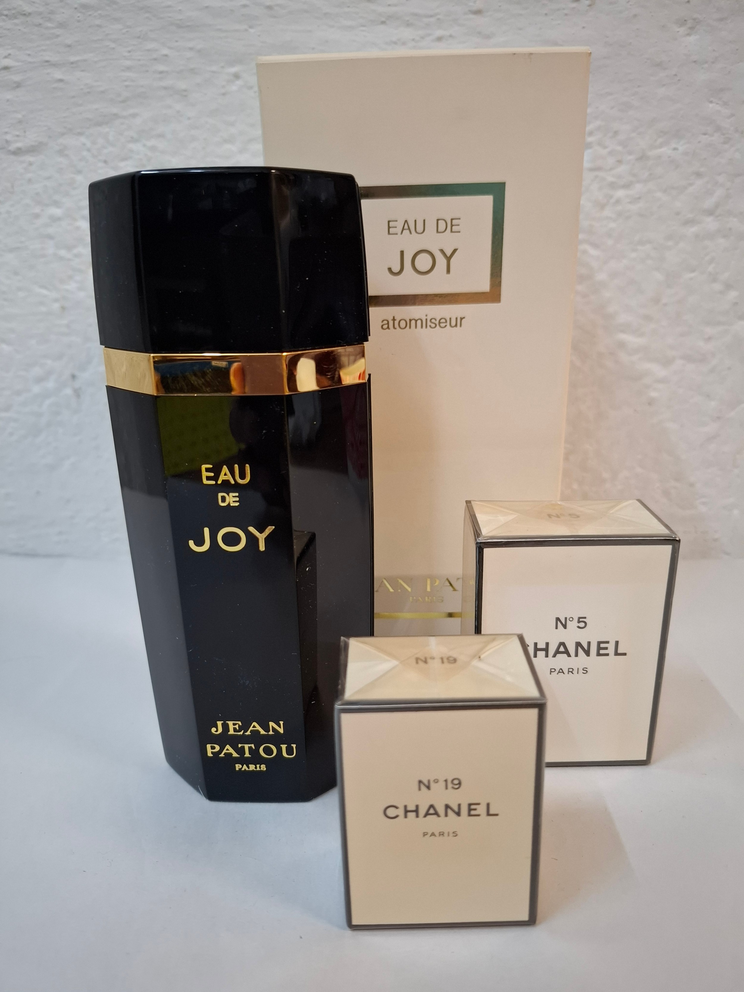 Chanel- A 7ml sealed bottle of No.19 Extrait TTPM, a 14ml sealed bottle of No.5 Extrait TPM and a 60ml bottle of Jean Patou Eau de Joy Atomiseur (almost full). Location:R1.1