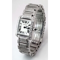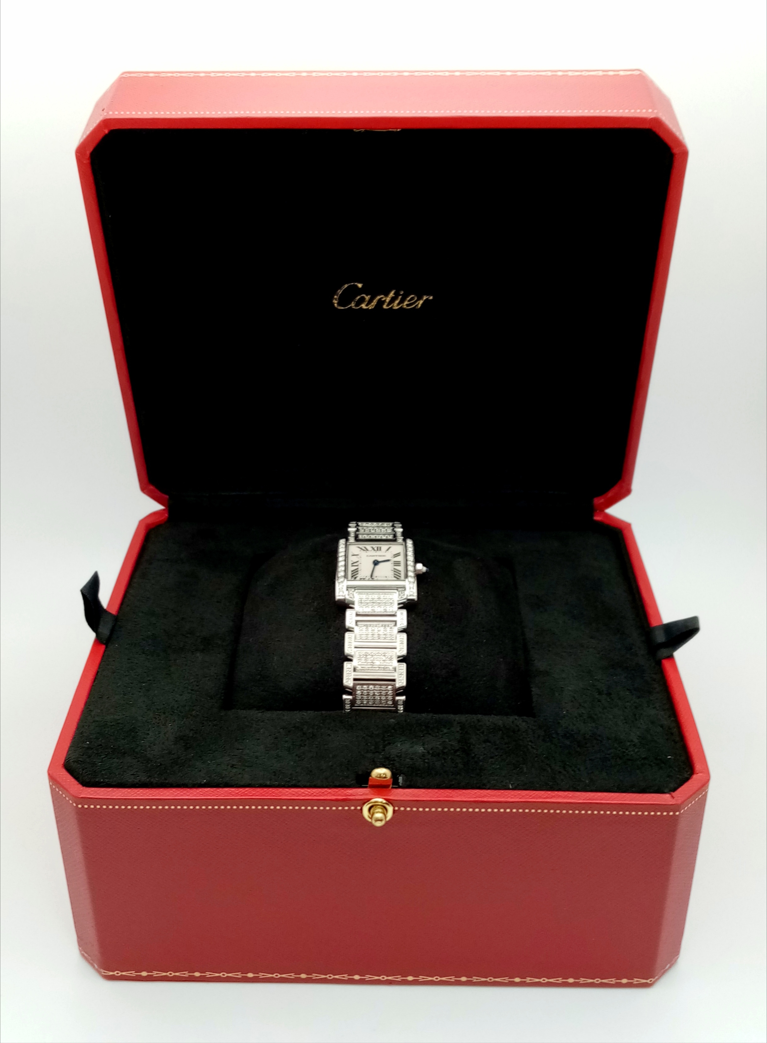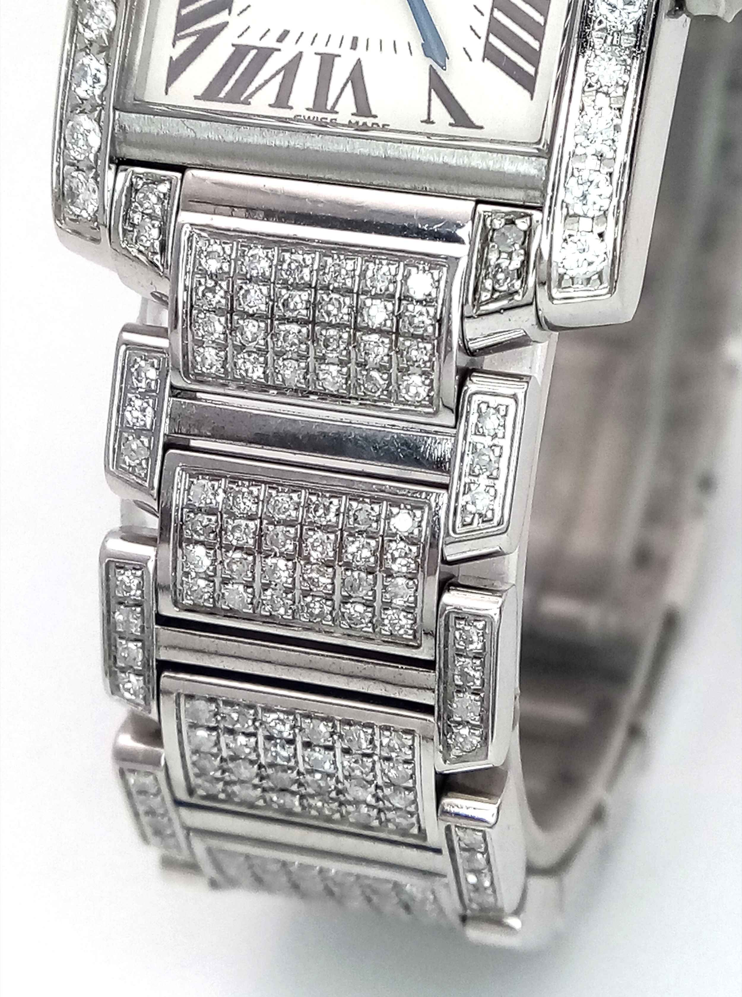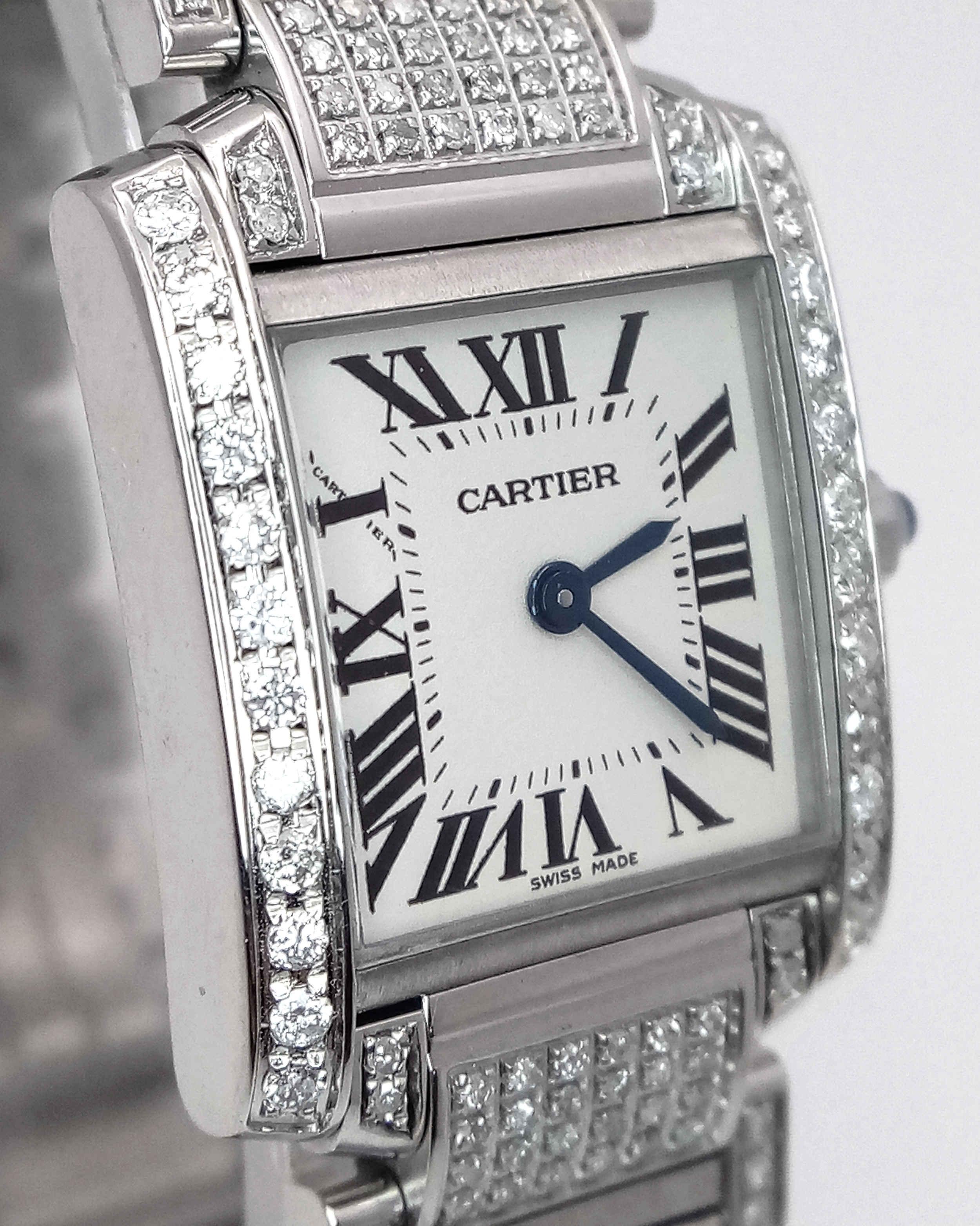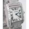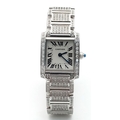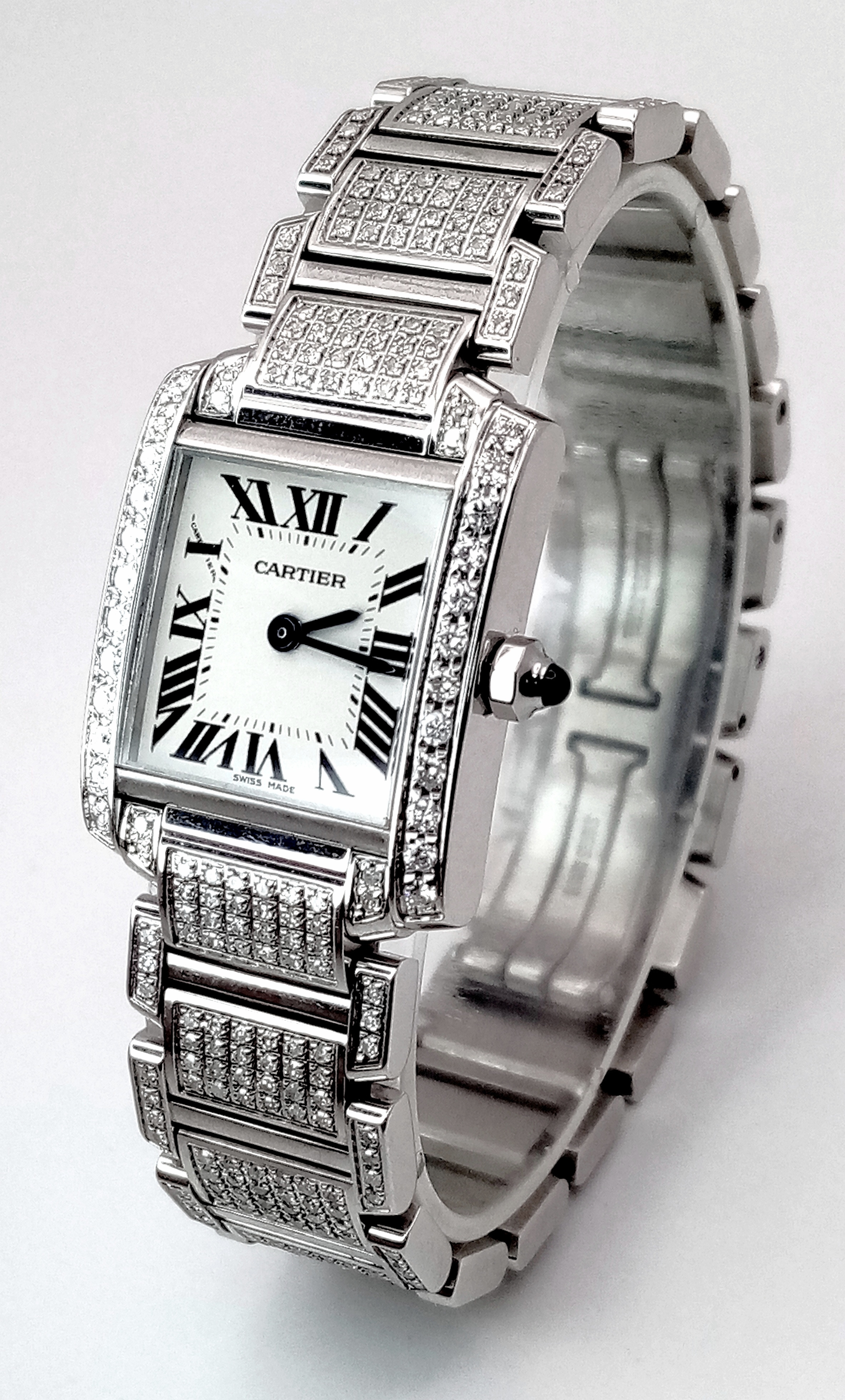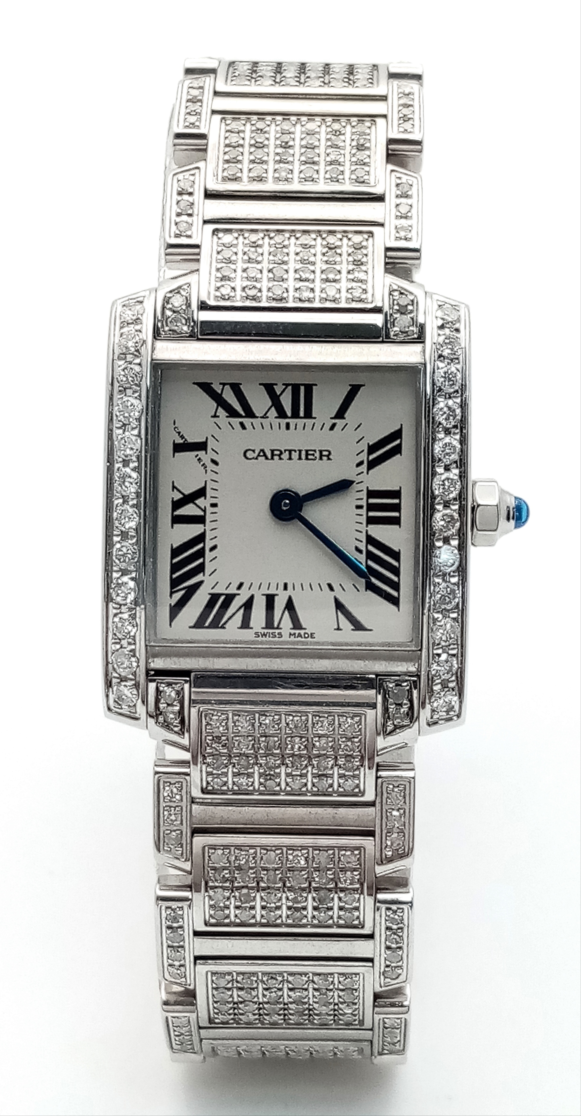 A Classic Cartier Tank Francaise Diamond Ladies Watch. Stainless steel diamond set bracelet. Case - 21mm width. White dial with Roman numeral markers. Sapphire set crown. Diamond set bezel and lugs. Quartz movement, in working order. Comes with an international guarantee card and Cartier case. Note: This watch has been custom fitted with diamonds.