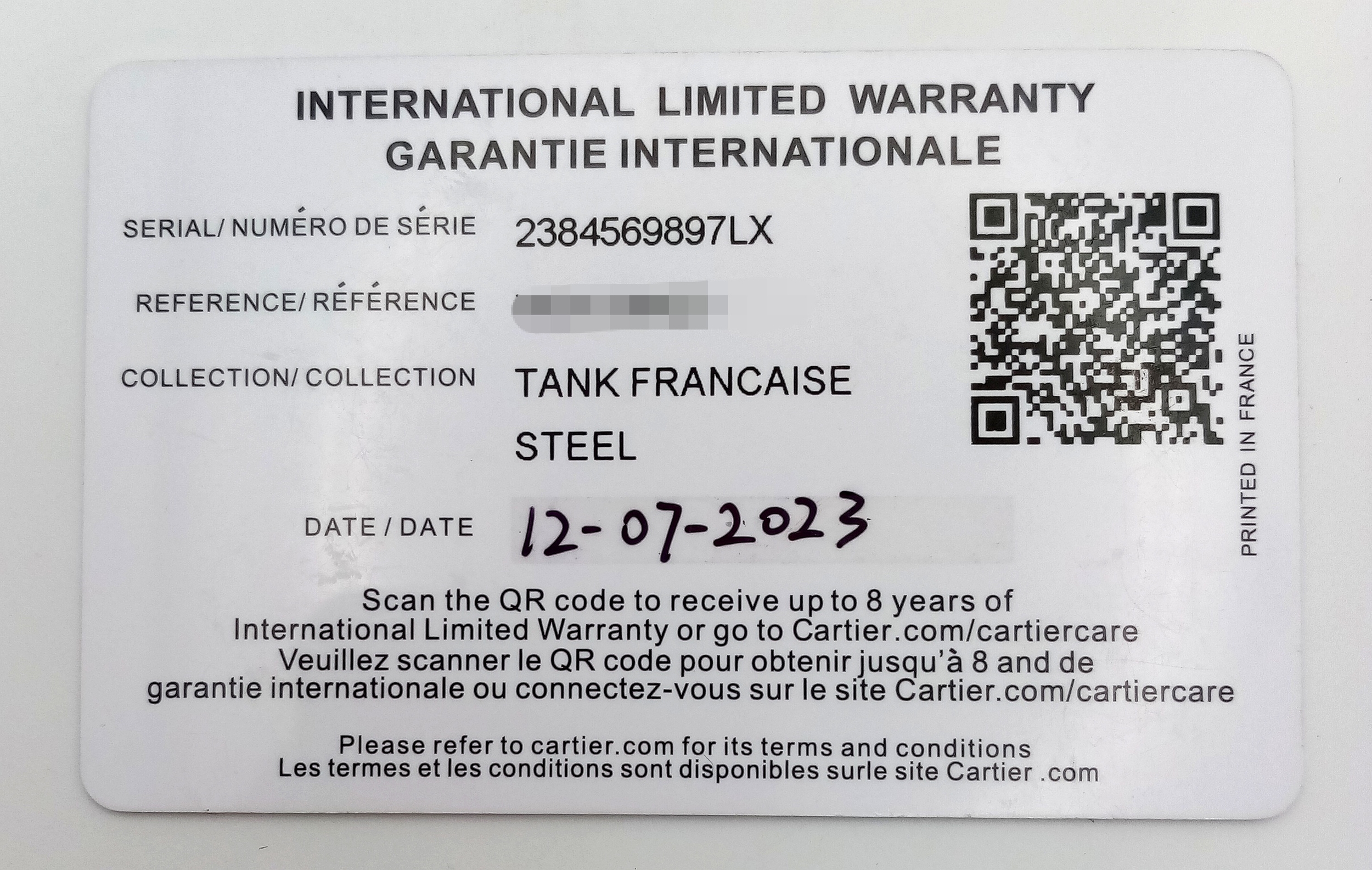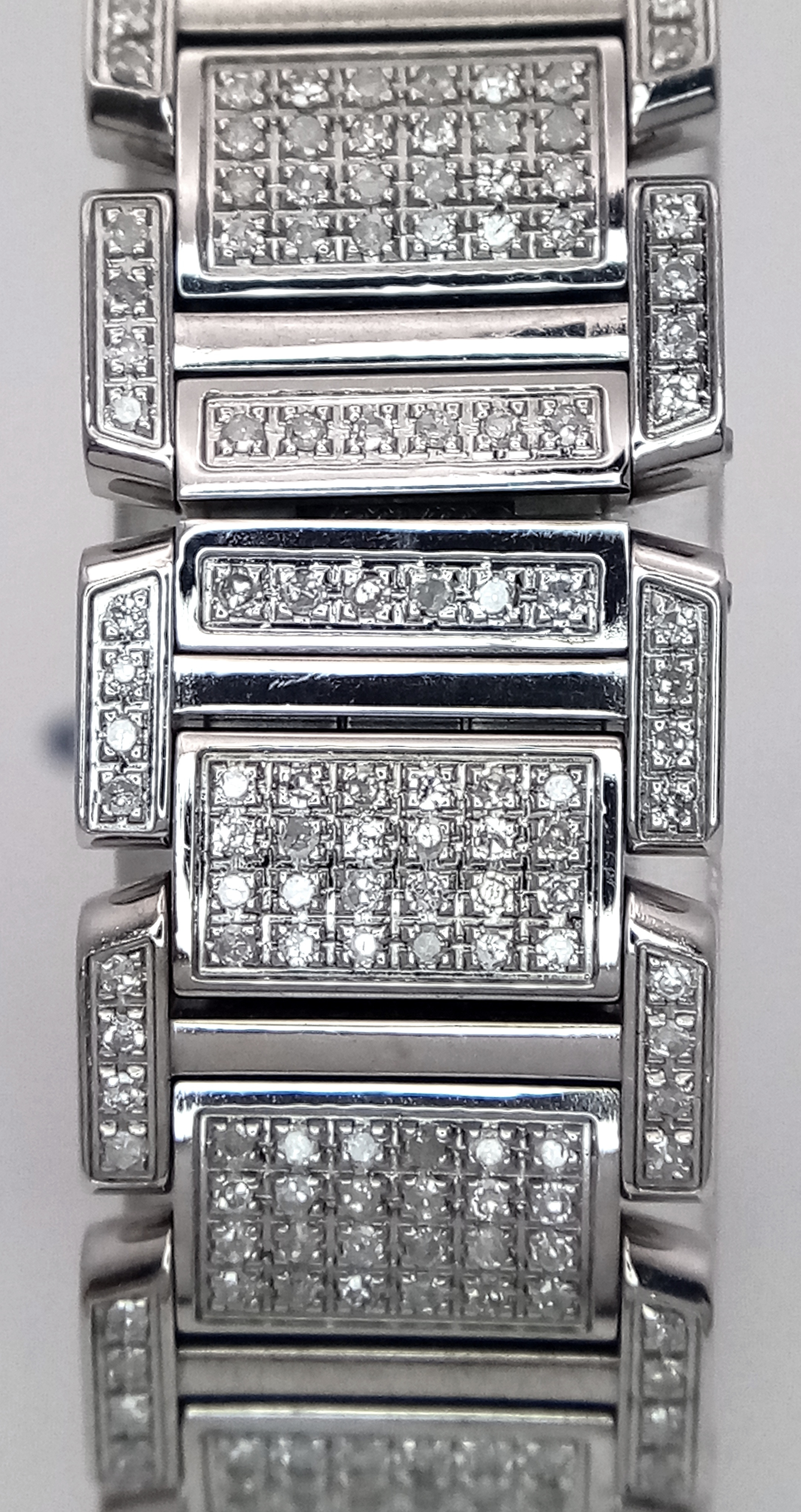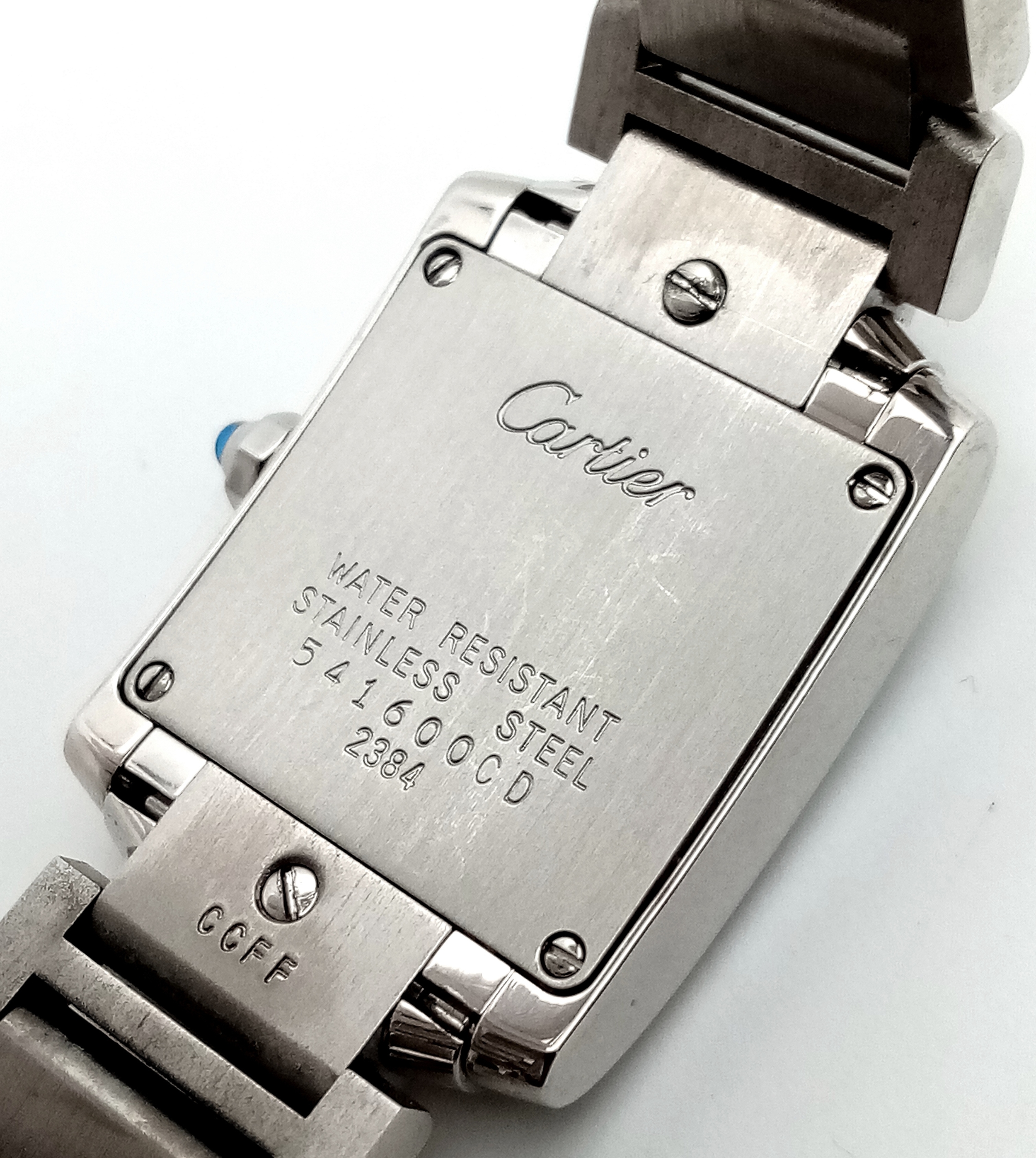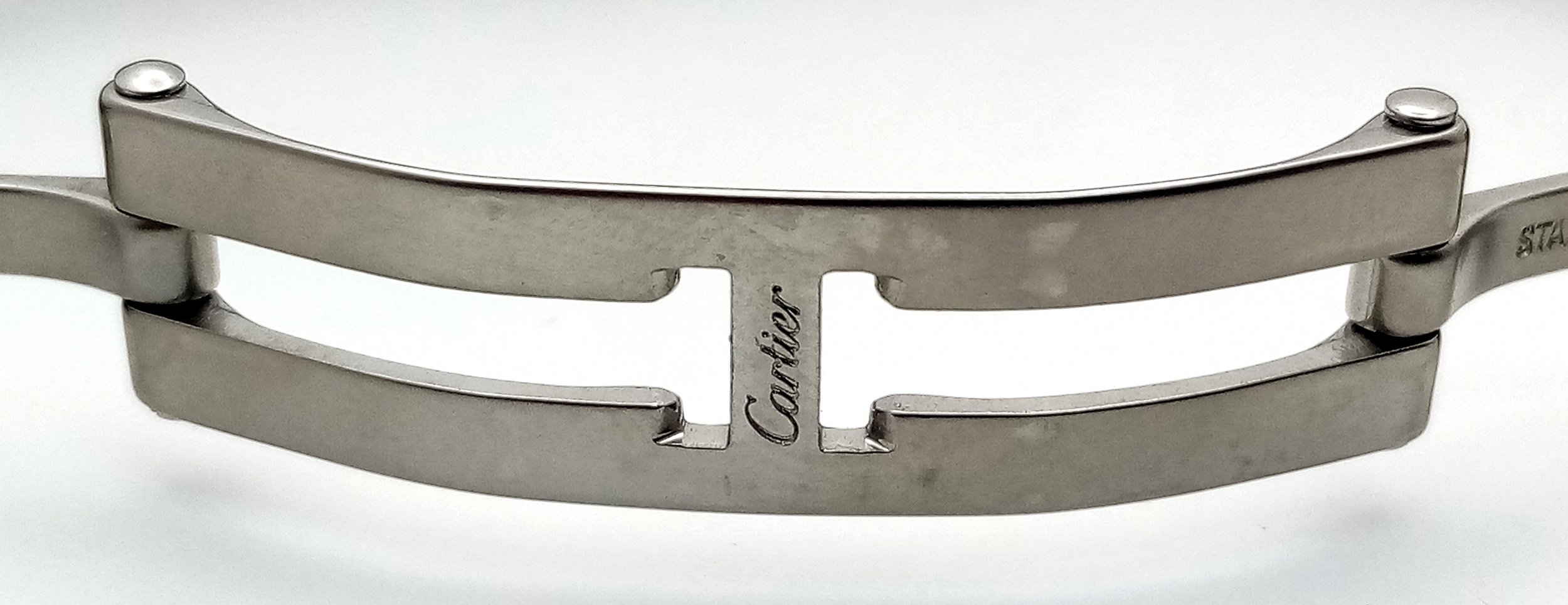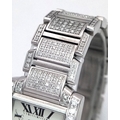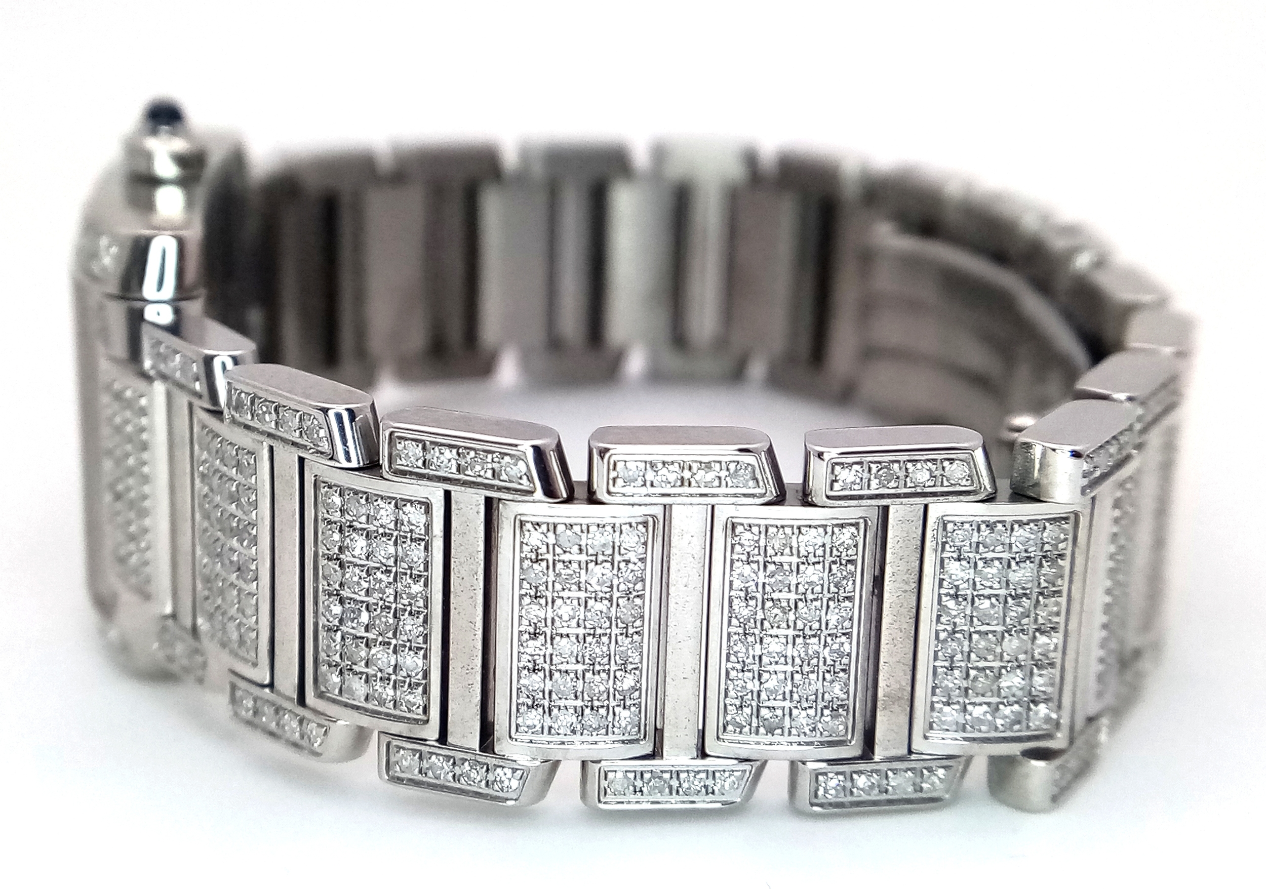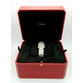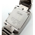 A Classic Cartier Tank Francaise Diamond Ladies Watch. Stainless steel diamond set bracelet. Case - 21mm width. White dial with Roman numeral markers. Sapphire set crown. Diamond set bezel and lugs. Quartz movement, in working order. Comes with an international guarantee card and Cartier case. Note: This watch has been custom fitted with diamonds.