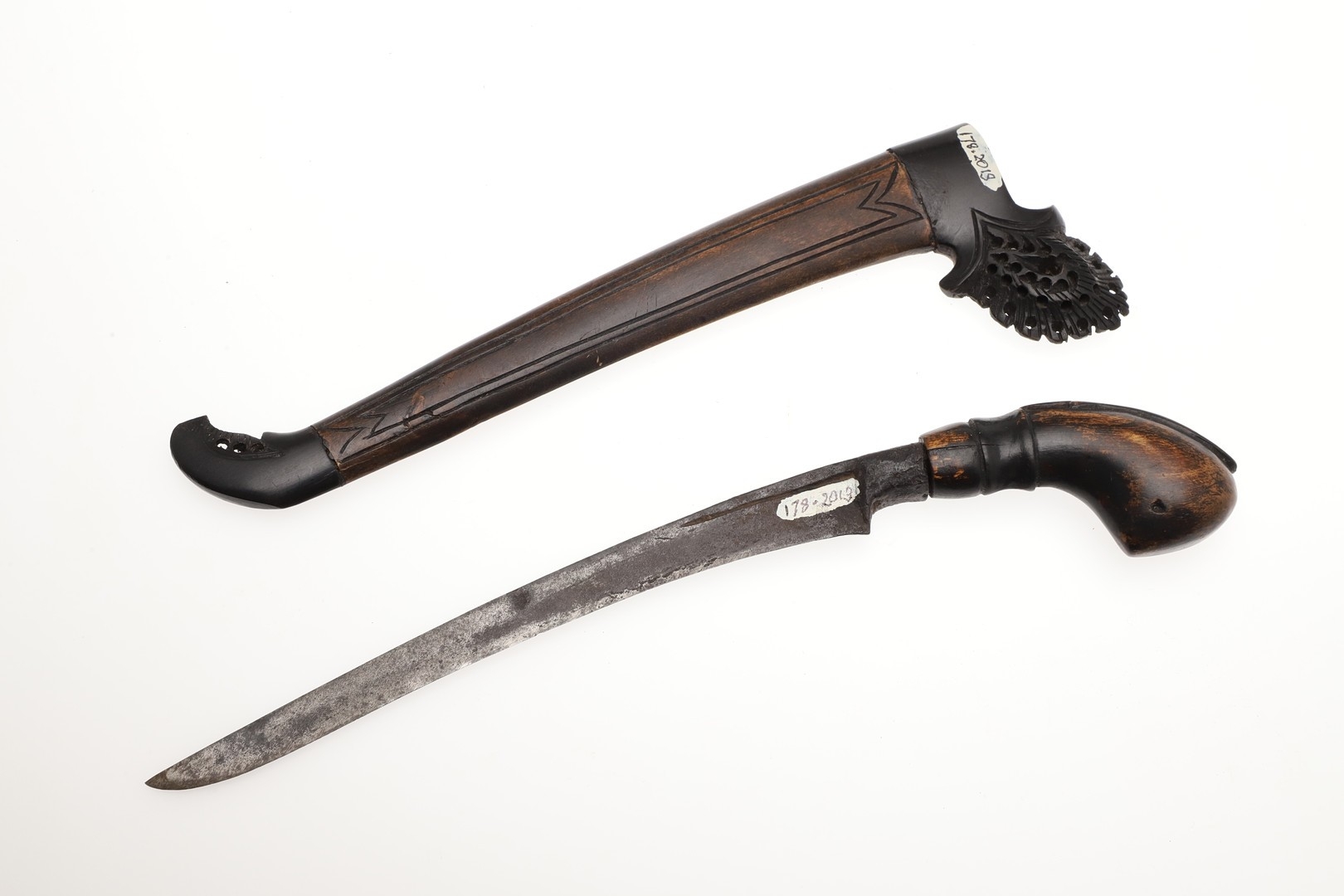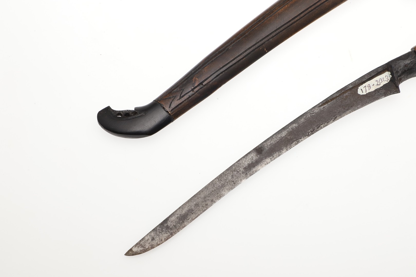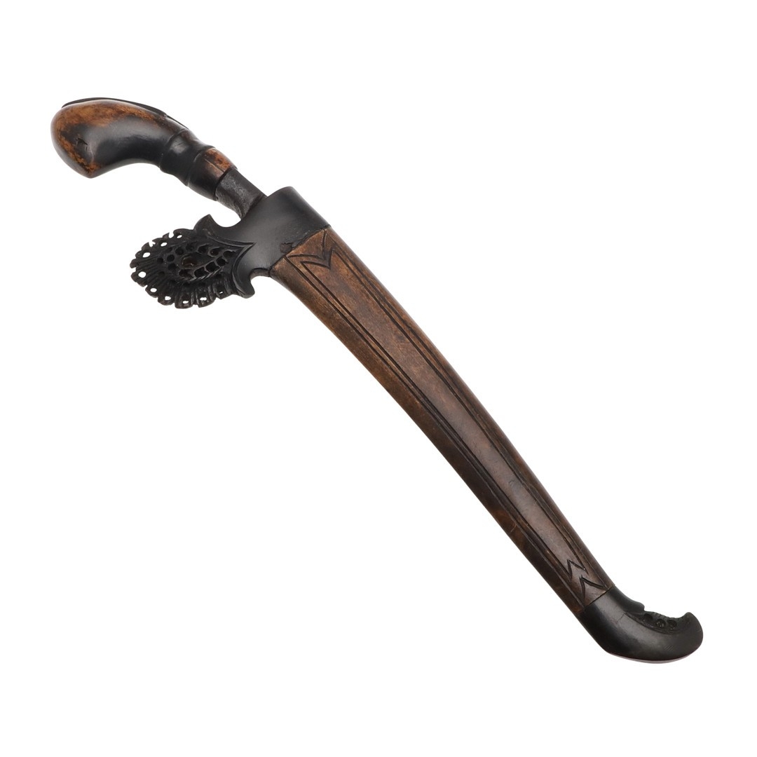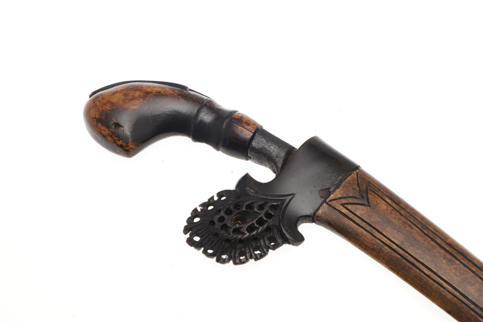 A SUMATRAN TUMBOK LADA DAGGER AND SCABBARD. Having a 16.5 cm slightly curved pointed blade with a short fuller towards the hilt. On a short carved wooden grip, the scabbard with decorative piercings and carved hardwood top, chape and engraved body. 28.5 cm.