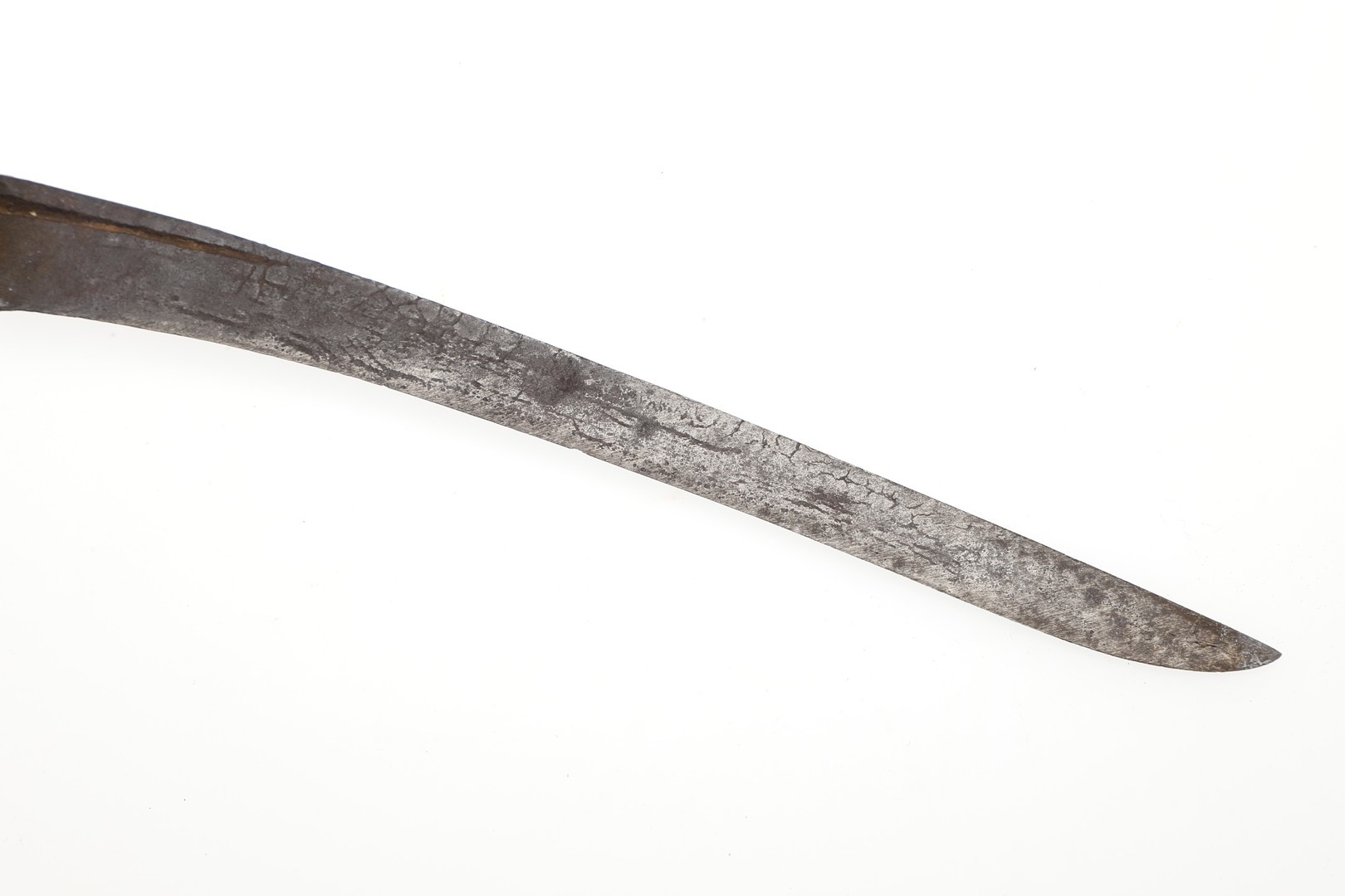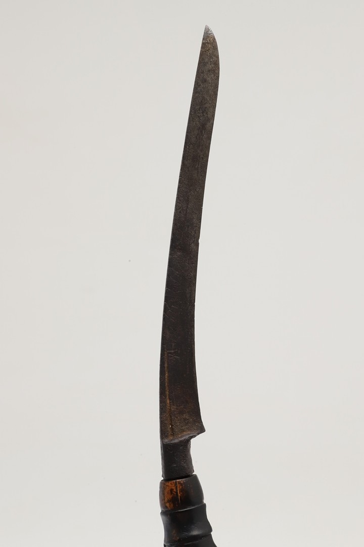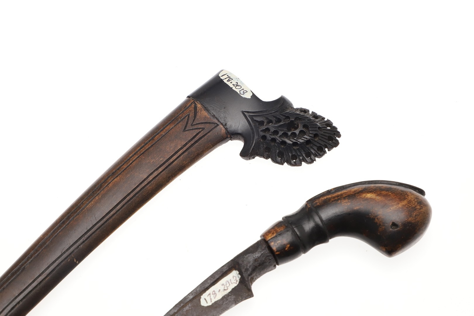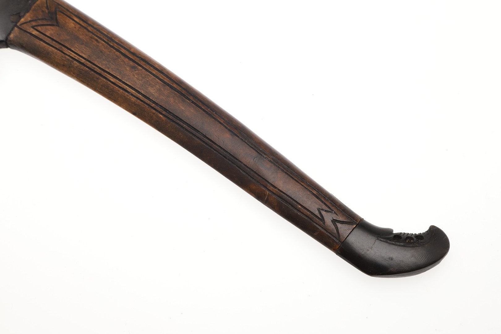 A SUMATRAN TUMBOK LADA DAGGER AND SCABBARD. Having a 16.5 cm slightly curved pointed blade with a short fuller towards the hilt. On a short carved wooden grip, the scabbard with decorative piercings and carved hardwood top, chape and engraved body. 28.5 cm.
