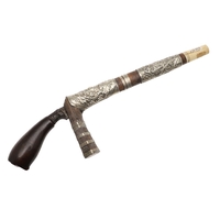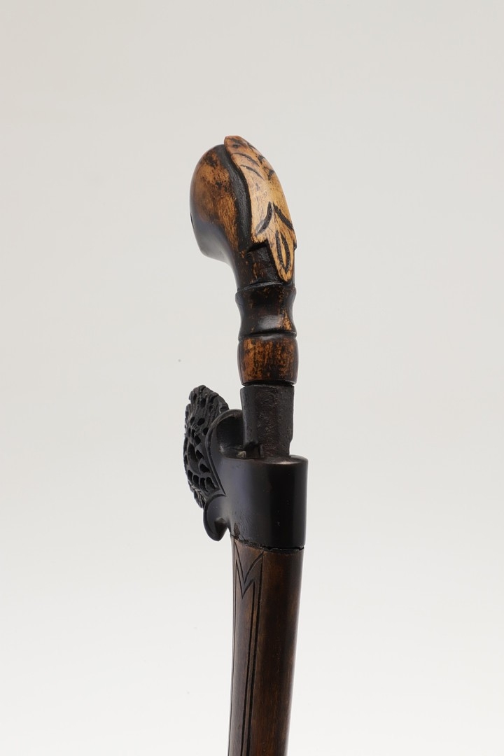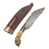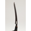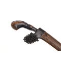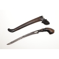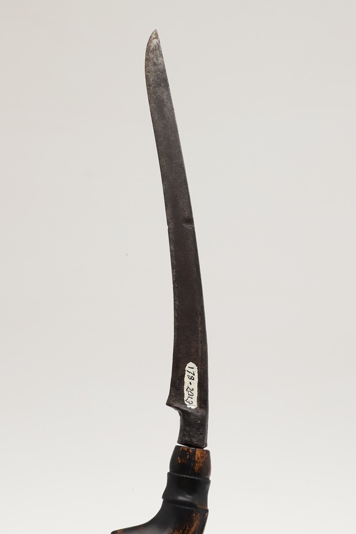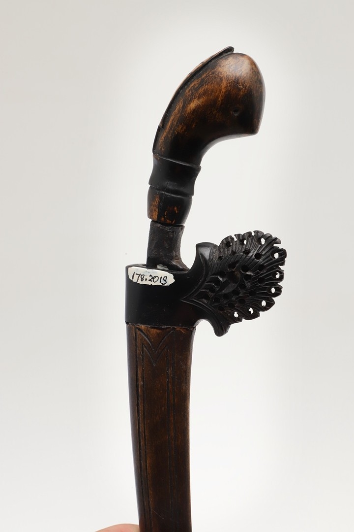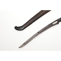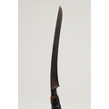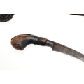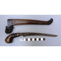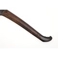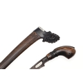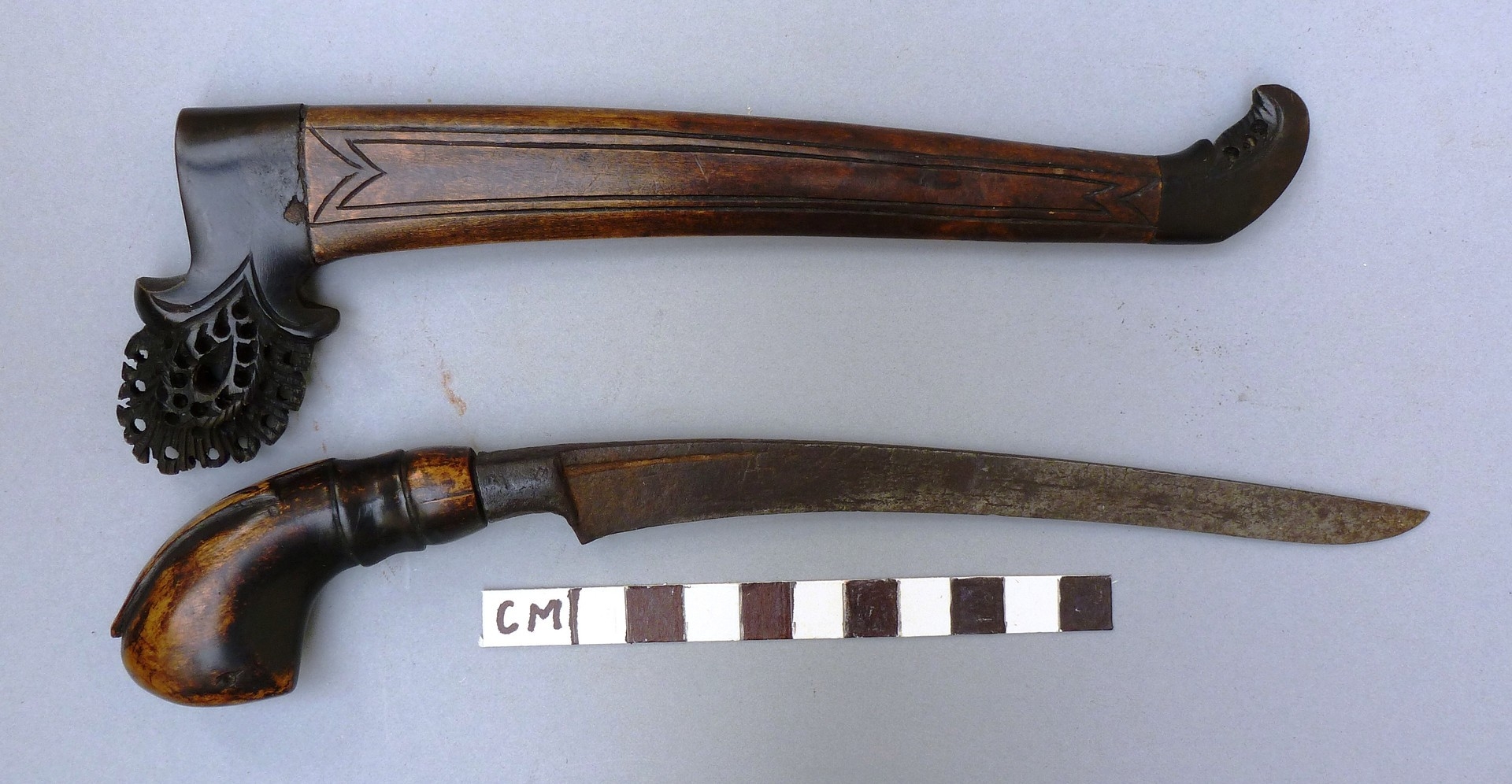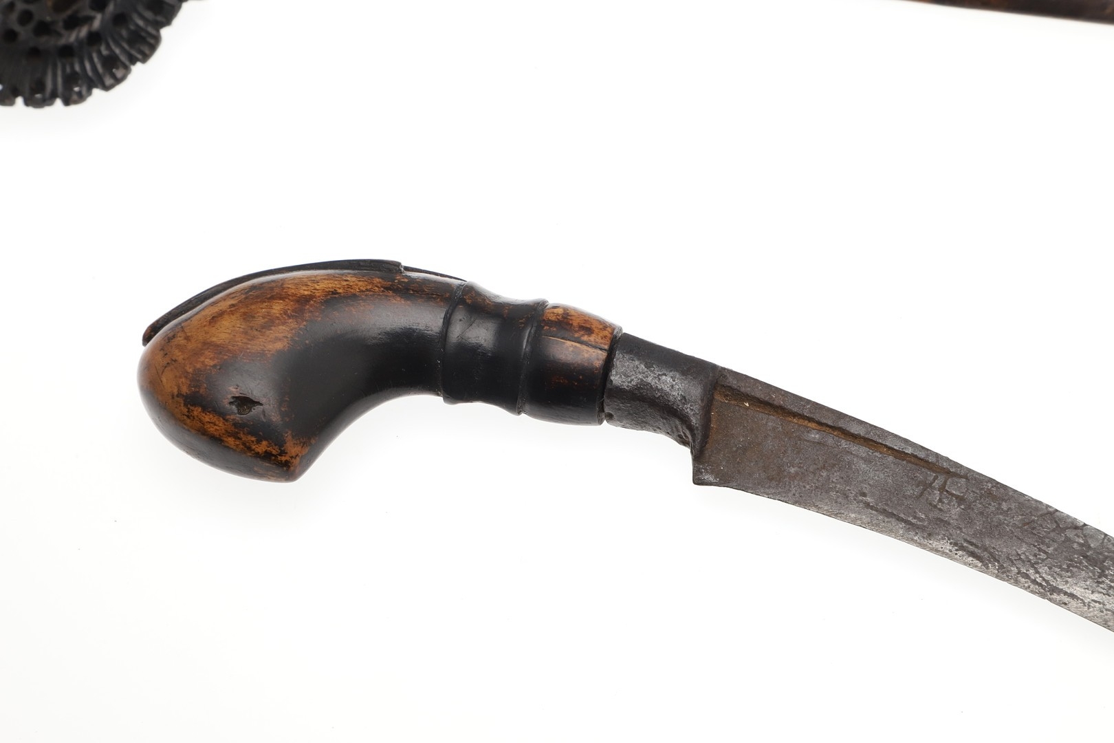 A SUMATRAN TUMBOK LADA DAGGER AND SCABBARD. Having a 16.5 cm slightly curved pointed blade with a short fuller towards the hilt. On a short carved wooden grip, the scabbard with decorative piercings and carved hardwood top, chape and engraved body. 28.5 cm.