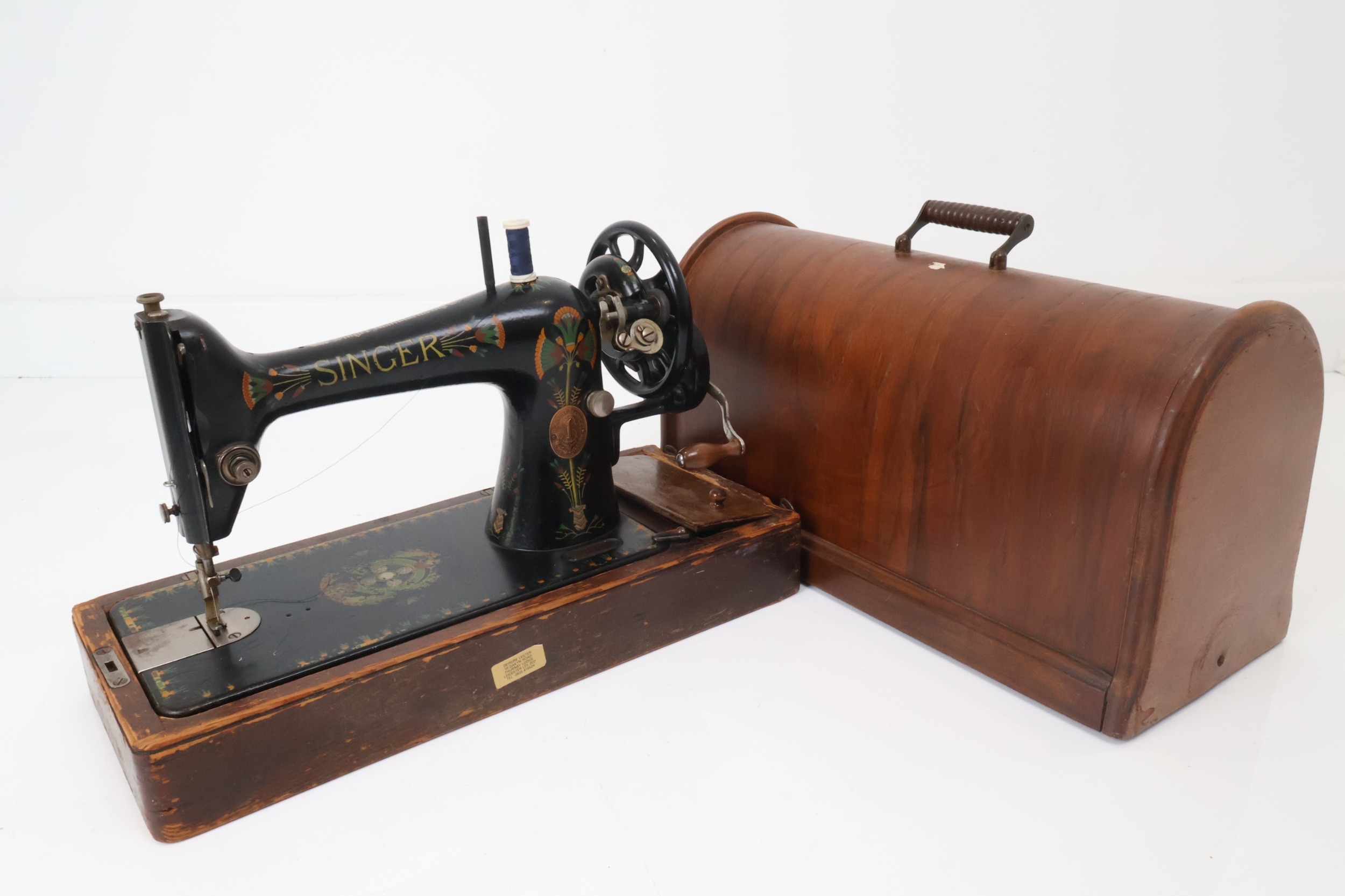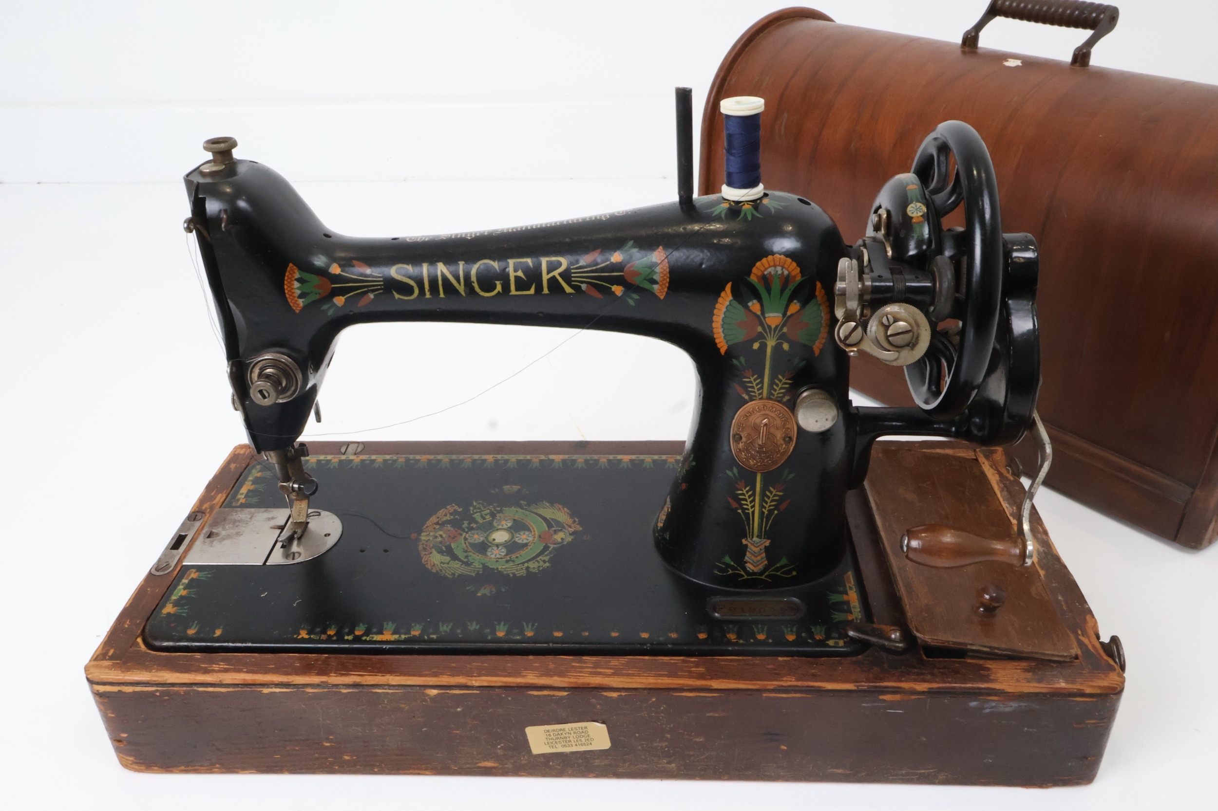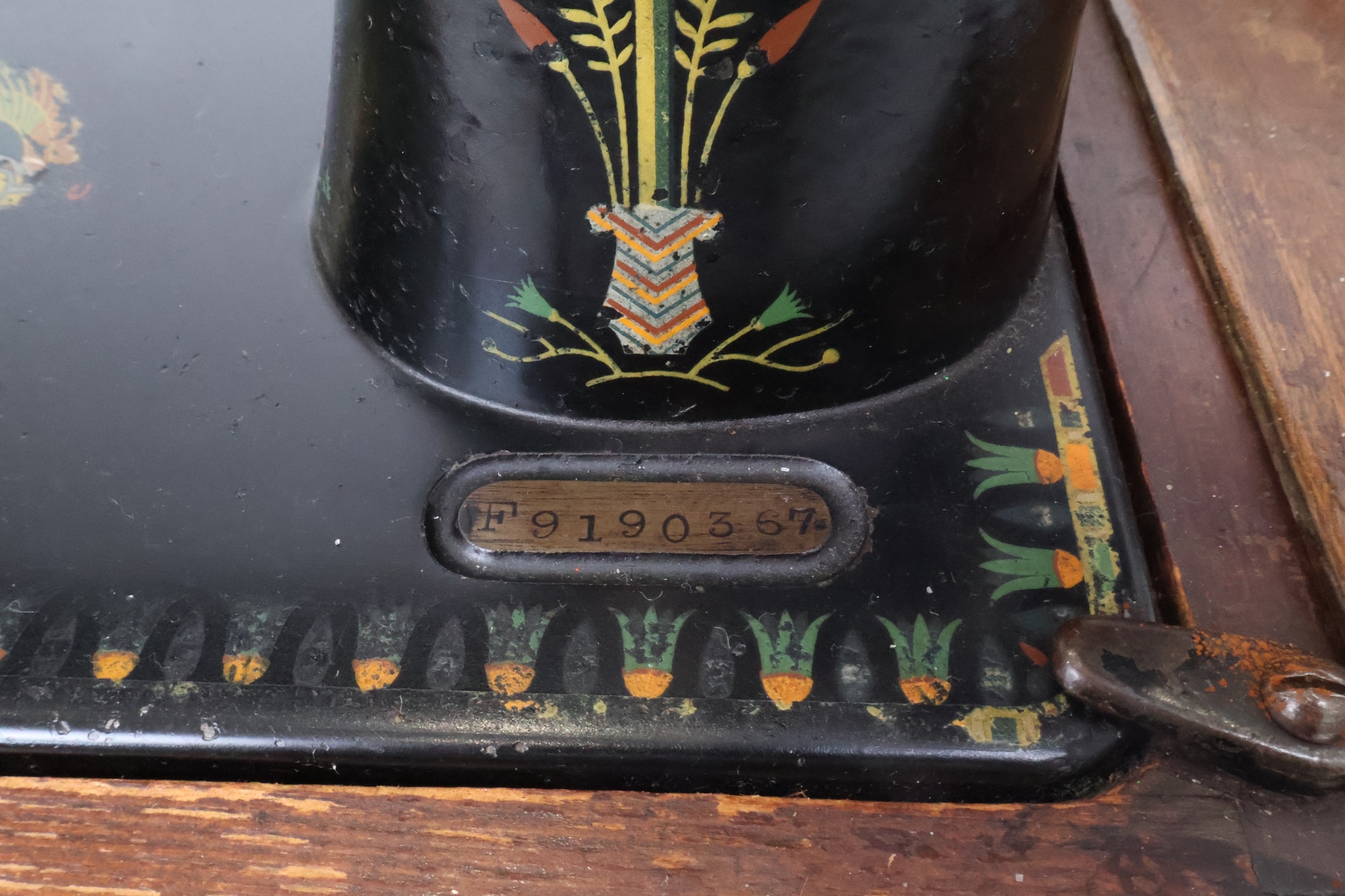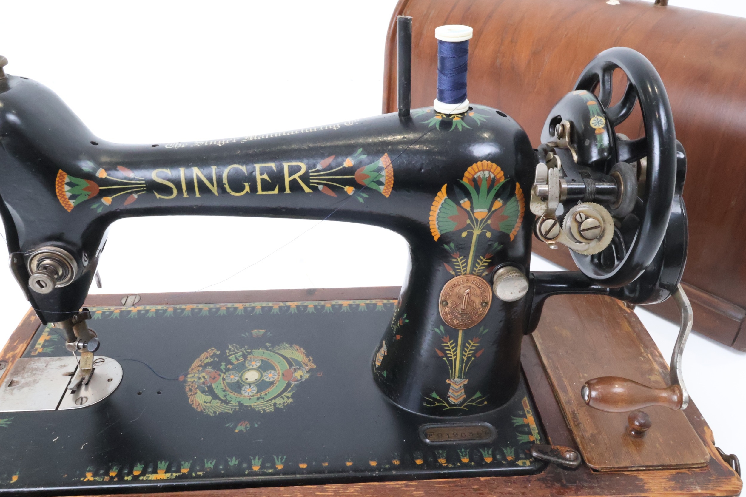 A cased Singer Model 66 Hand Sewing Machine, manufactured circa 1919 at the Clydebank factory, Scotland, as indicated by the 'F' series serial number. The lot includes the black enameled cast iron machine head mounted on a dark-stained wooden base, and its fitted wooden dome carrying case. The machine is heavily decorated with colorful decalcomania consistent with the Egyptian Revival or Sphinx motif style. Visible markings include the brand name SINGER on the arm and the serial number F9190367 on an inlaid plate on the bed. This model is designed for hand operation.