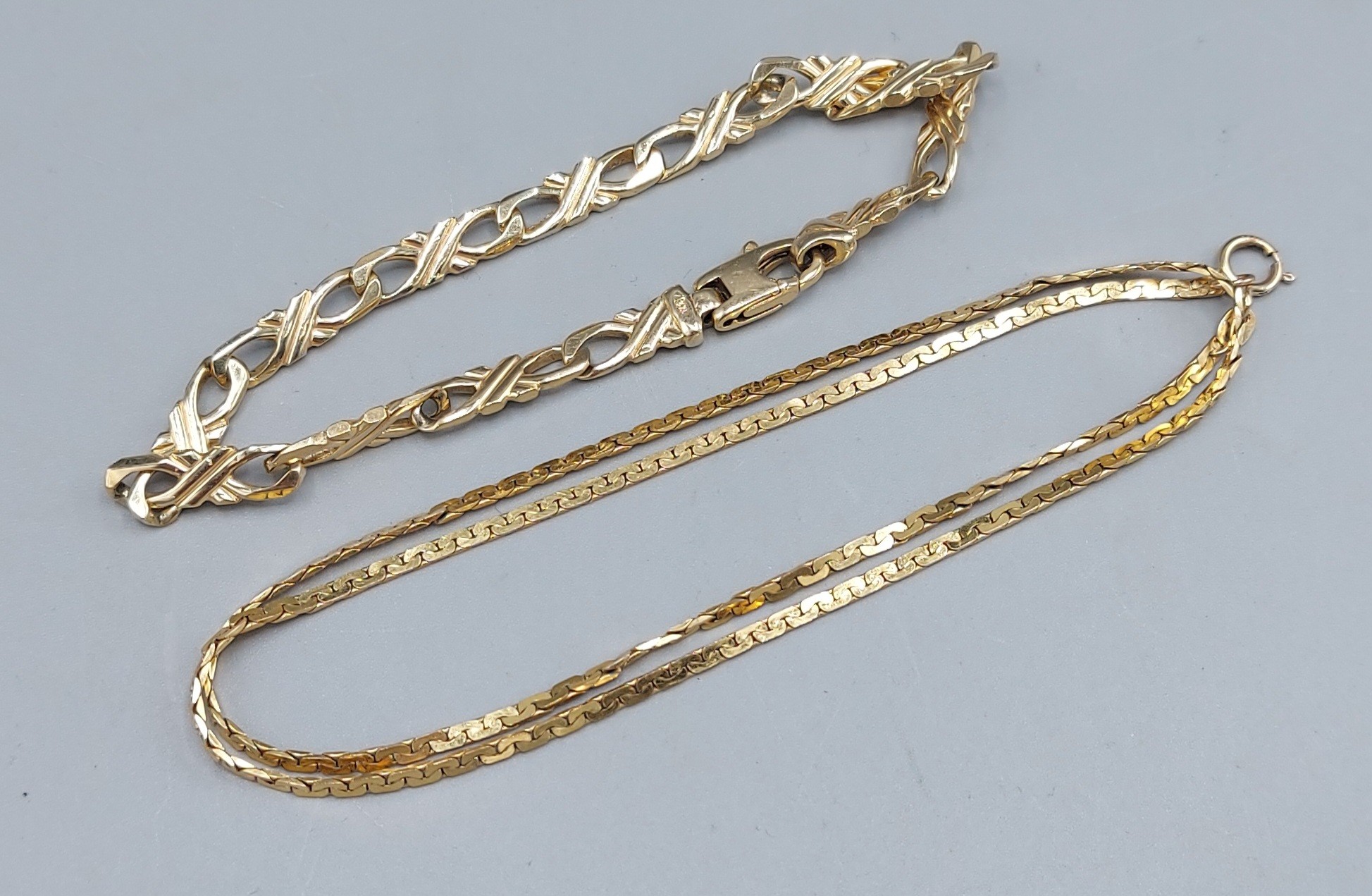 A 9ct gold linked bracelet together with a 9ct gold flat link chain, 14.2gms