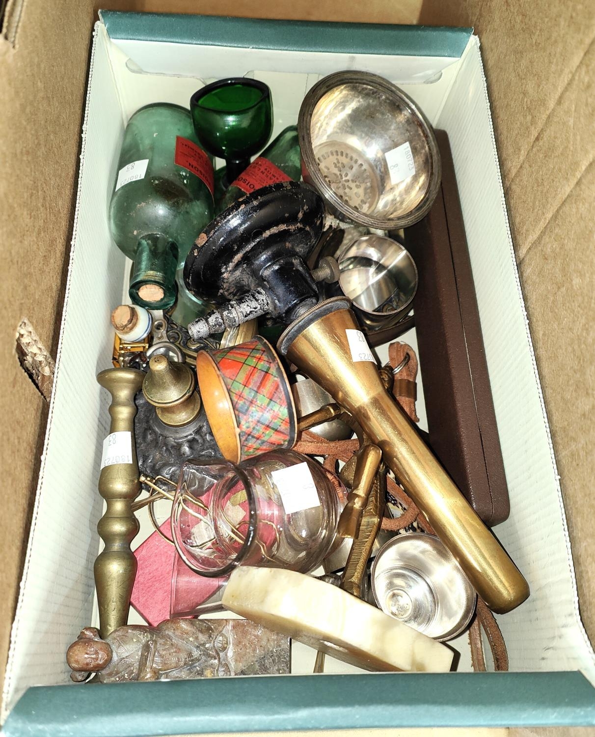 An Old Sheffield Plate wine funnel; a Bunsen burner; other collectables