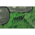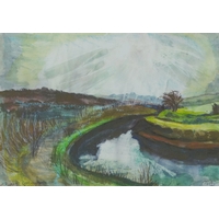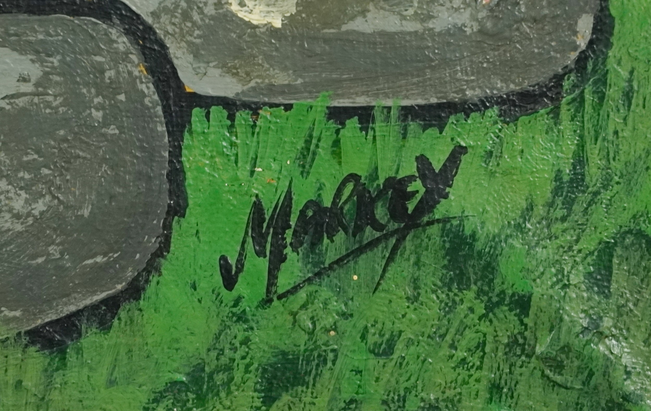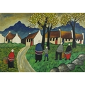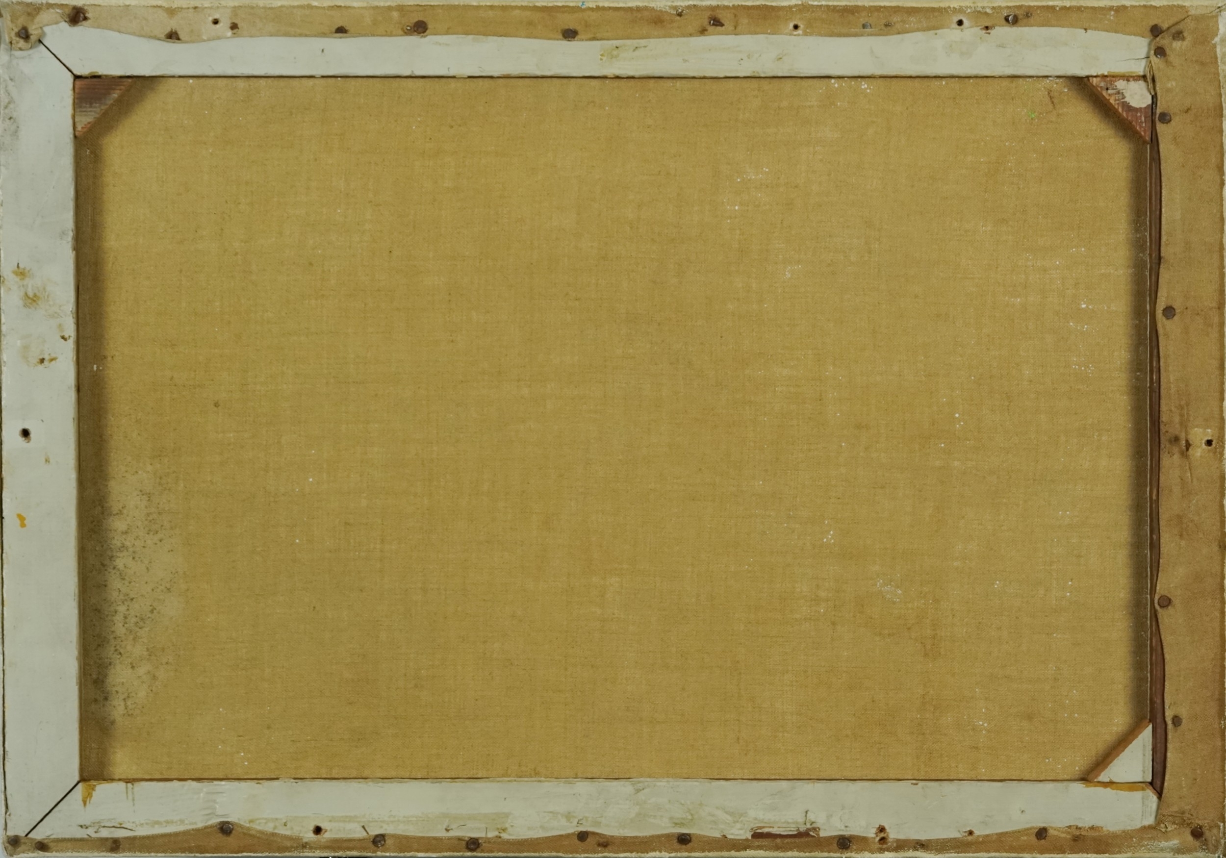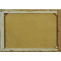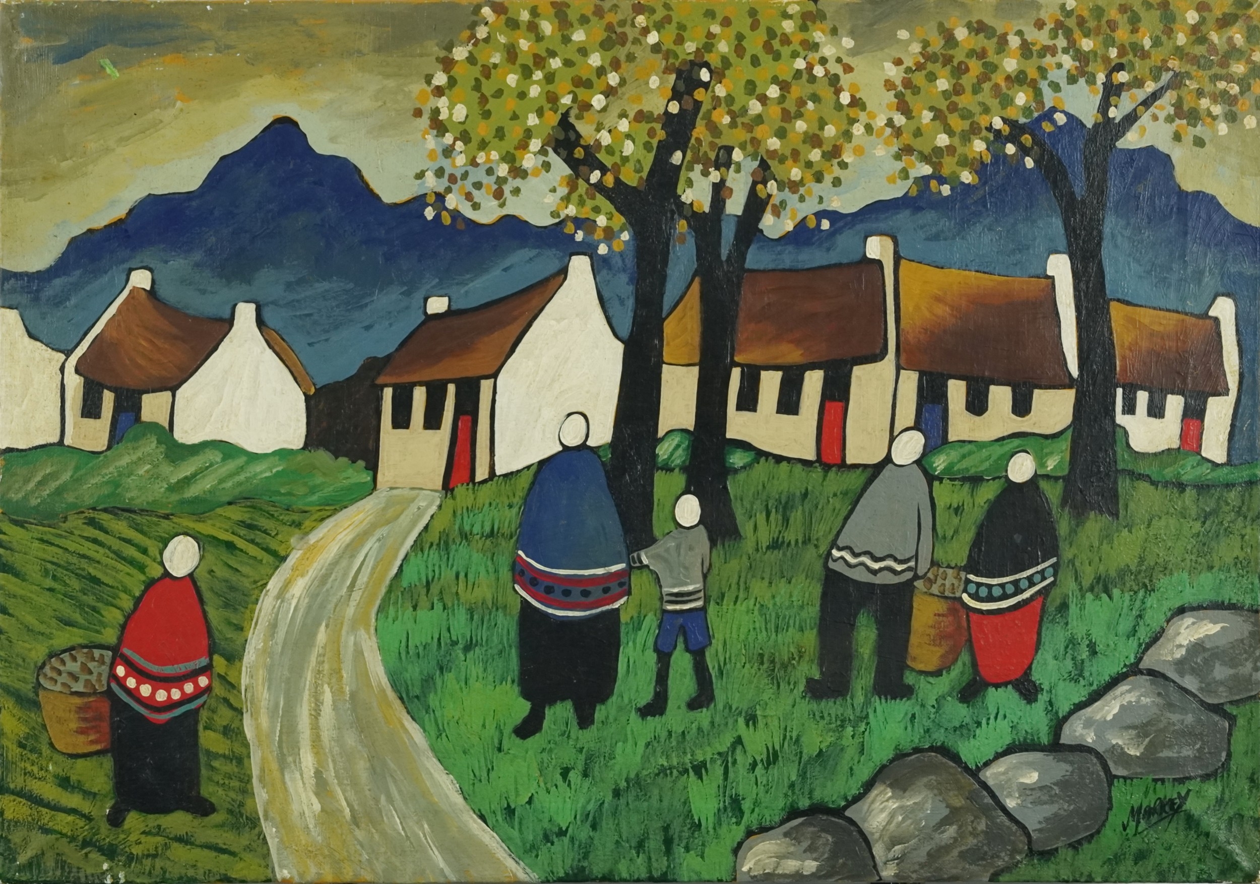 In the manner of Markey Robinson, figure before buildings, 20th century Irish school oil on canvas, unframed, 42cm x 61cm.