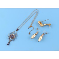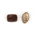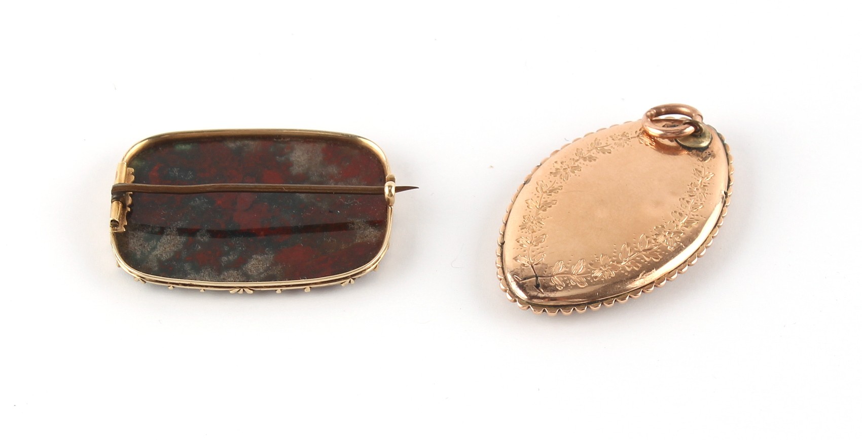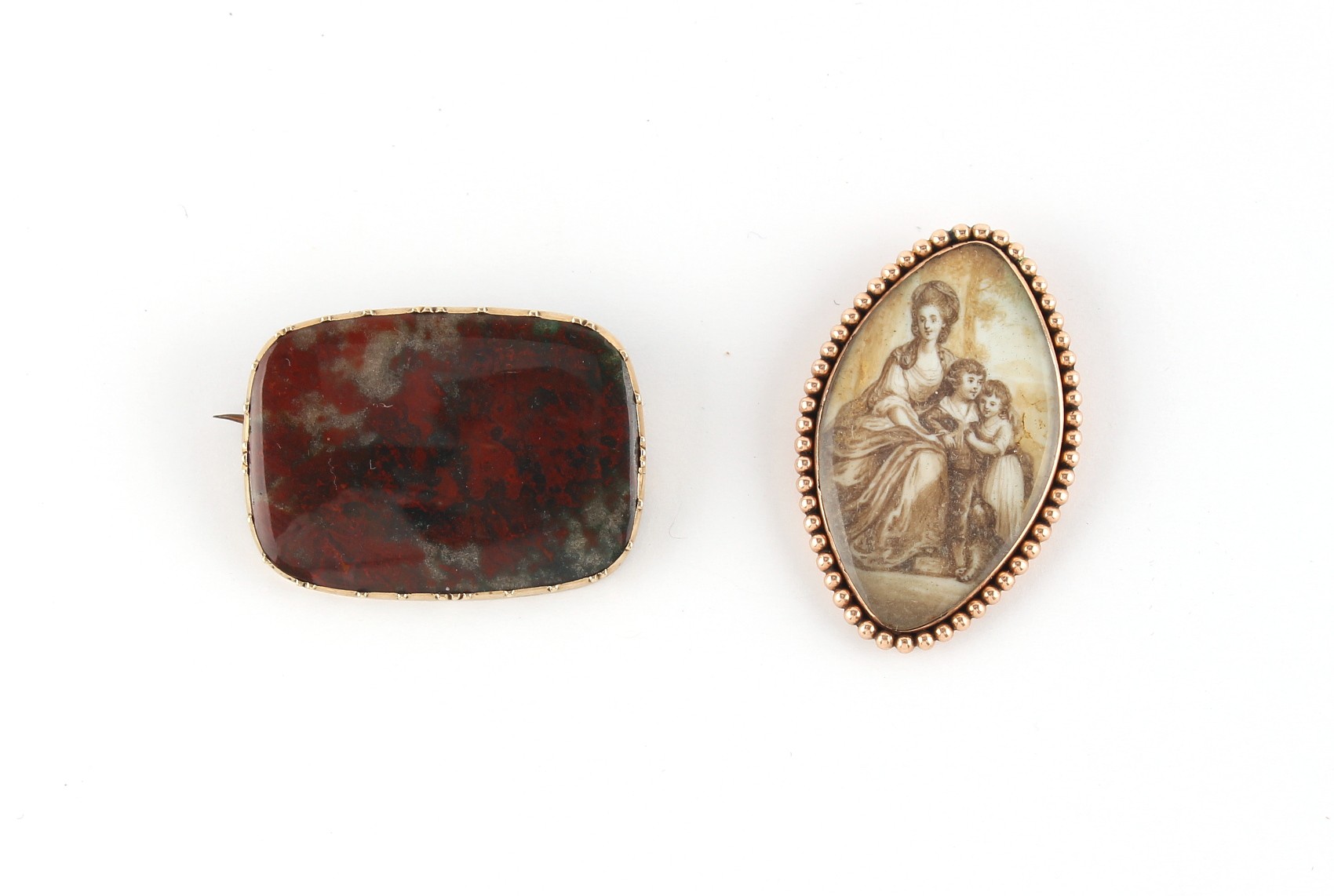 Property of a deceased estate - a Georgian unmarked gold (tested) navette shaped pendant painted en grisaille with a Lady and Two Children, 40mm long, approximately 9.1 grams (gross); together with an unmarked gold (tested) agate rounded rectangular brooch (2).