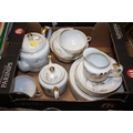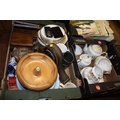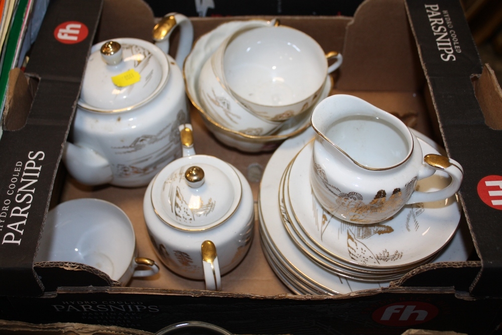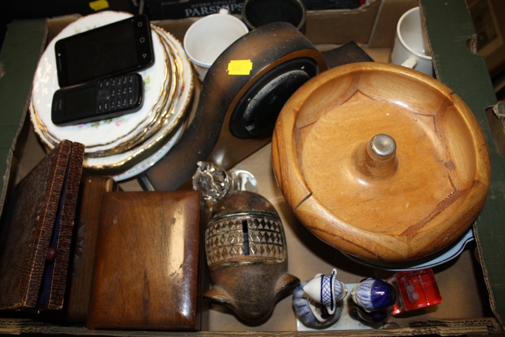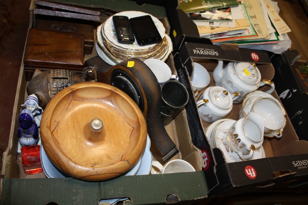A TRAY OF ASSORTED COLLECTABLES TO INCLUDE A CRYSTAL CAT FIGURE, MOBILE PHONES ETC, TOGETHER WITH A SMALL TRAY OF HAYASI CHINA (2)