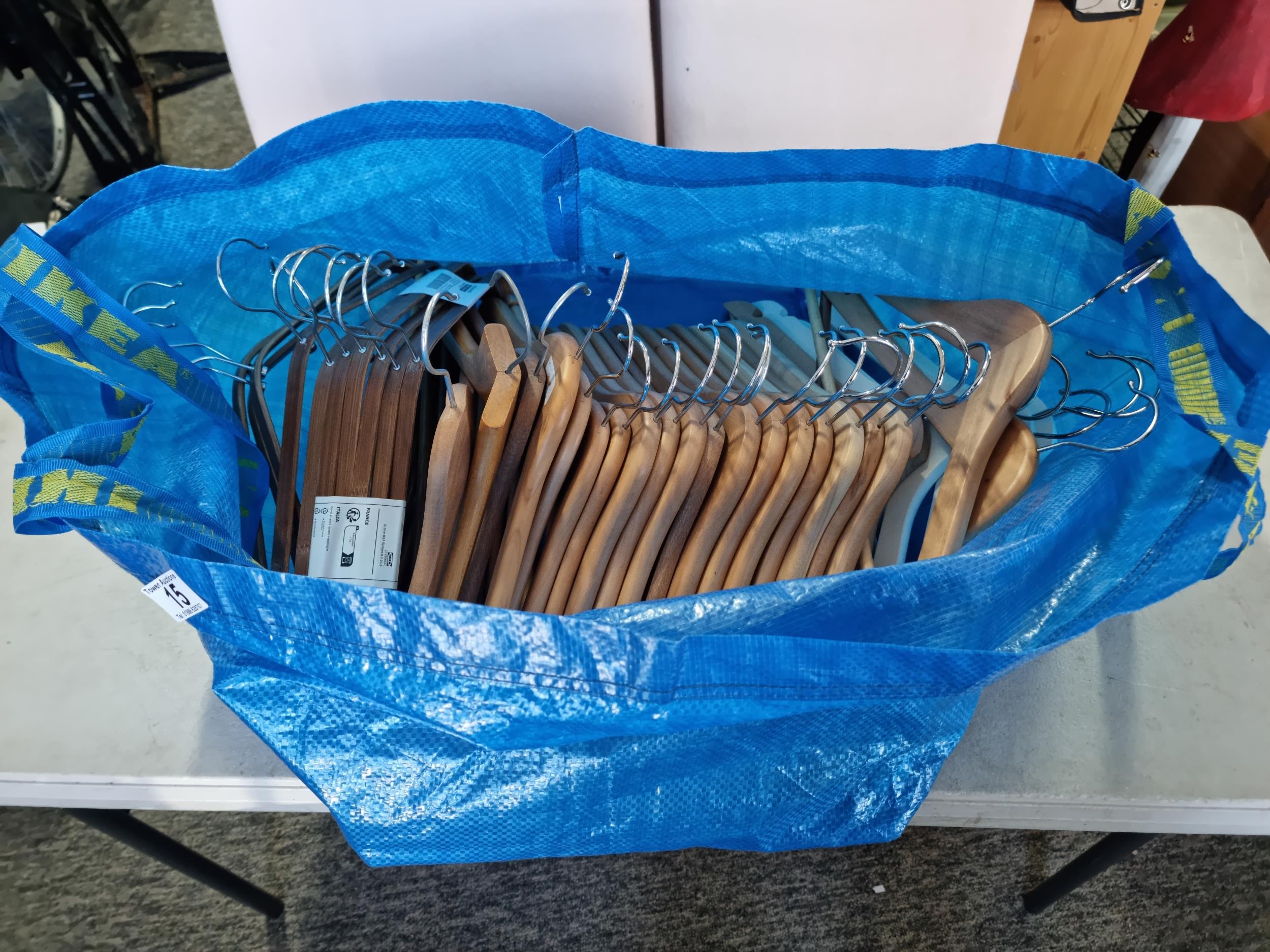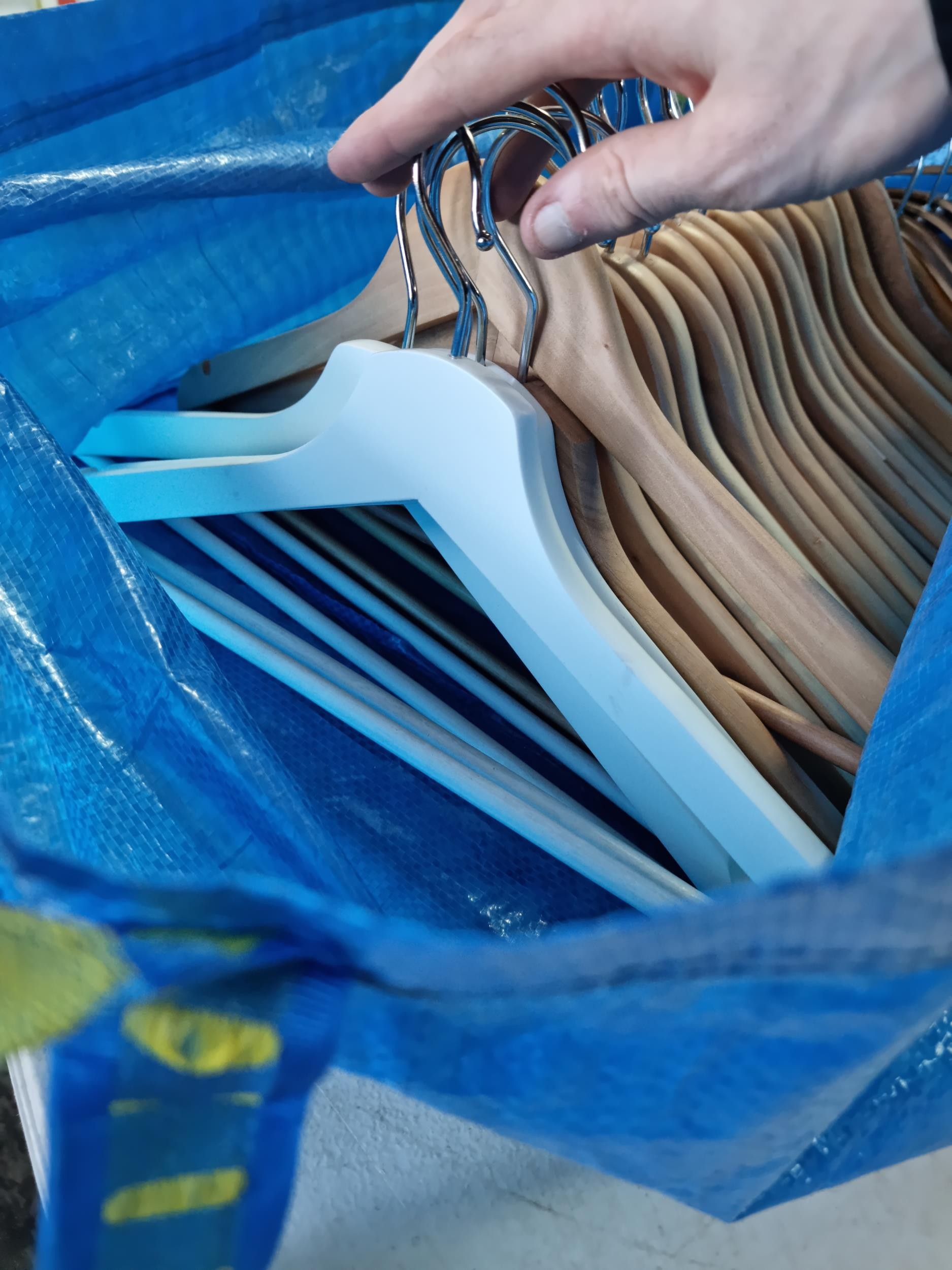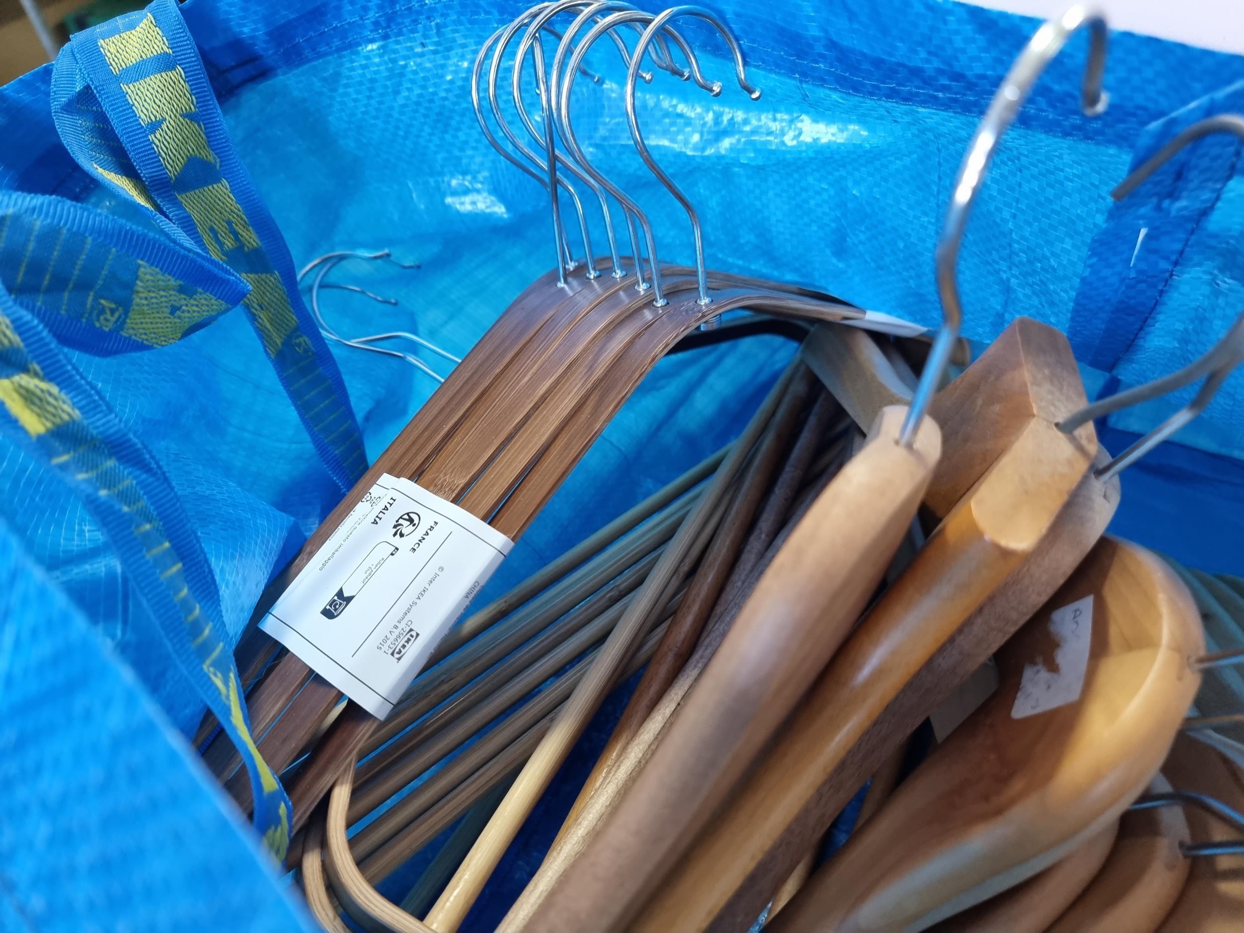 Ikea bag containing a large quantity of as new wooden Ikea coat hangers, 35x in total to include 4x white wooden hangers.