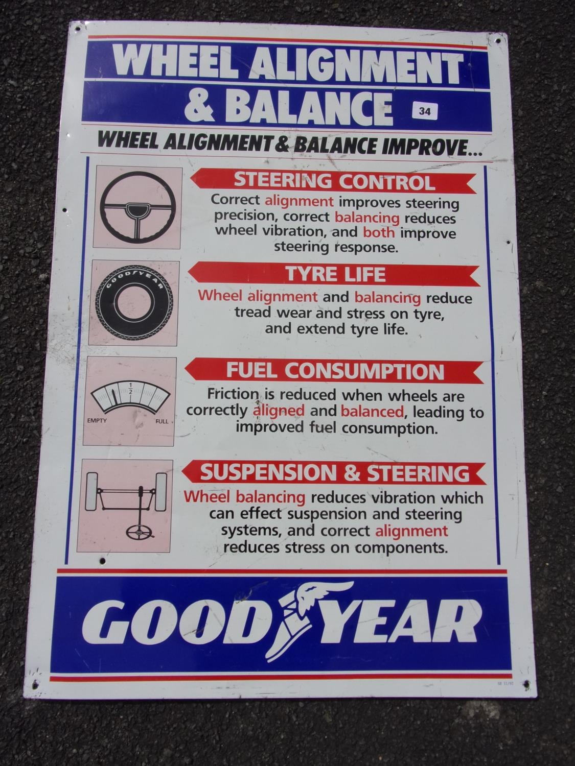 TIN ADVERTISING SIGN GOODYEAR WHEEL ALIGNMENT & BALANCE APPROX 21.5 INS X 31 INS