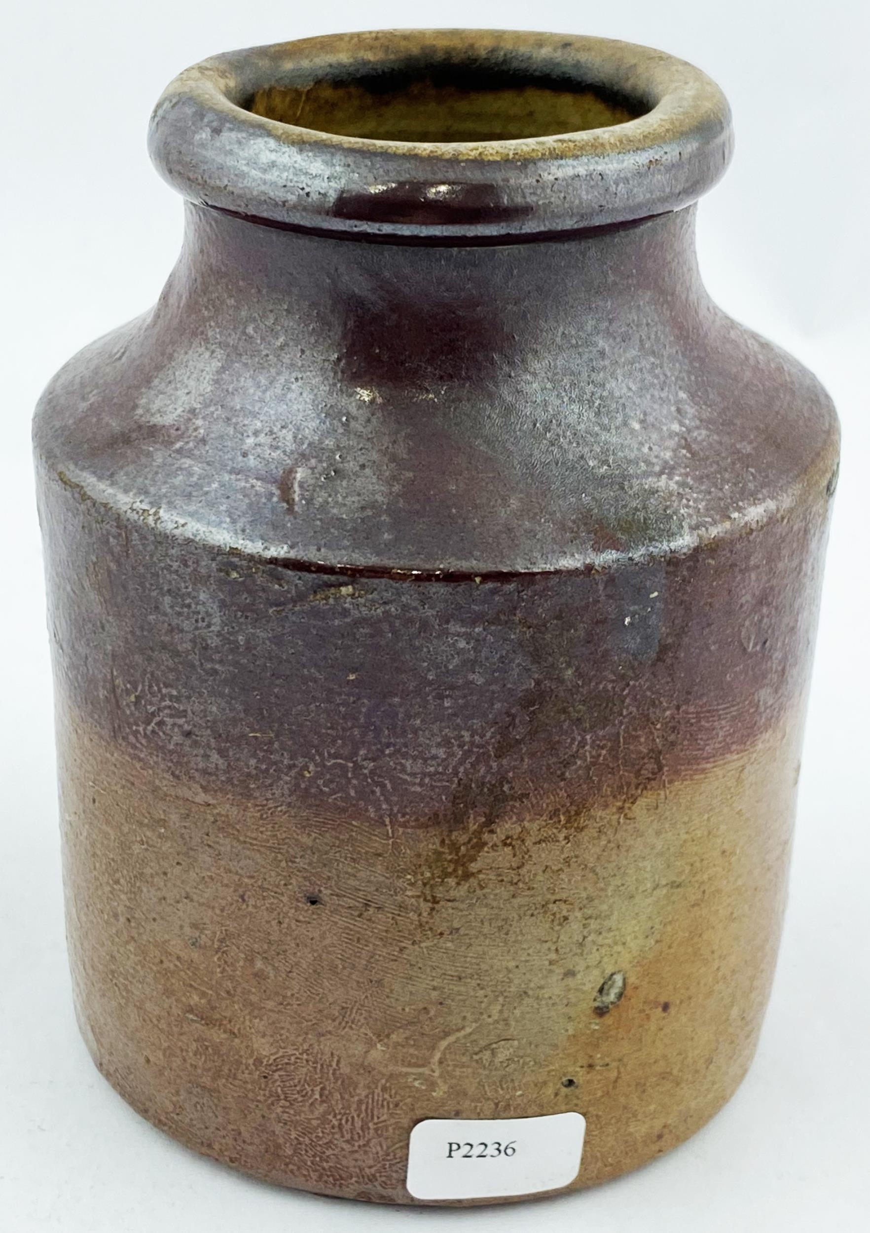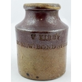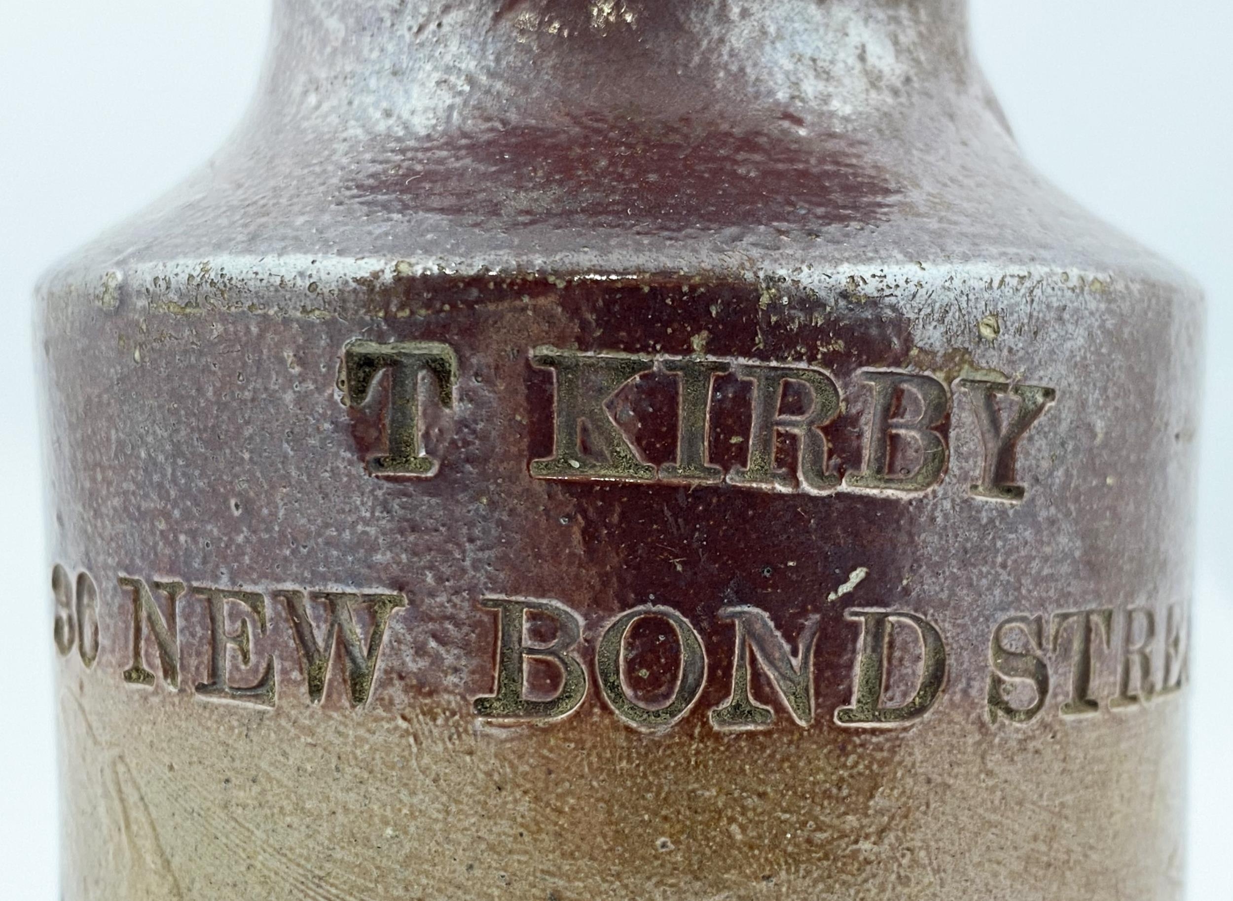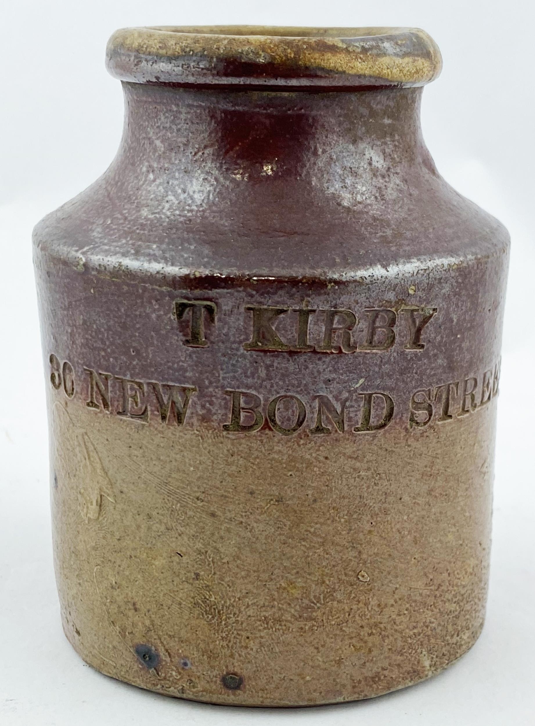 SALTGLAZED JAR. 4ins tall. Impressed T KIRBY/ 36 NEW BOND STREET.
