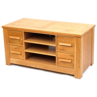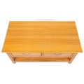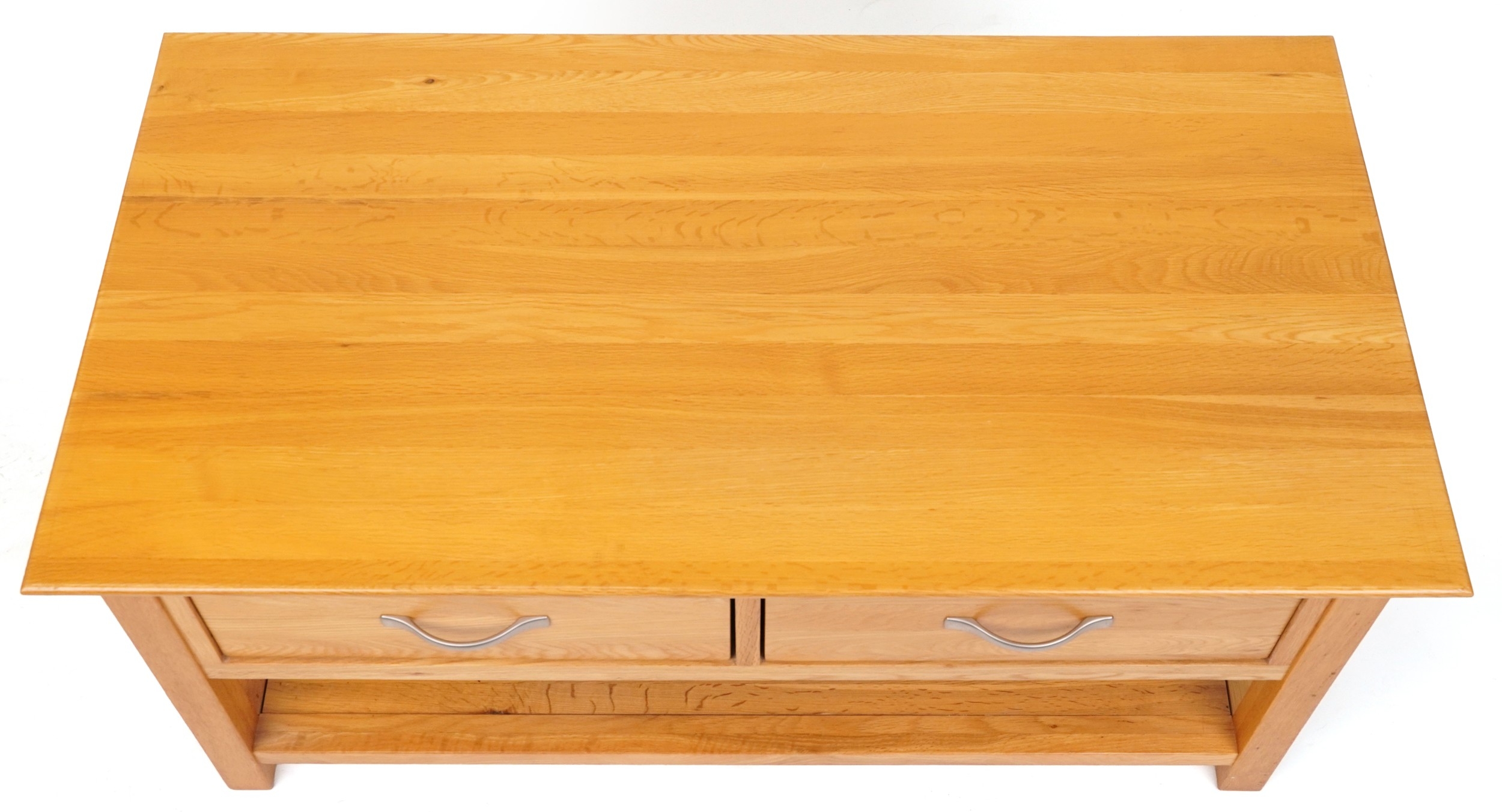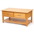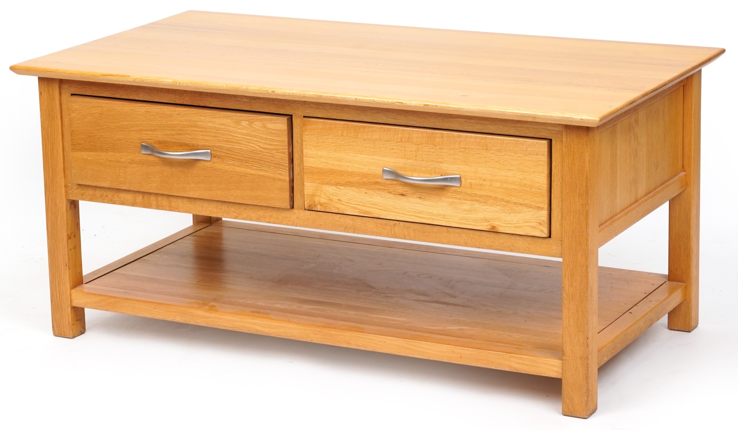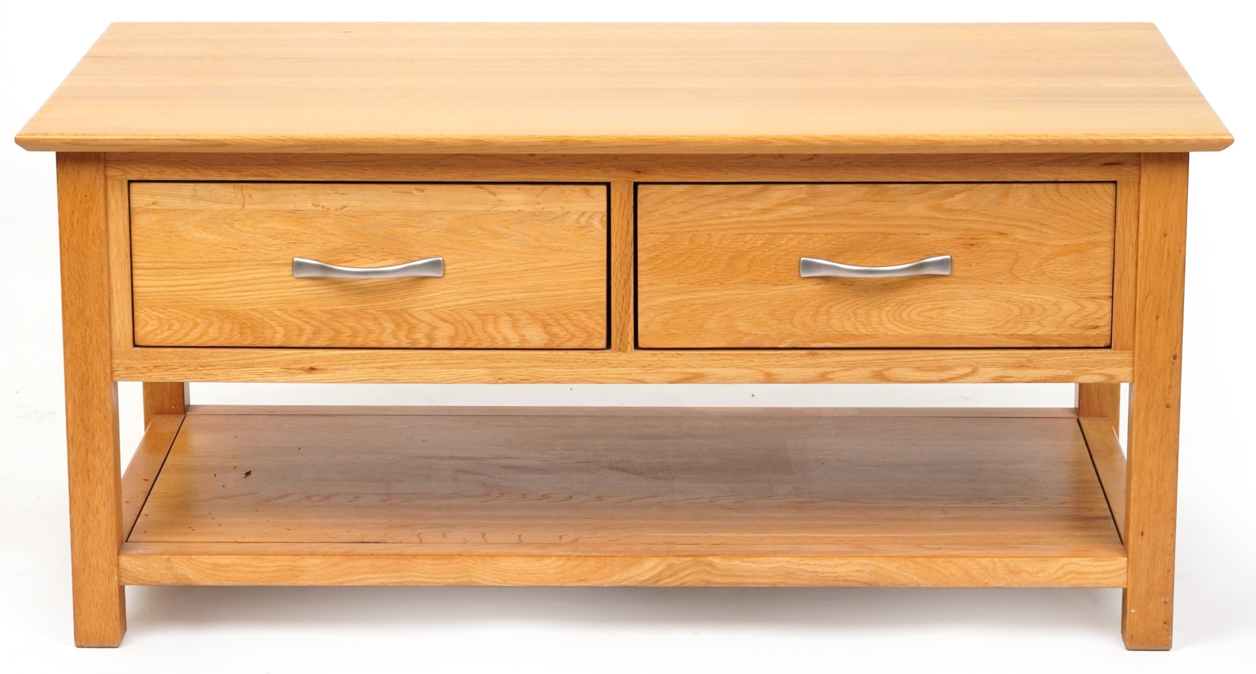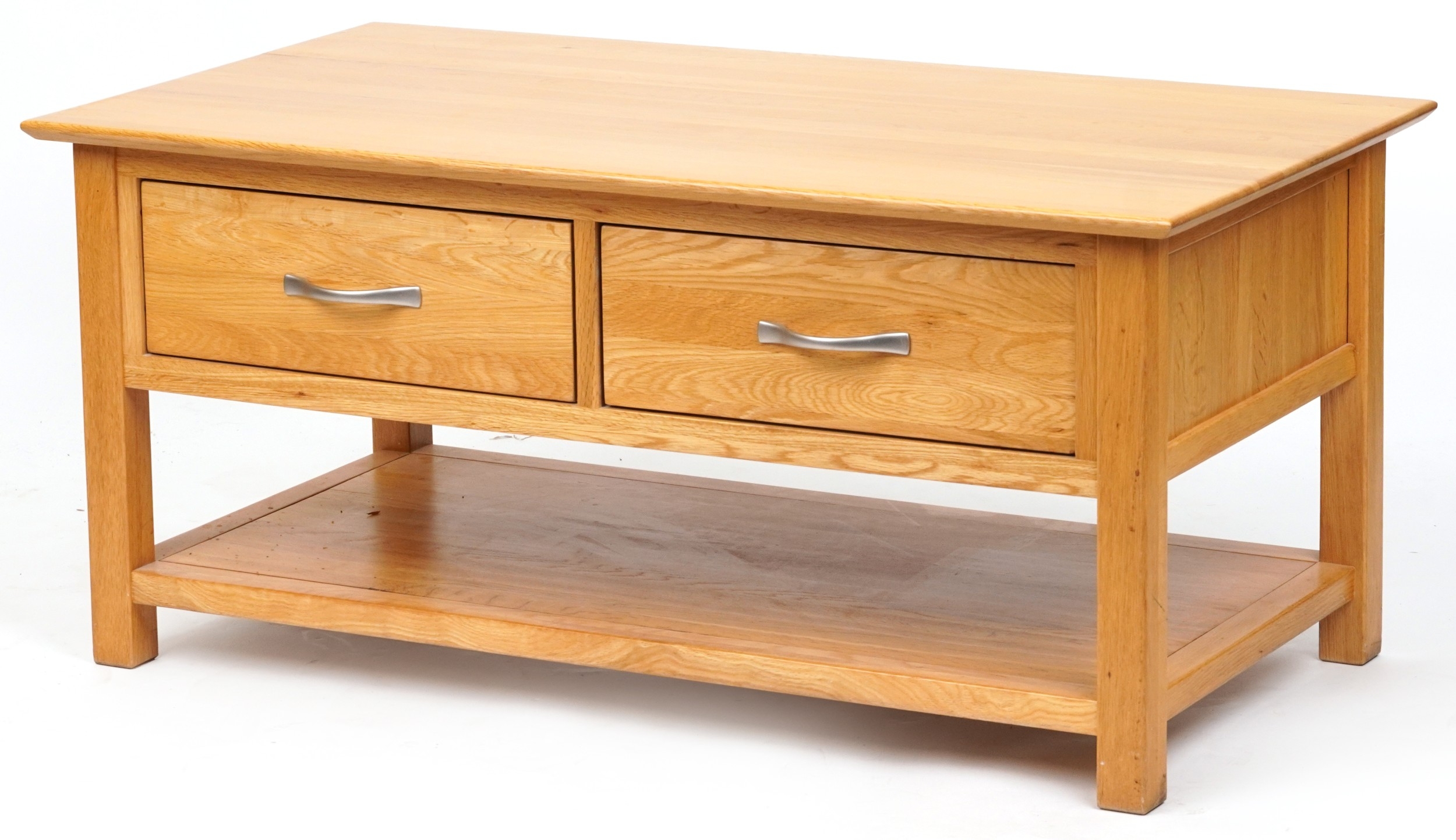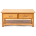 A modern oak coffee table fitted with two drawers above and under tier, 50cm H x 109cm W x 58cm D.