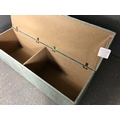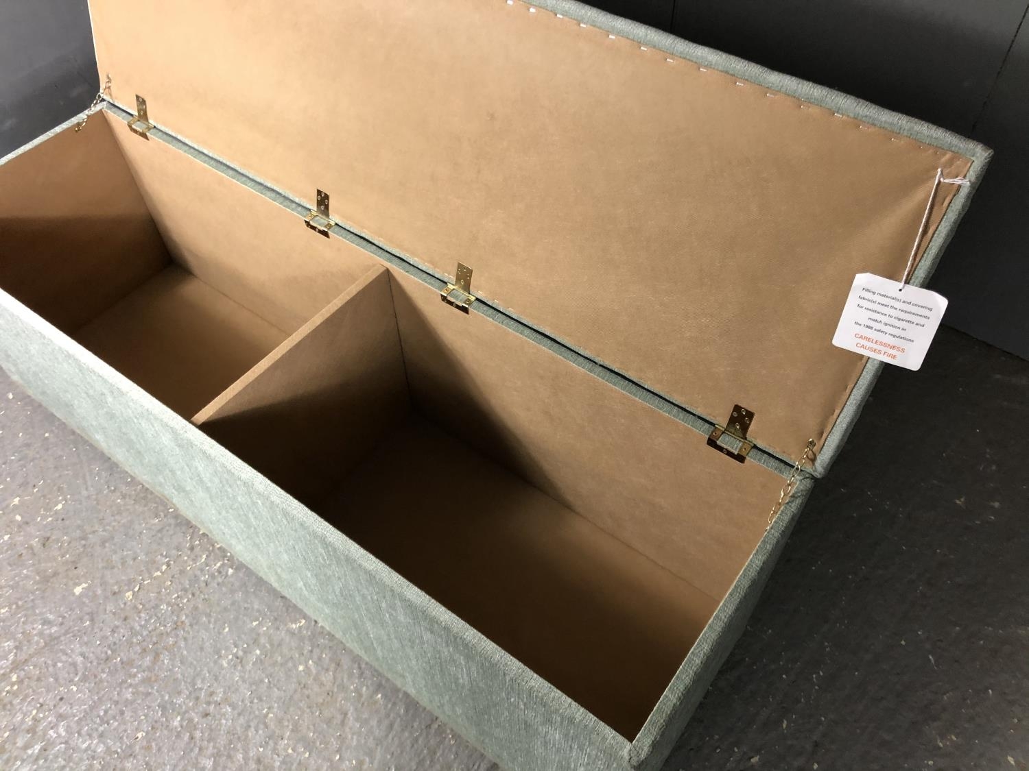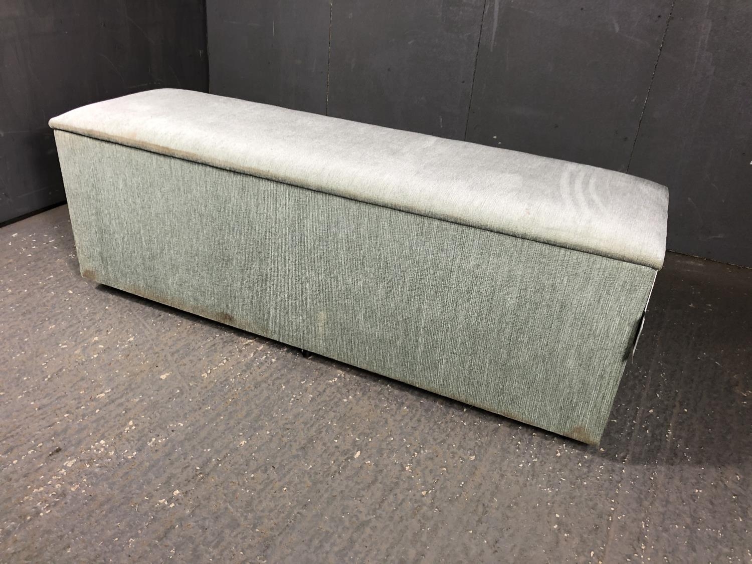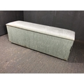 A long blue upholstered blanket box