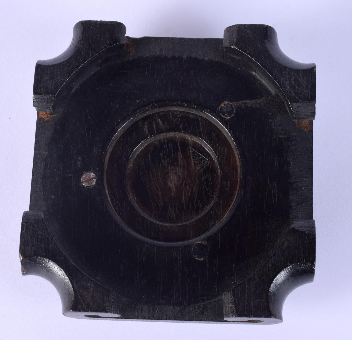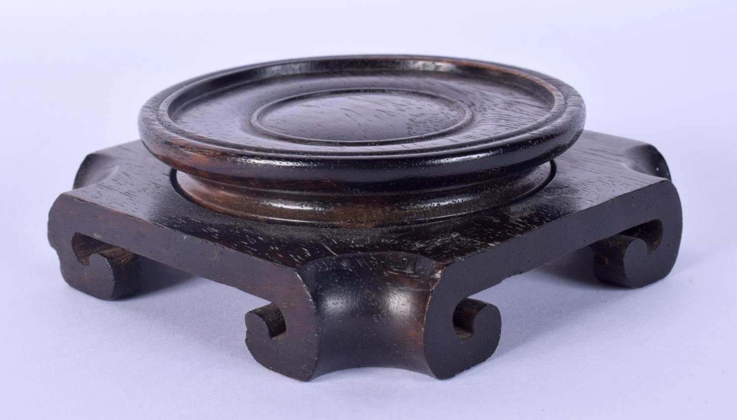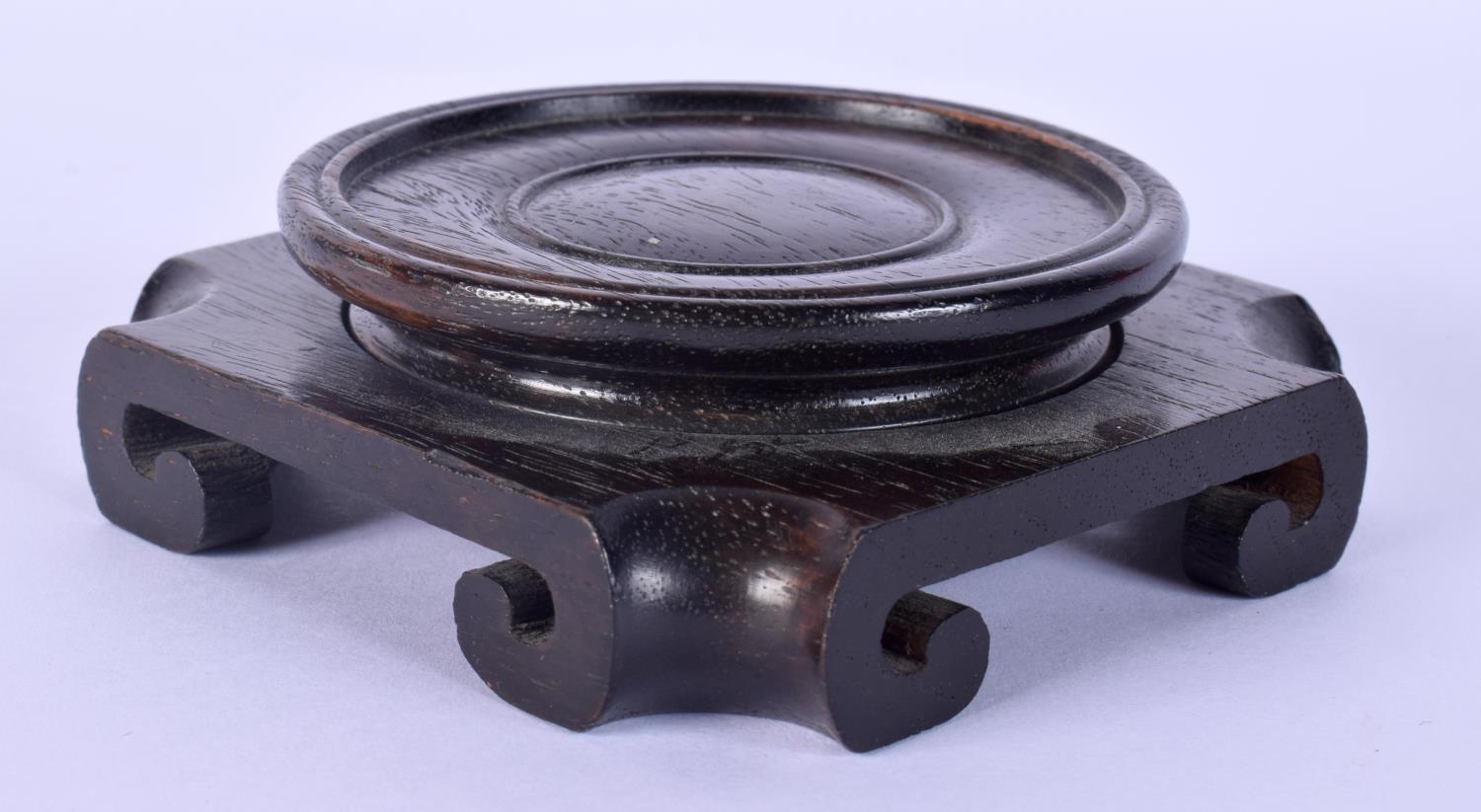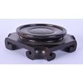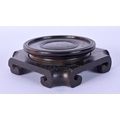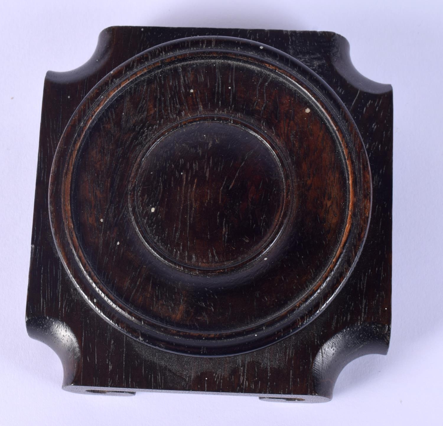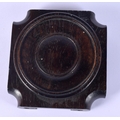 A 19TH CENTURY CHINESE CARVED HARDWOOD SQUARE FORM STAND possibly Zitan. 10.5 cm wide.