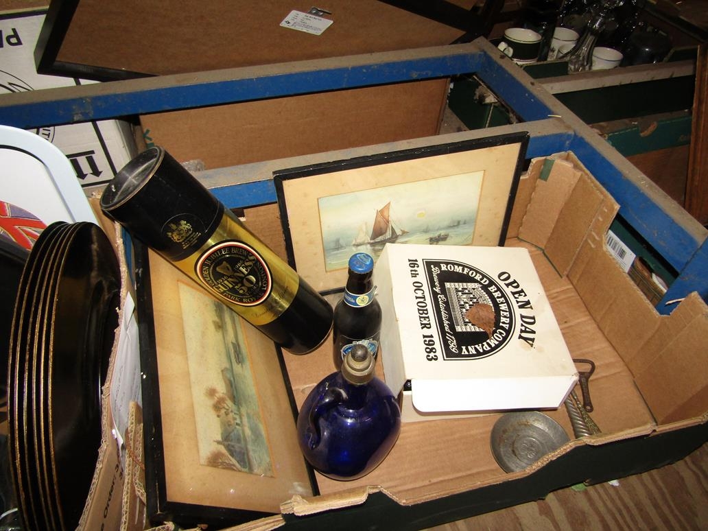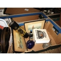 BOX TO INCL WATERCOLOURS, GLASSWARE ETC