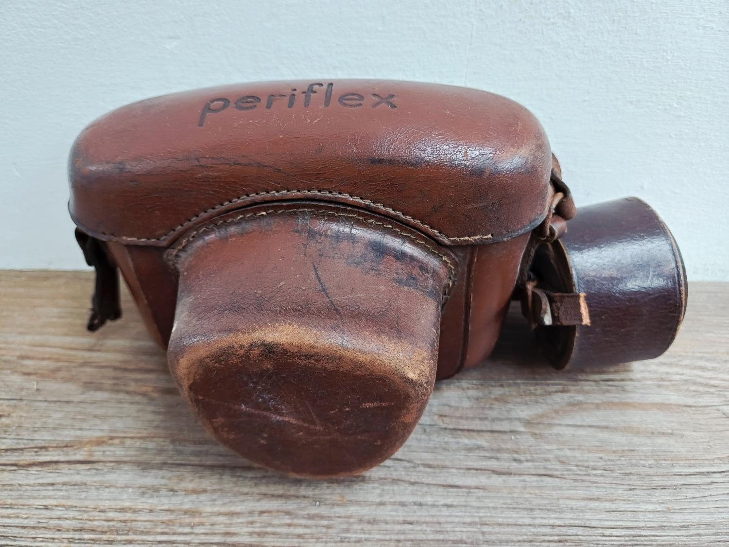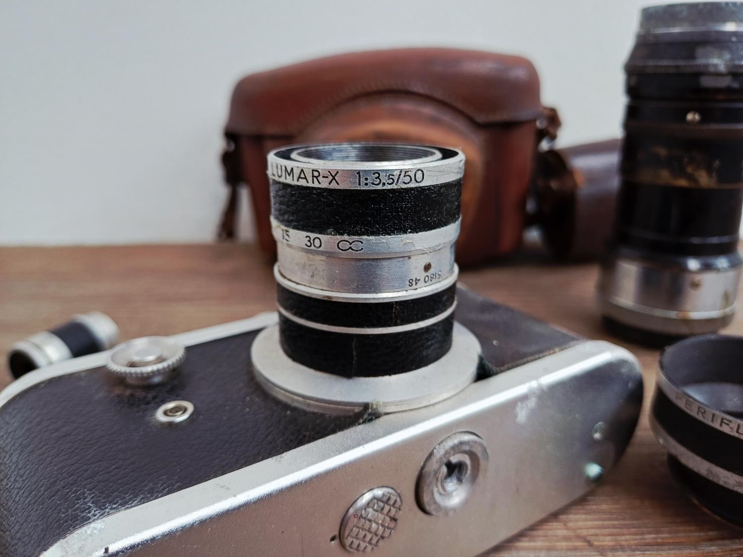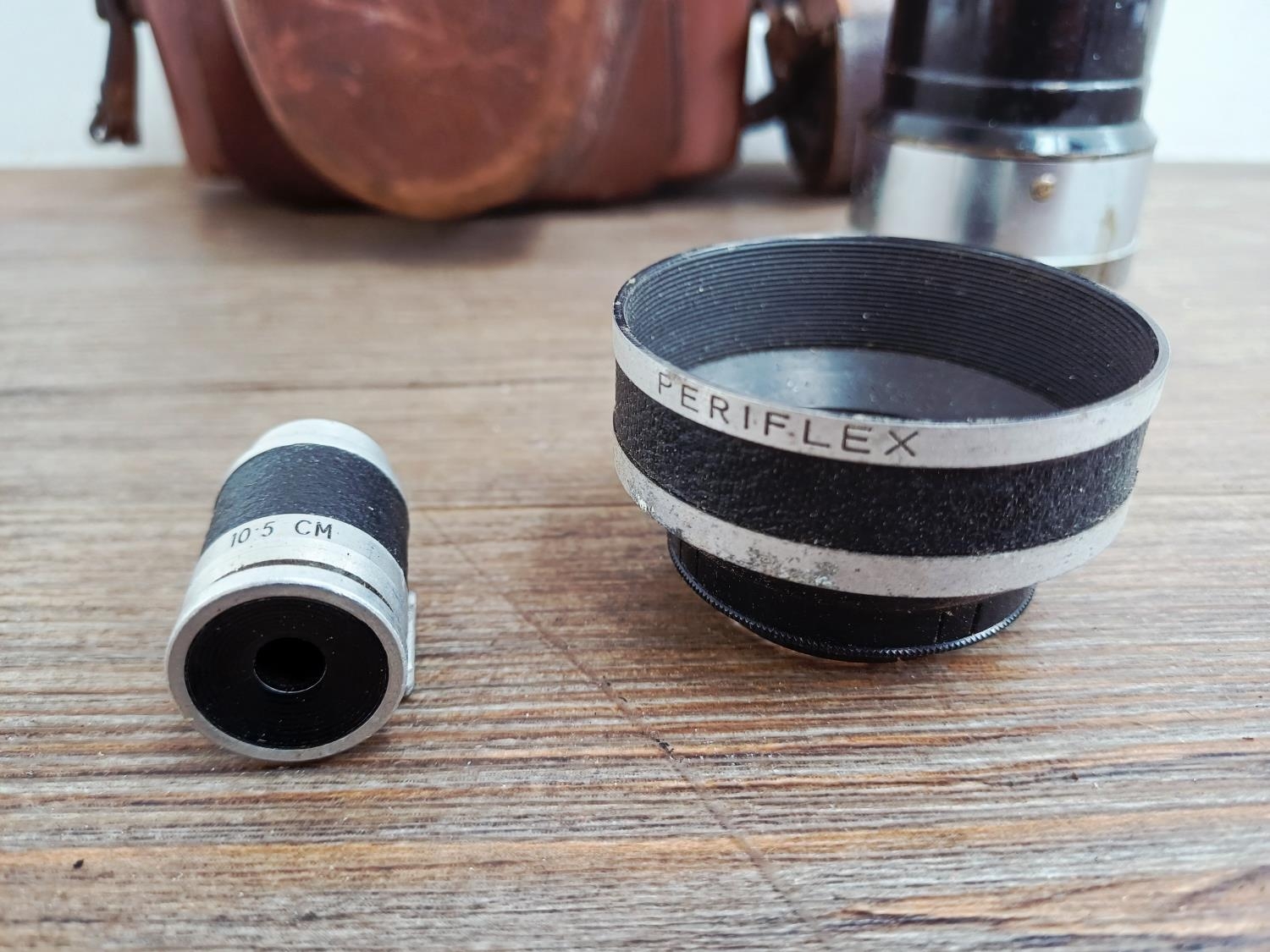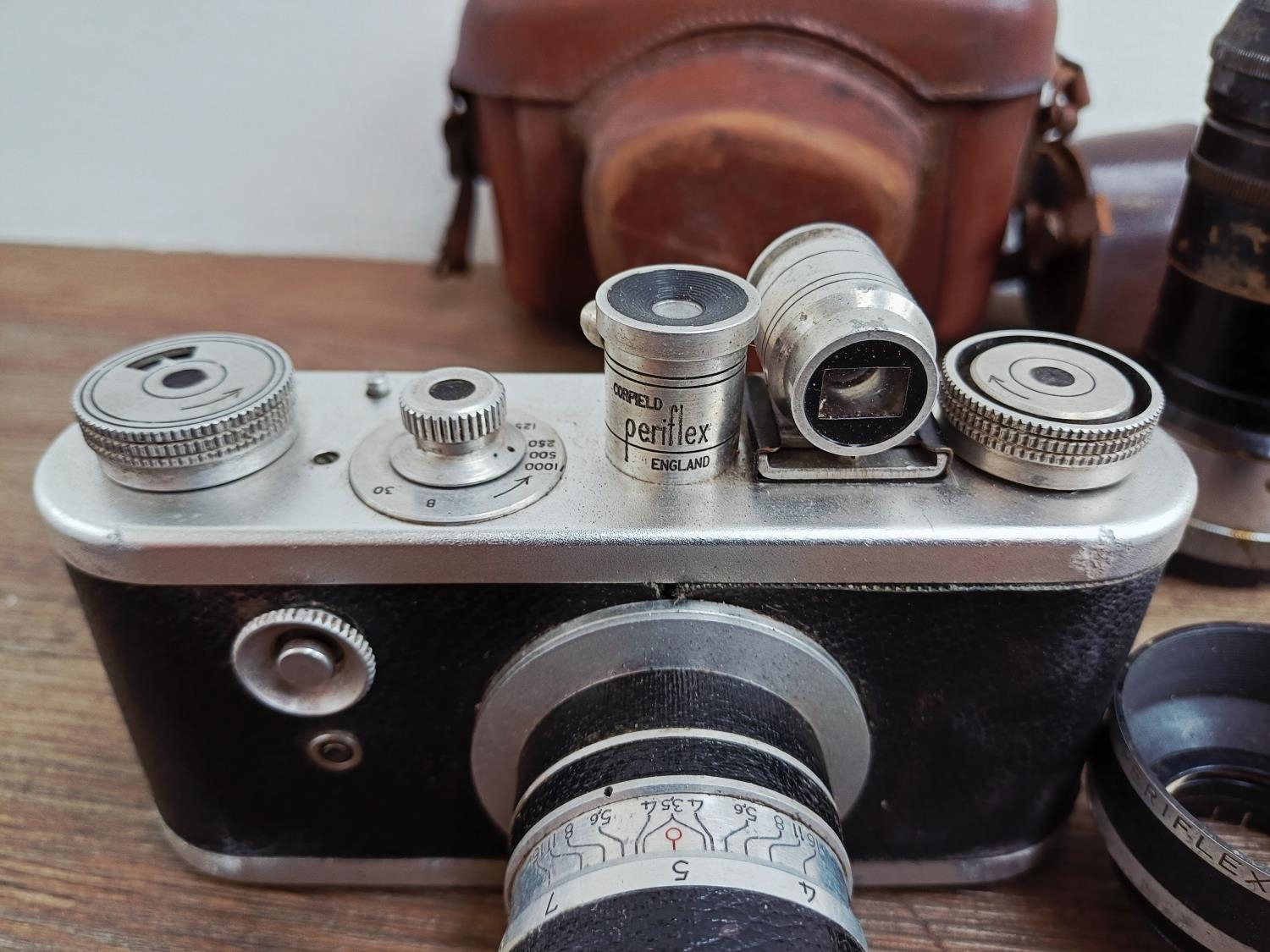 A cased 1950s K.G. Corfield Ltd. Periflex (third version) M39-mount 35mm viewfinder camera fitted with Lumar-x 1:3.5 50mm lens with Trinol Anastigmat 1:3.5 105mm lens