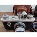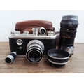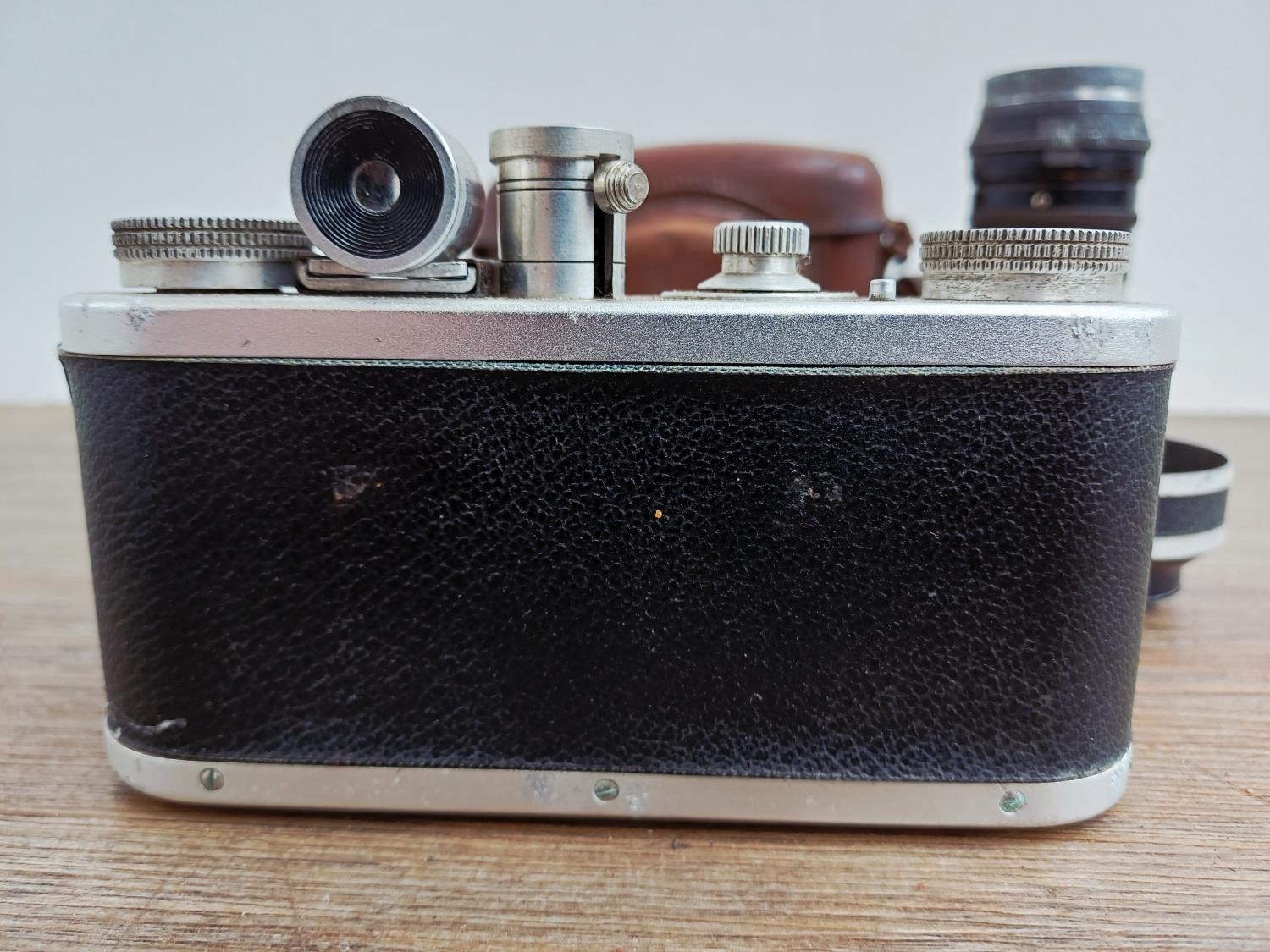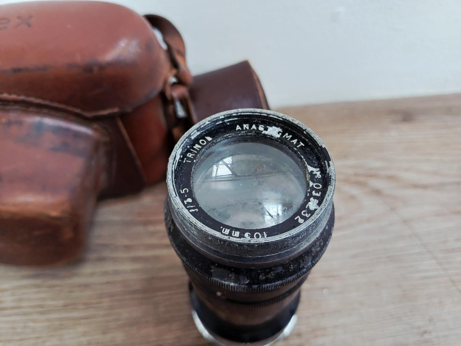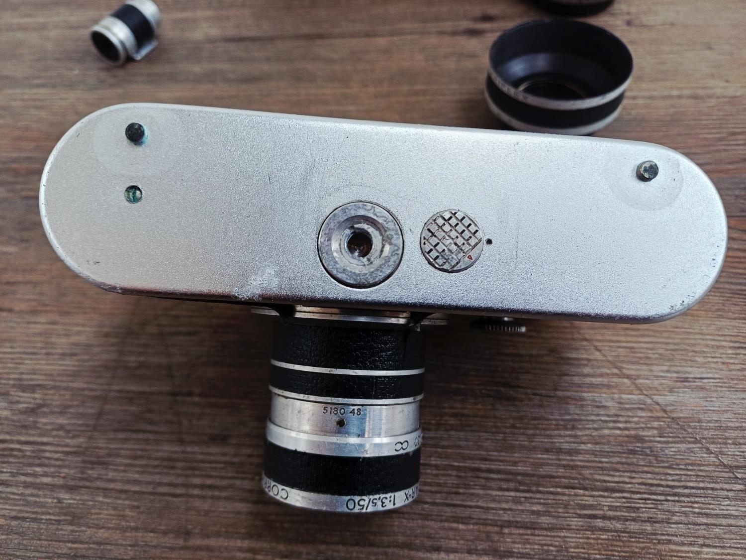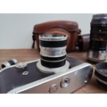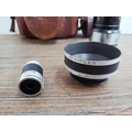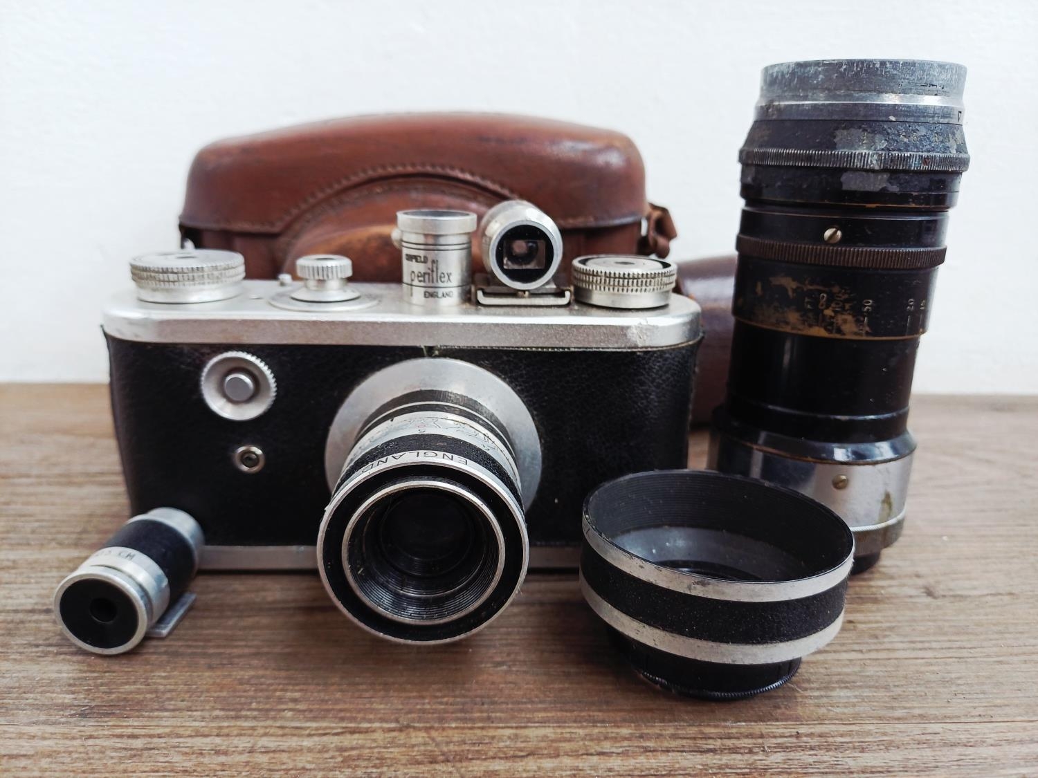 A cased 1950s K.G. Corfield Ltd. Periflex (third version) M39-mount 35mm viewfinder camera fitted with Lumar-x 1:3.5 50mm lens with Trinol Anastigmat 1:3.5 105mm lens