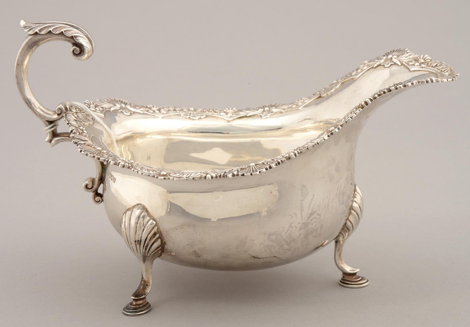 AN EDWARD VII SILVER SAUCE BOAT, THE RIM APPLIED WITH SCALLOP SHELLS AND SCROLLING FOLIAGE, LEAF CAPPED FLYING SCROLL HANDLE, ON HOOF FEET, 20CM L, BY J. DIXON & SONS LTD., SHEFFIELD 1908, 11OZS 8DWTS