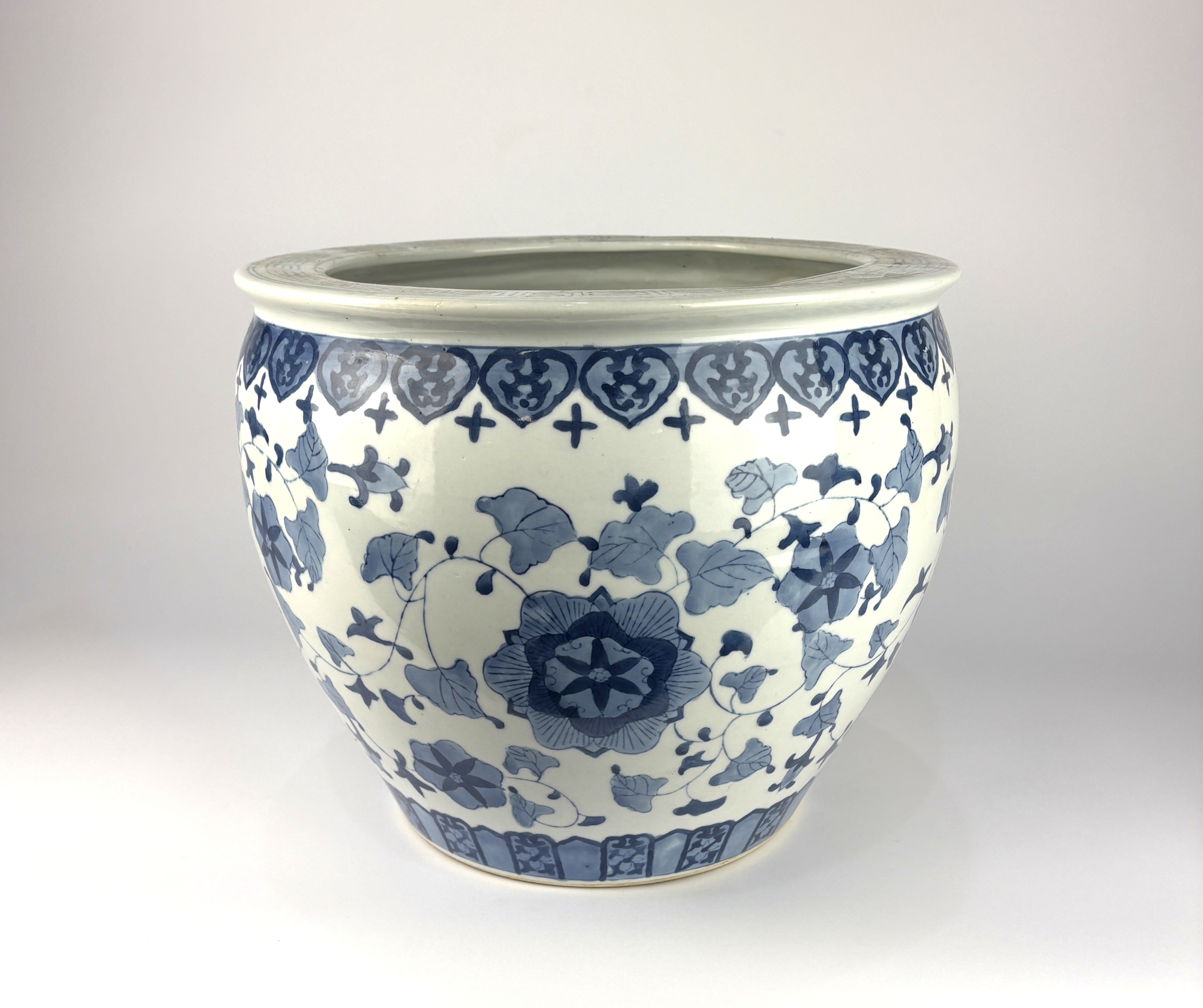 A modern Asian style blue and white ceramic jardiniere with foliate decoration 30cm high, 35.5cm diameter