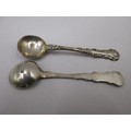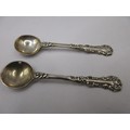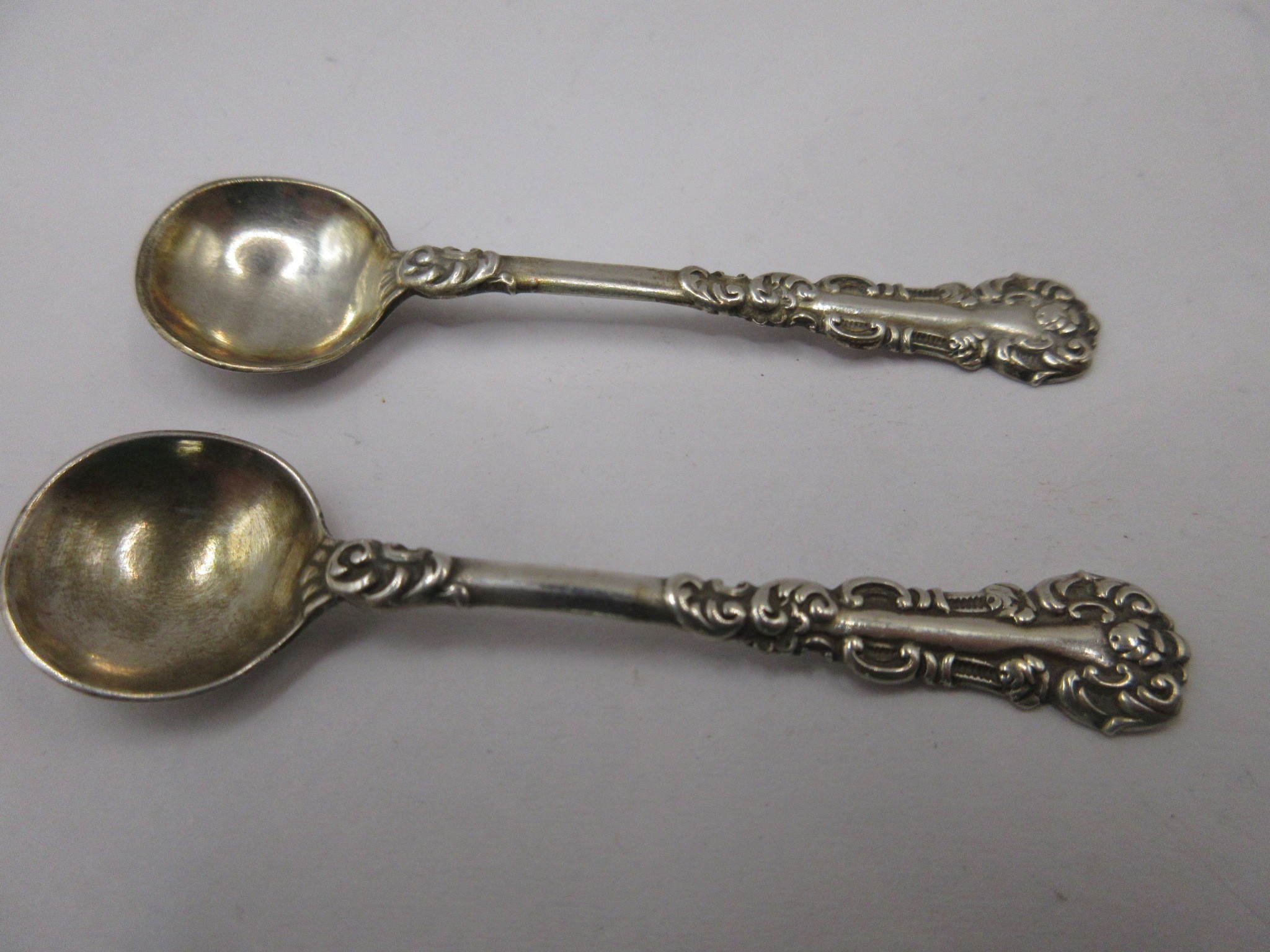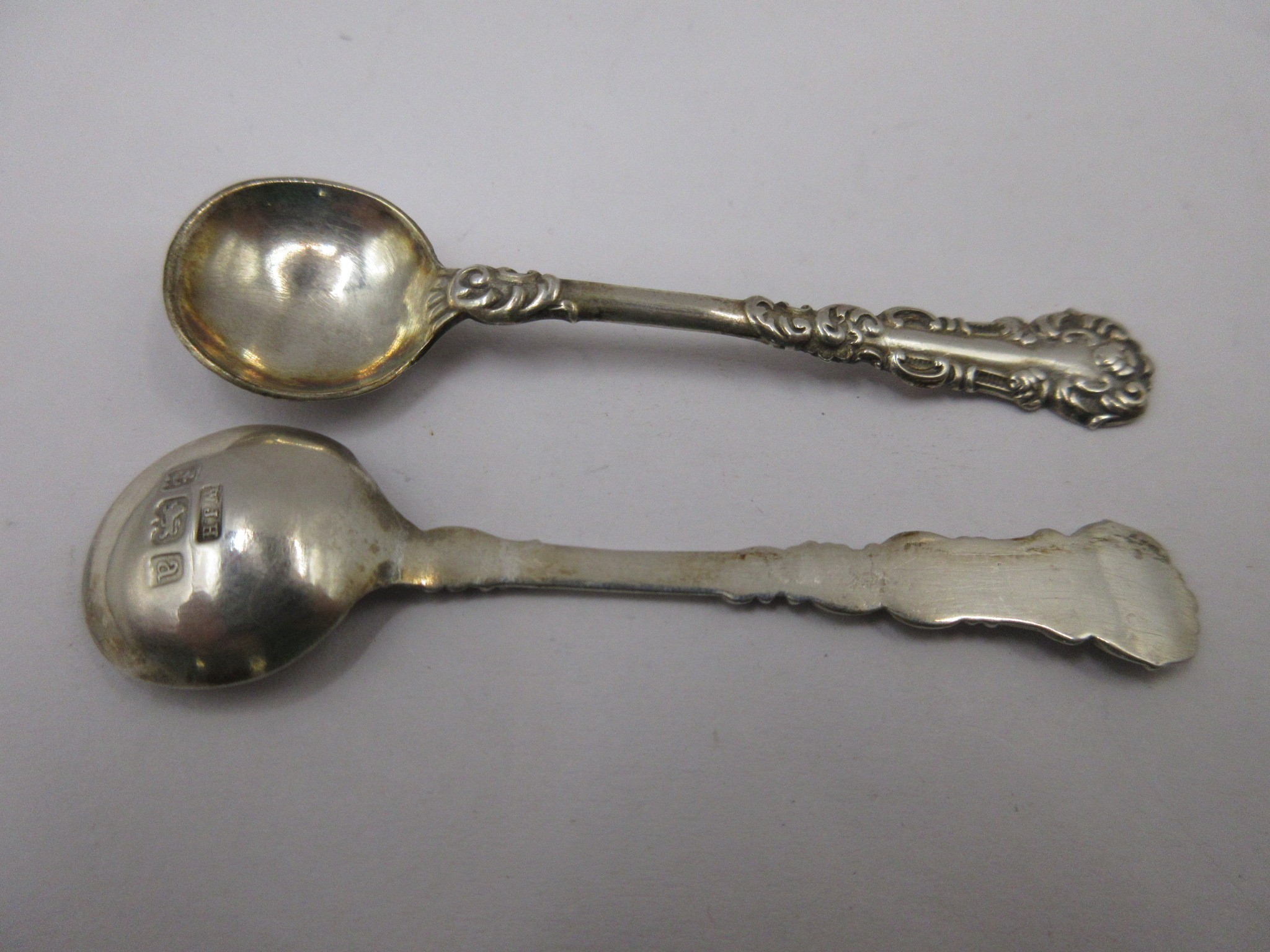 A pair of salt spoons with ornate scrolled stems, each marked for Birmingham, 1900, William J Holmes. Combined weight of the two salt spoons together approx. 8.4g