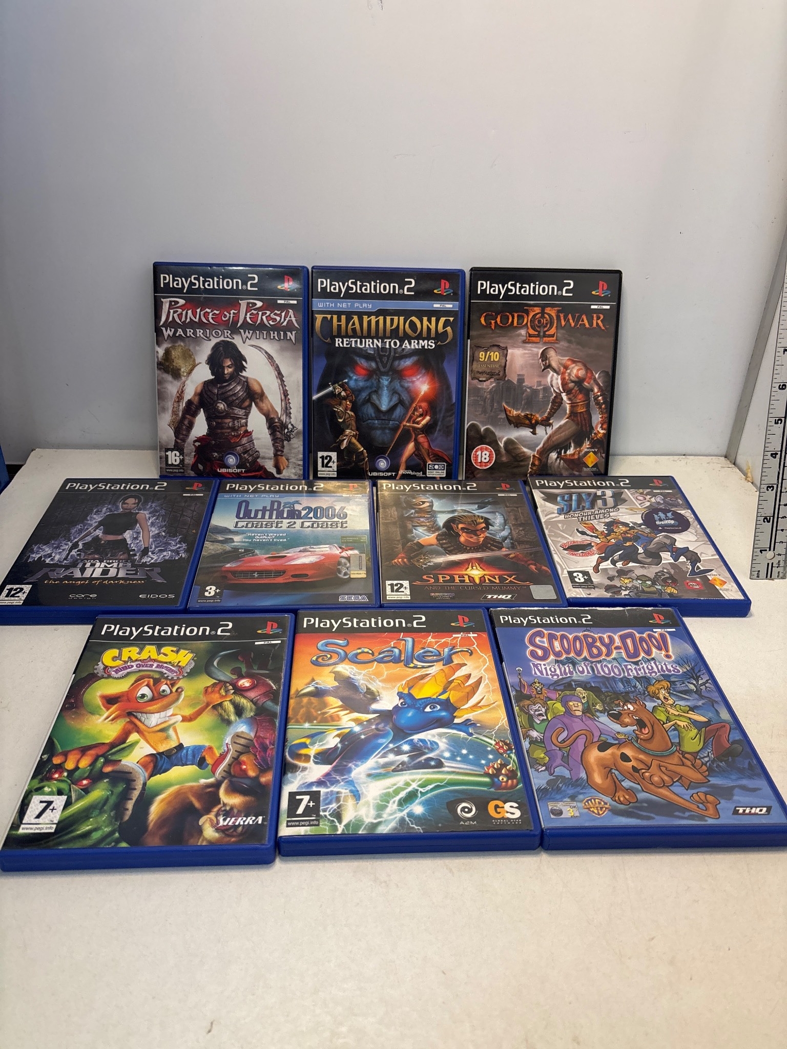 9 PlayStation 2 video games including titles like Prince of Persia, Champions Return to Arms, God of War, Juiced 2, Shadowman, Spyro, and more. Cases and artwork included; condition of discs not specified.
